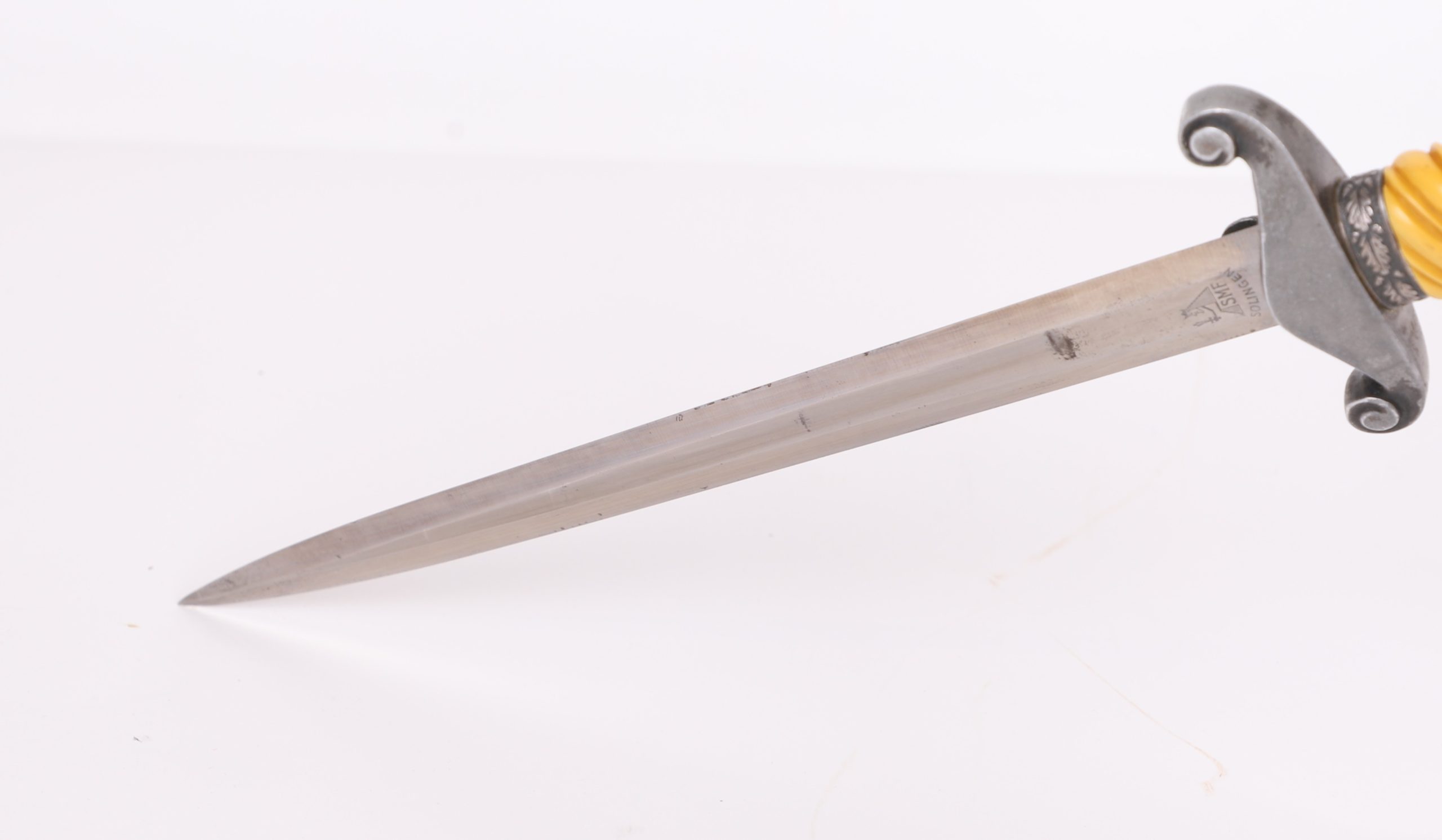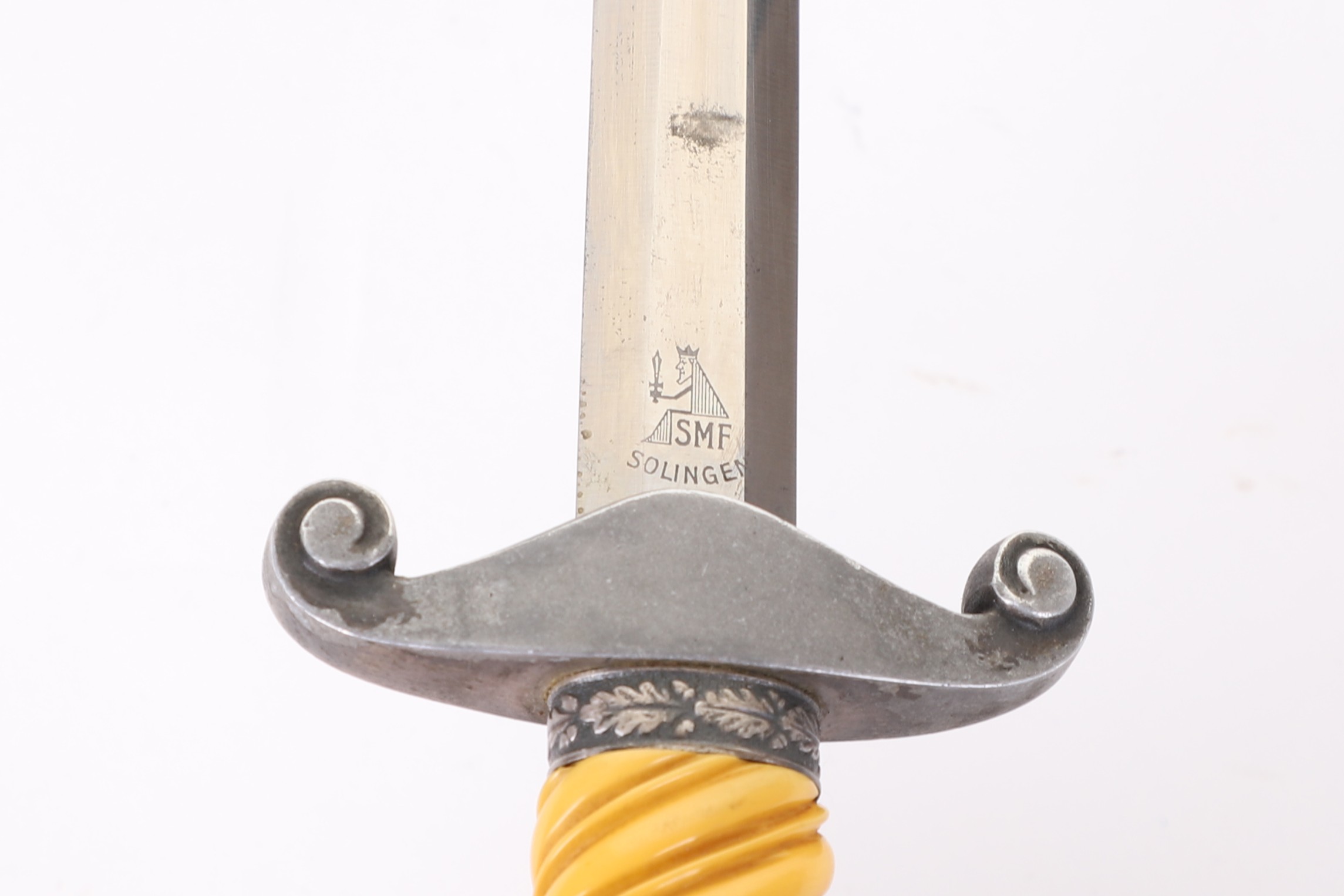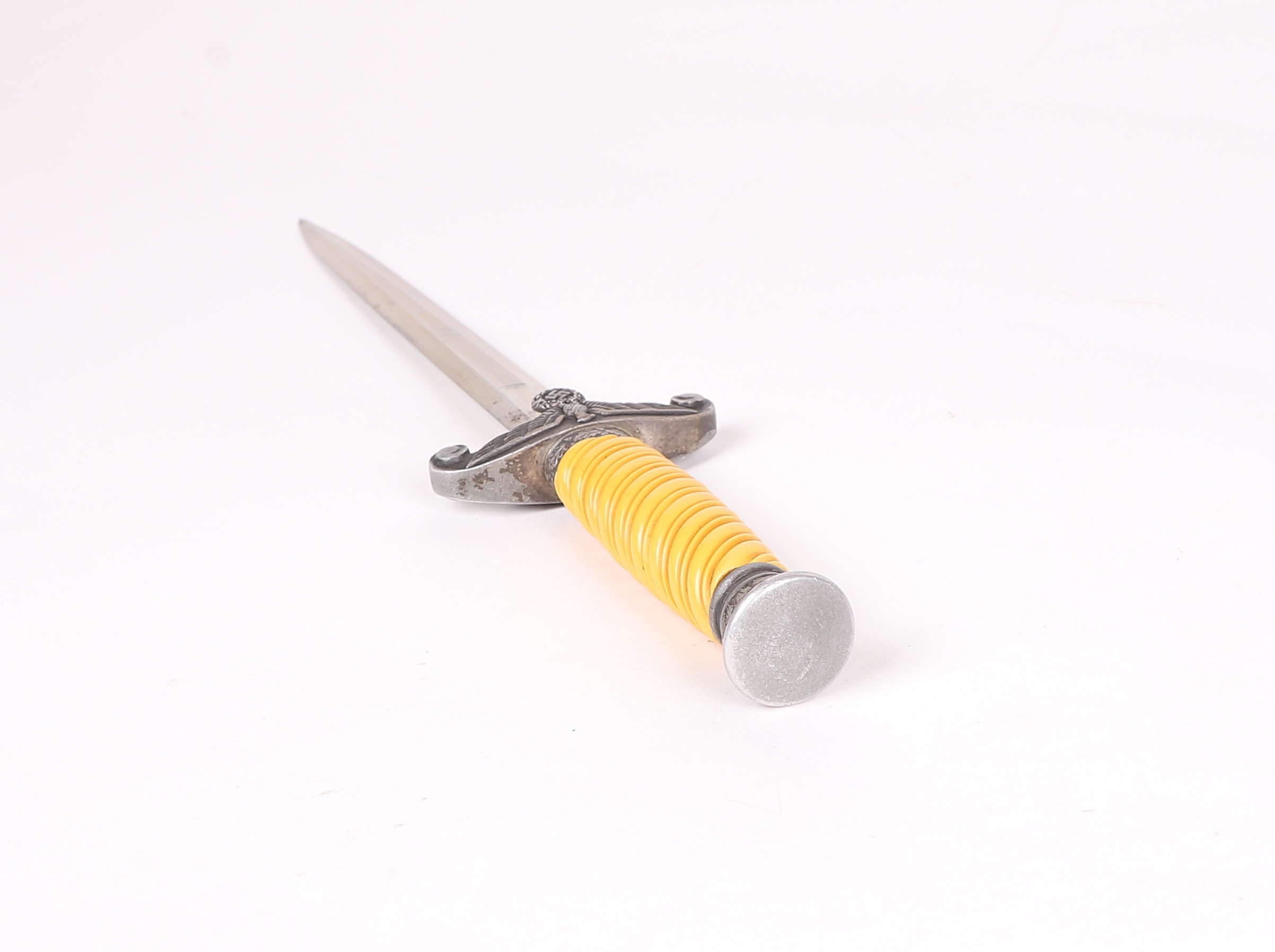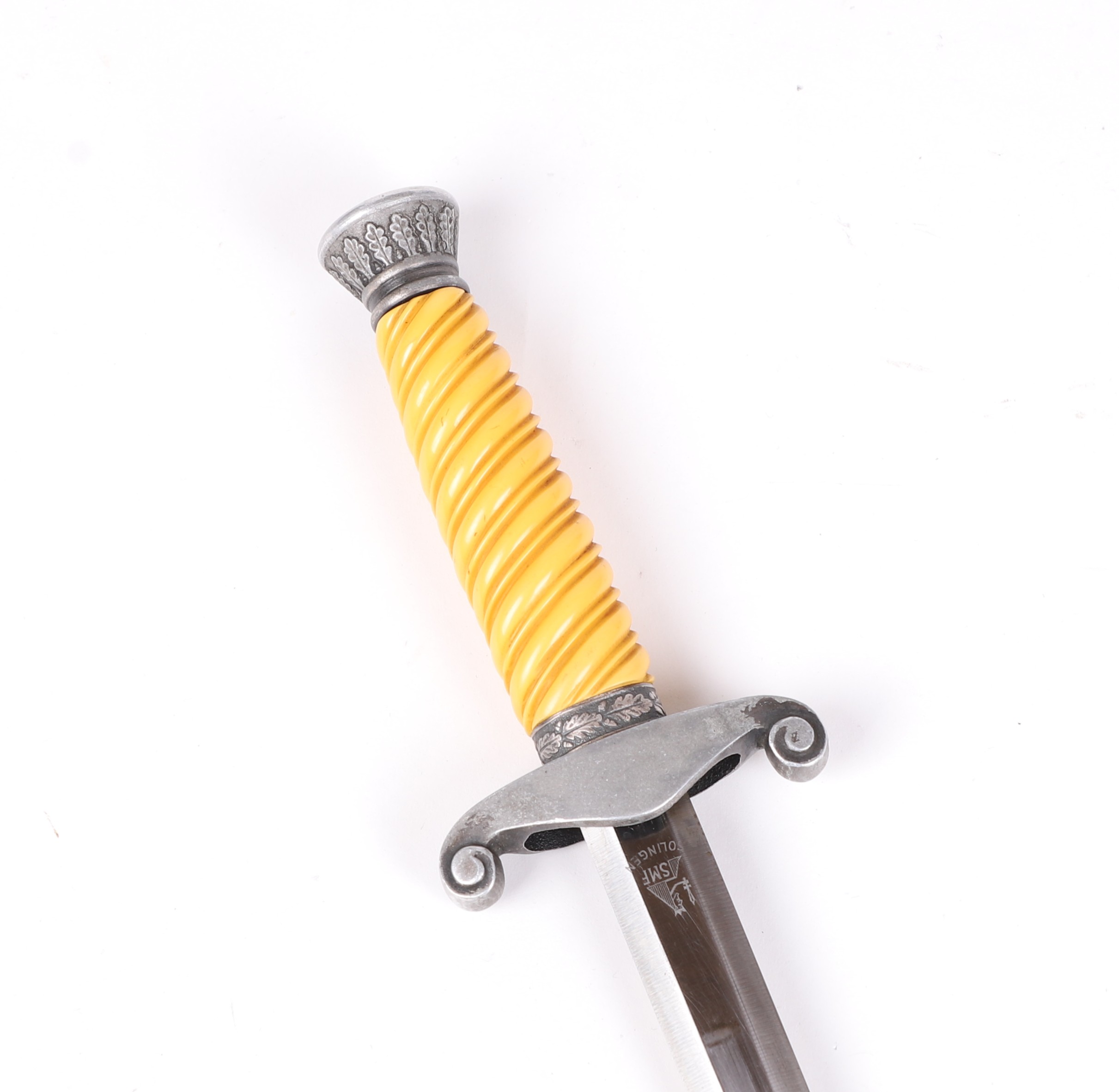 Very rare aluminum model by SMF. This dagger features all aluminum pommel and cross guard which have amazing dark burnishing to the crevices and fine detail. Blade looks great with only one small blemish above the maker mark. Scabbard is straight and shows no damage. Very seldom do you find these models and very rare they are in this condition.