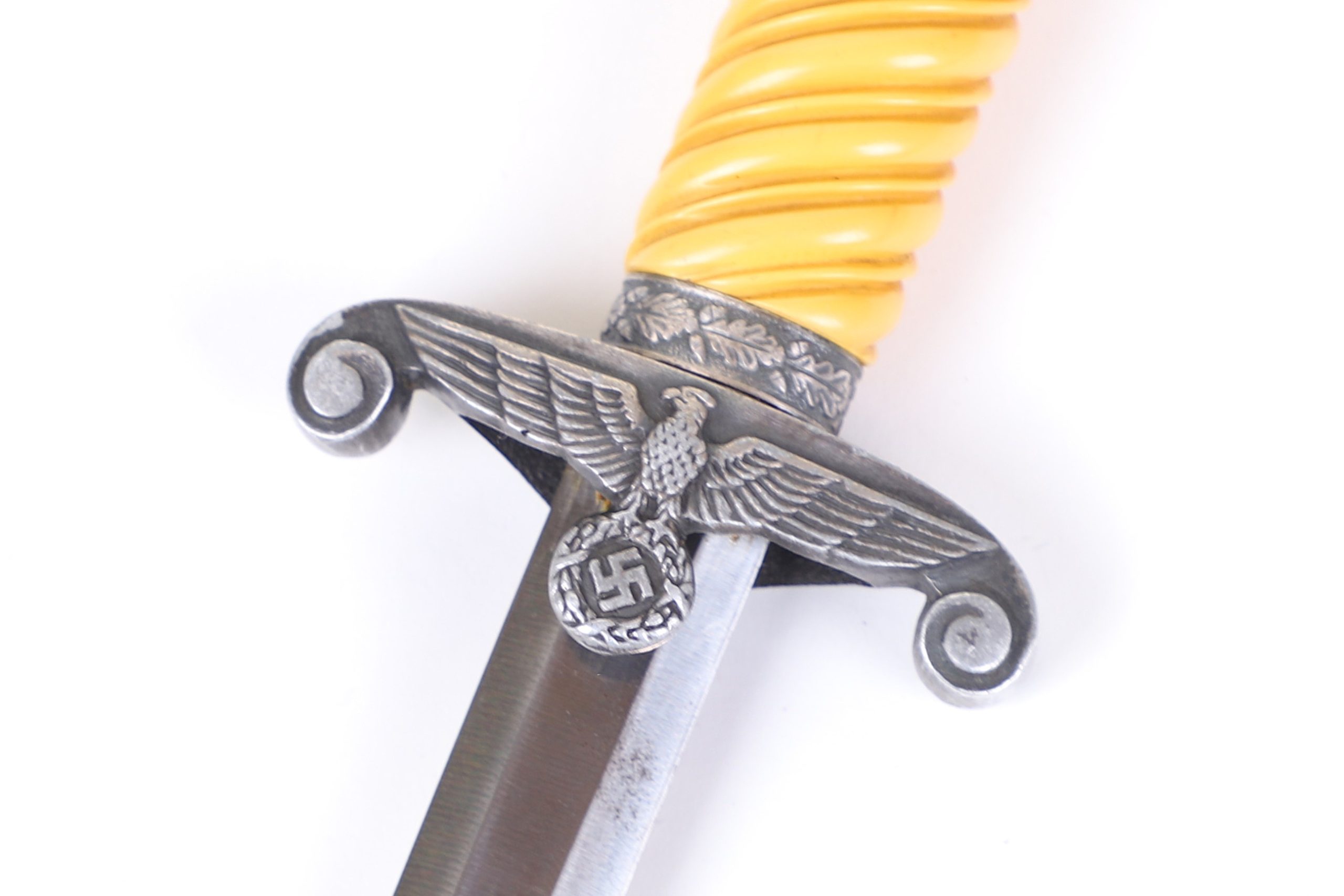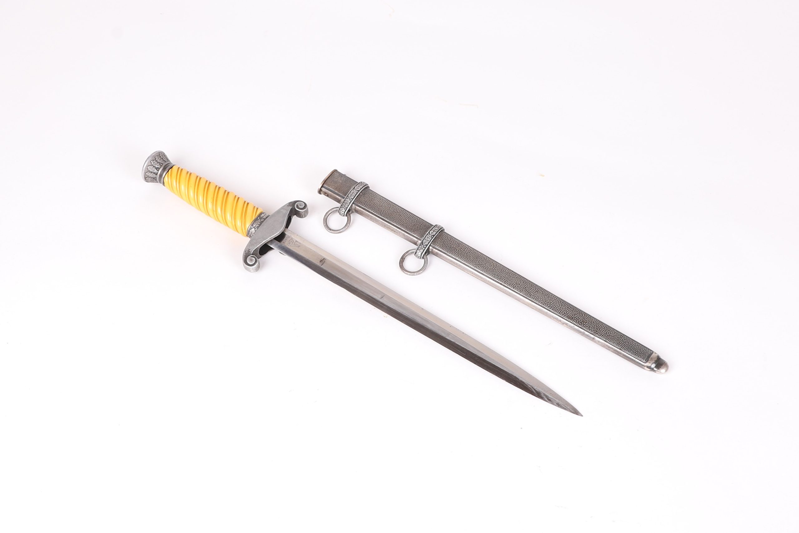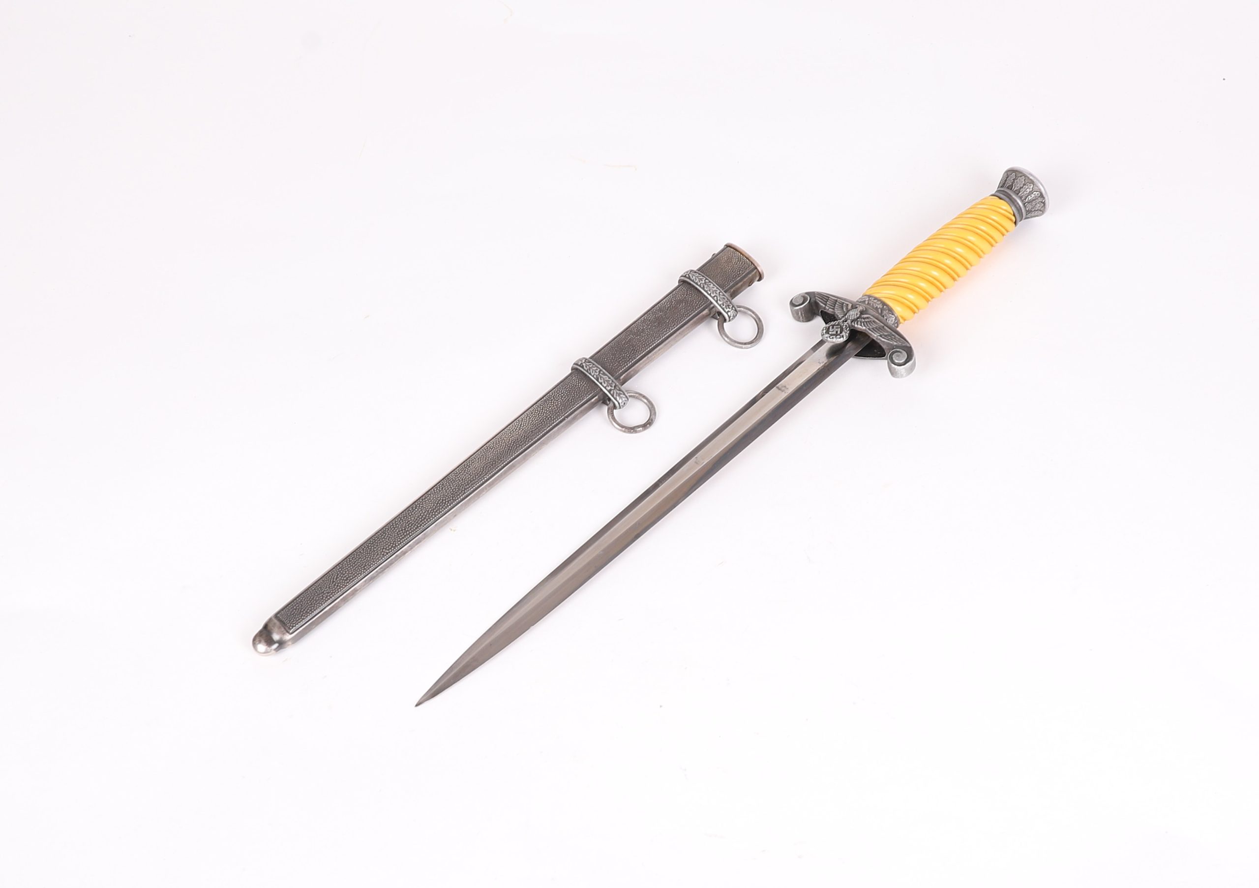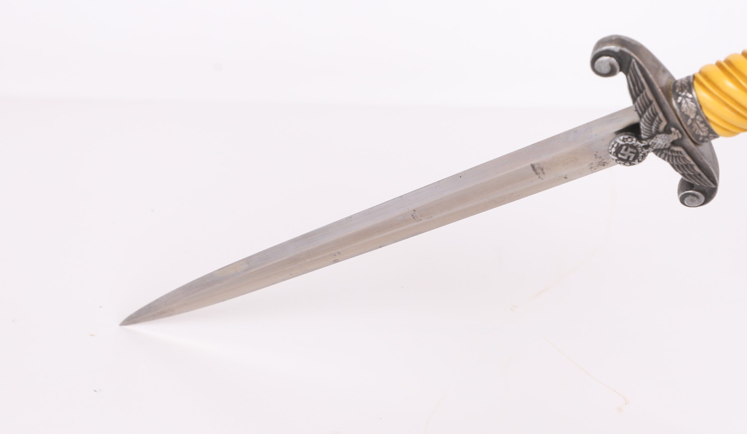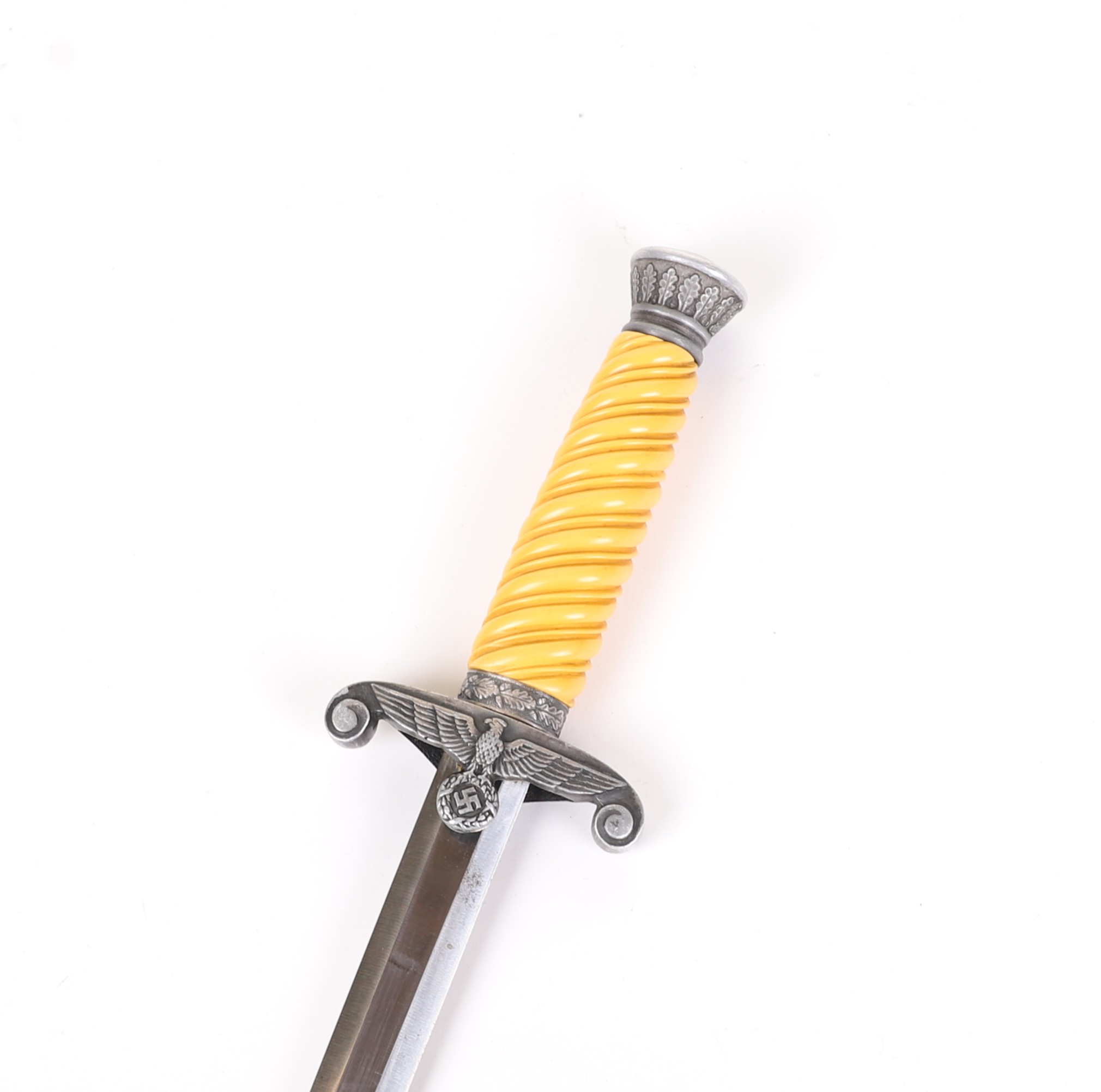 Very rare aluminum model by SMF. This dagger features all aluminum pommel and cross guard which have amazing dark burnishing to the crevices and fine detail. Blade looks great with only one small blemish above the maker mark. Scabbard is straight and shows no damage. Very seldom do you find these models and very rare they are in this condition.