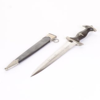 This beautiful land customs dagger has nearly all 100% original cross graing. All aluminum fittings are very nice and the wire on grip is nice a tight. Has only very slight wear to leather, but overall very clean. The scabbard fittings are bright with only a few minimal marks. Getting hard to find these daggers in this condition.