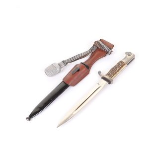 Nice condition, mid-war dagger. Has excellent leather, nice nickel silver fittings, blade is bright and clean with much of its cross-graining. It has an original washer, tight wire wrap with later aluminum chain.