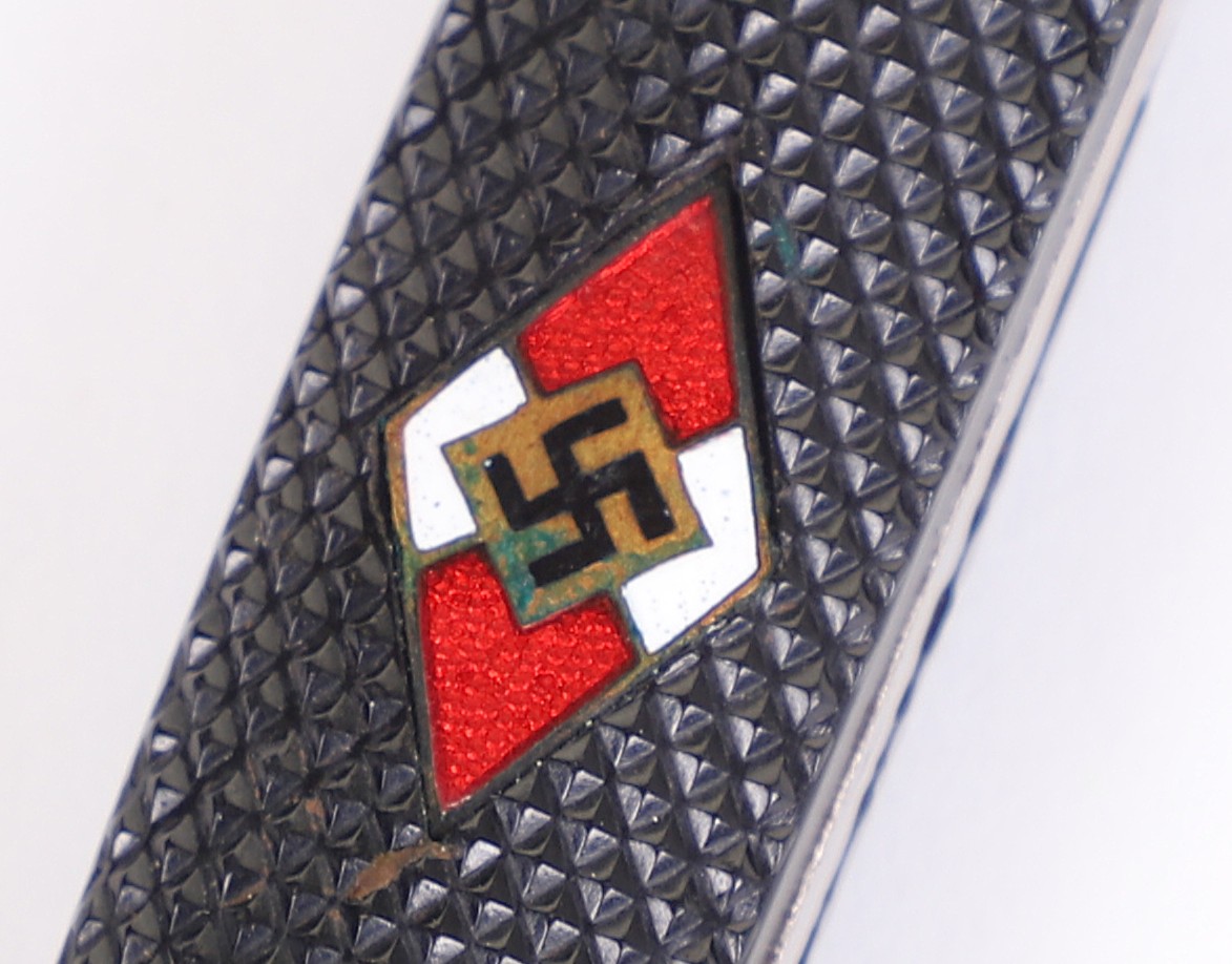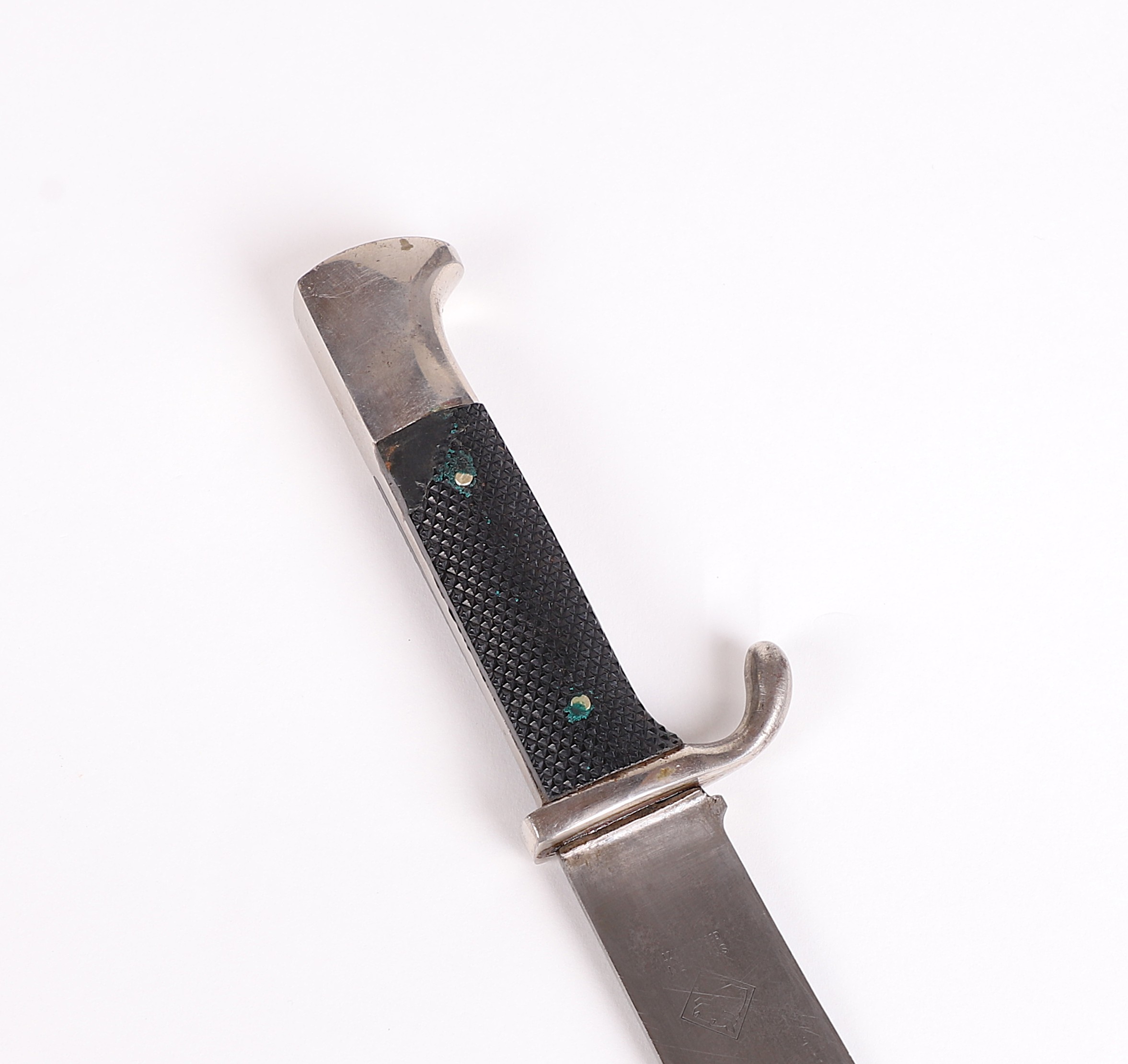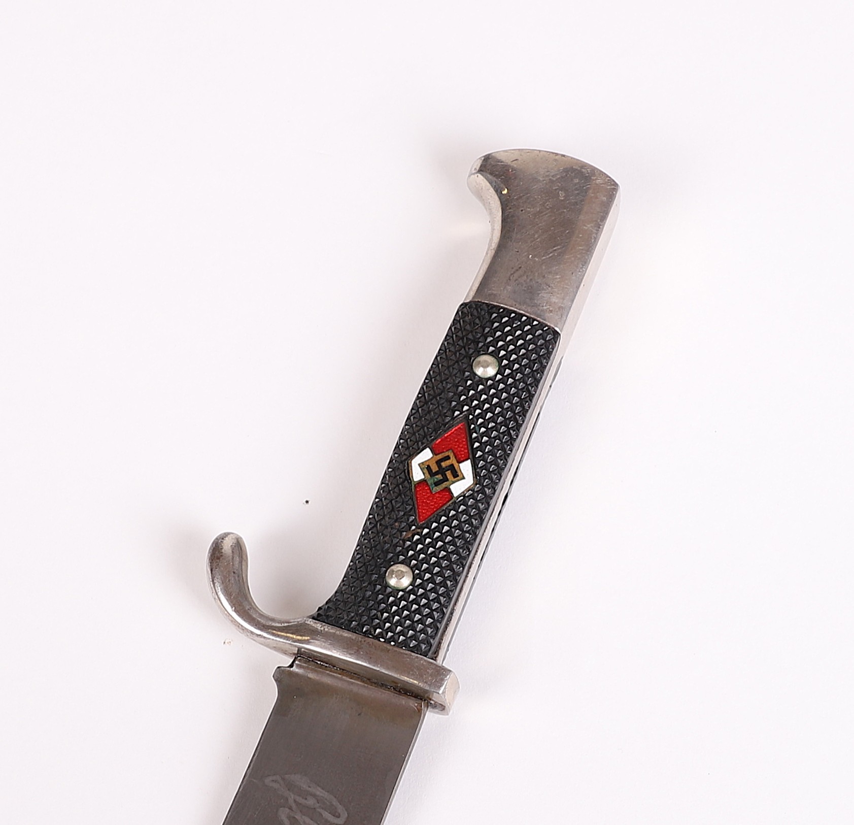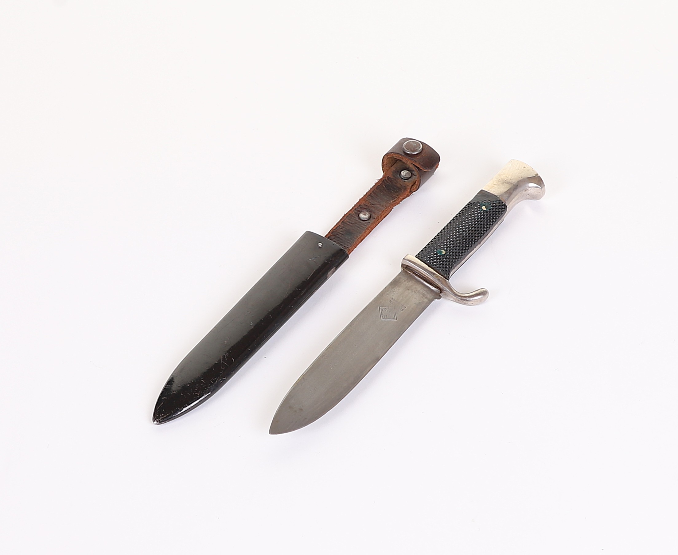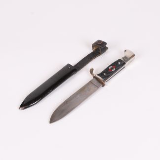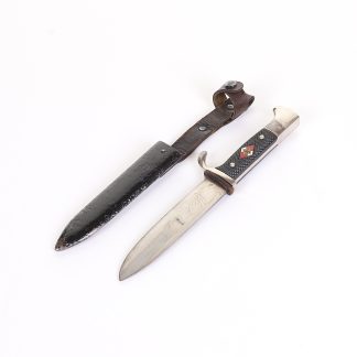 Very early model HJ knife with the slab style blade and motto. Motto is a bit faint, but still visible and the blade shows normal expected wear. To the front of the grip is a near perfect HJ diamond and the back at the top shows a repair of some sort done at one point in its life, but it was done very well. Scabbard has original paint and supple leather with no breaks. Hard to find these type HJ knives out there.