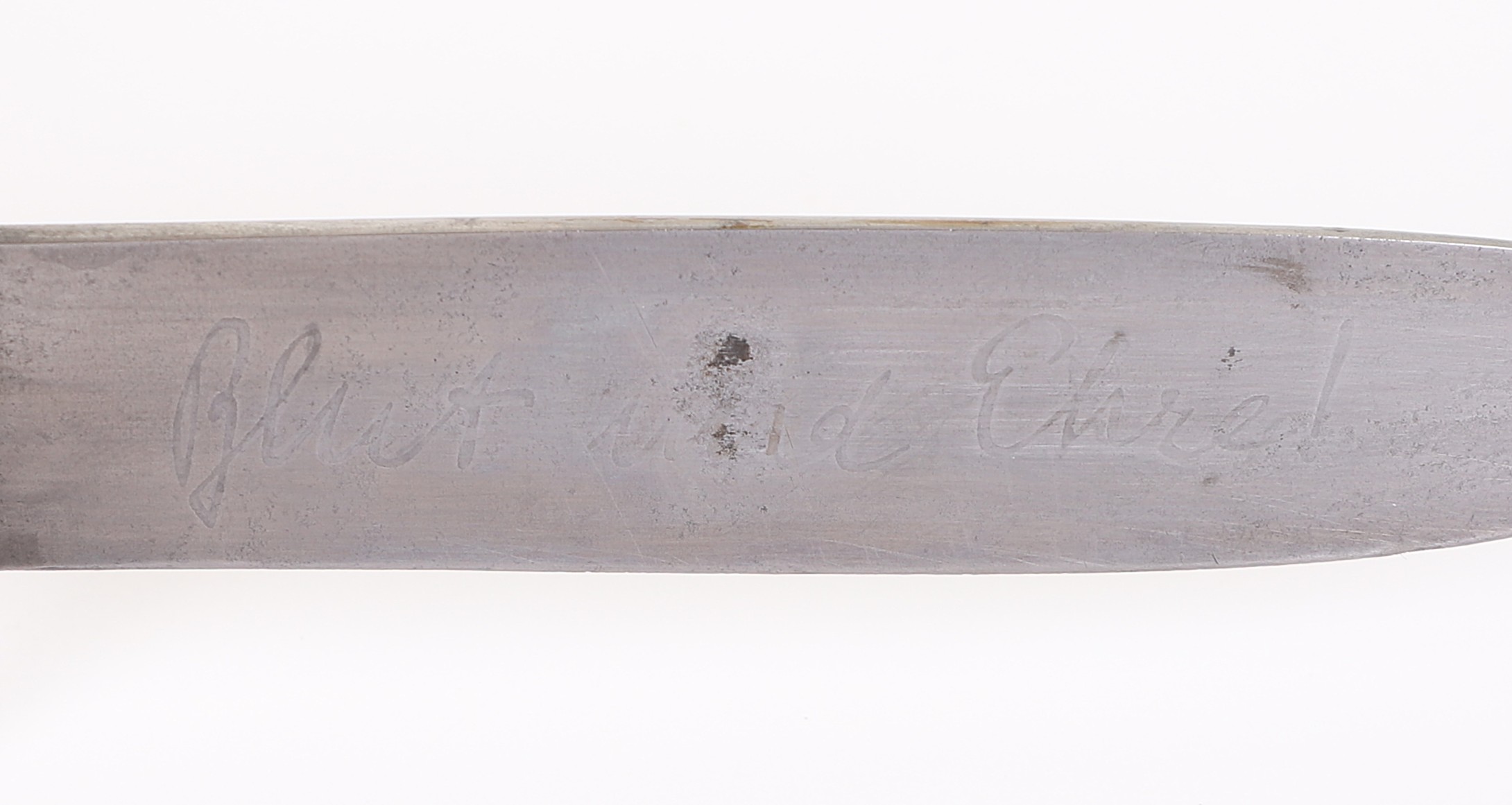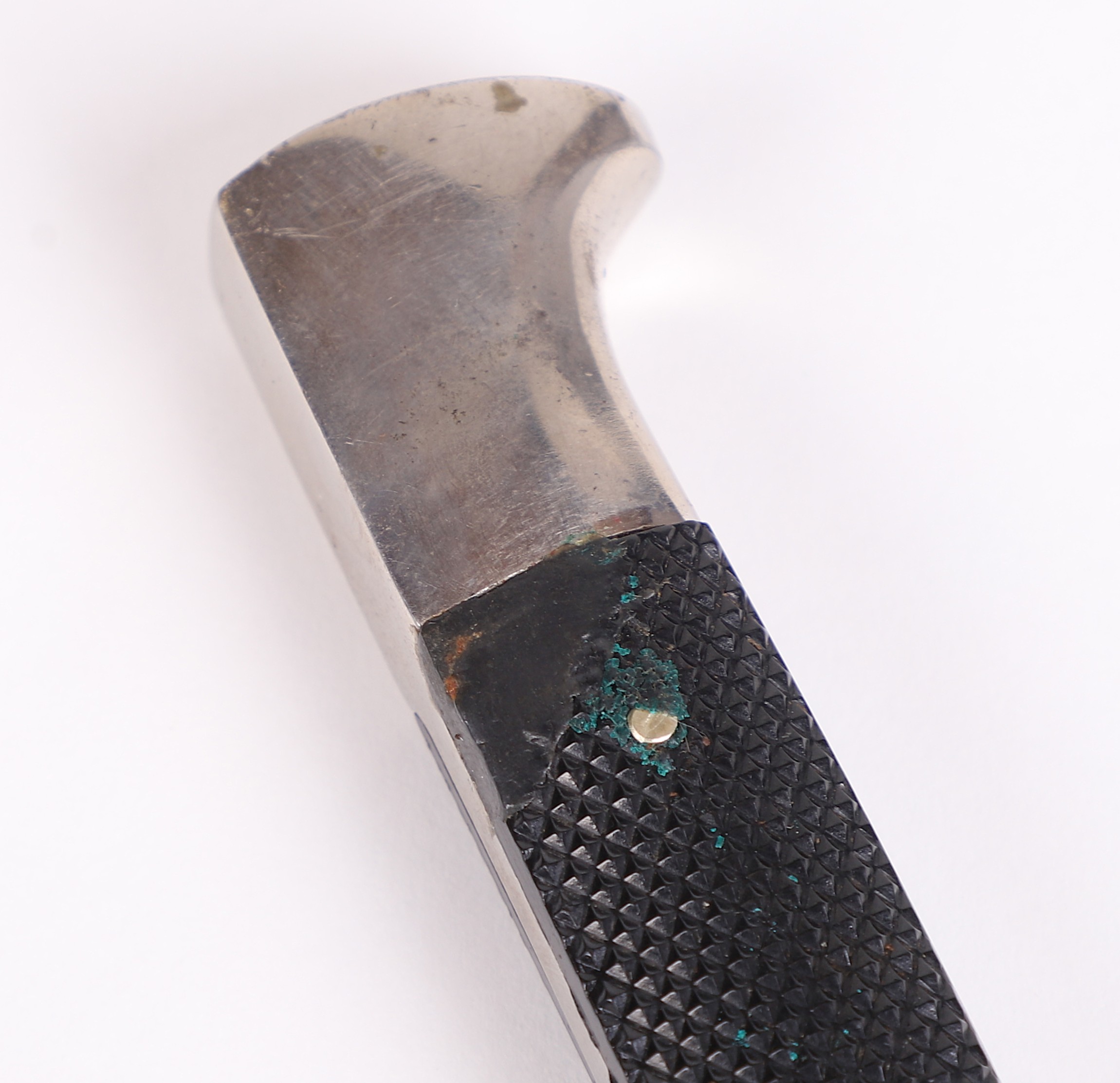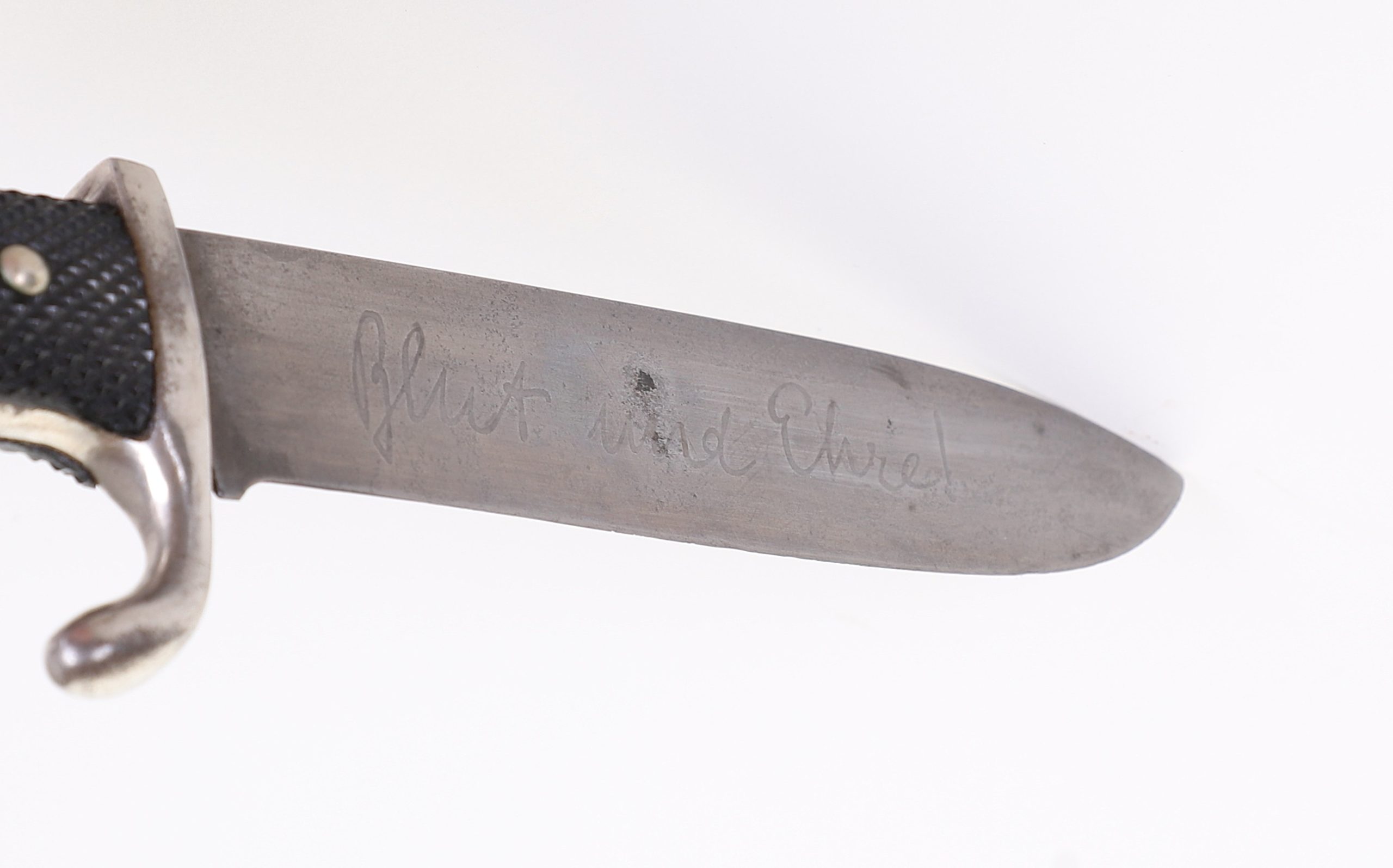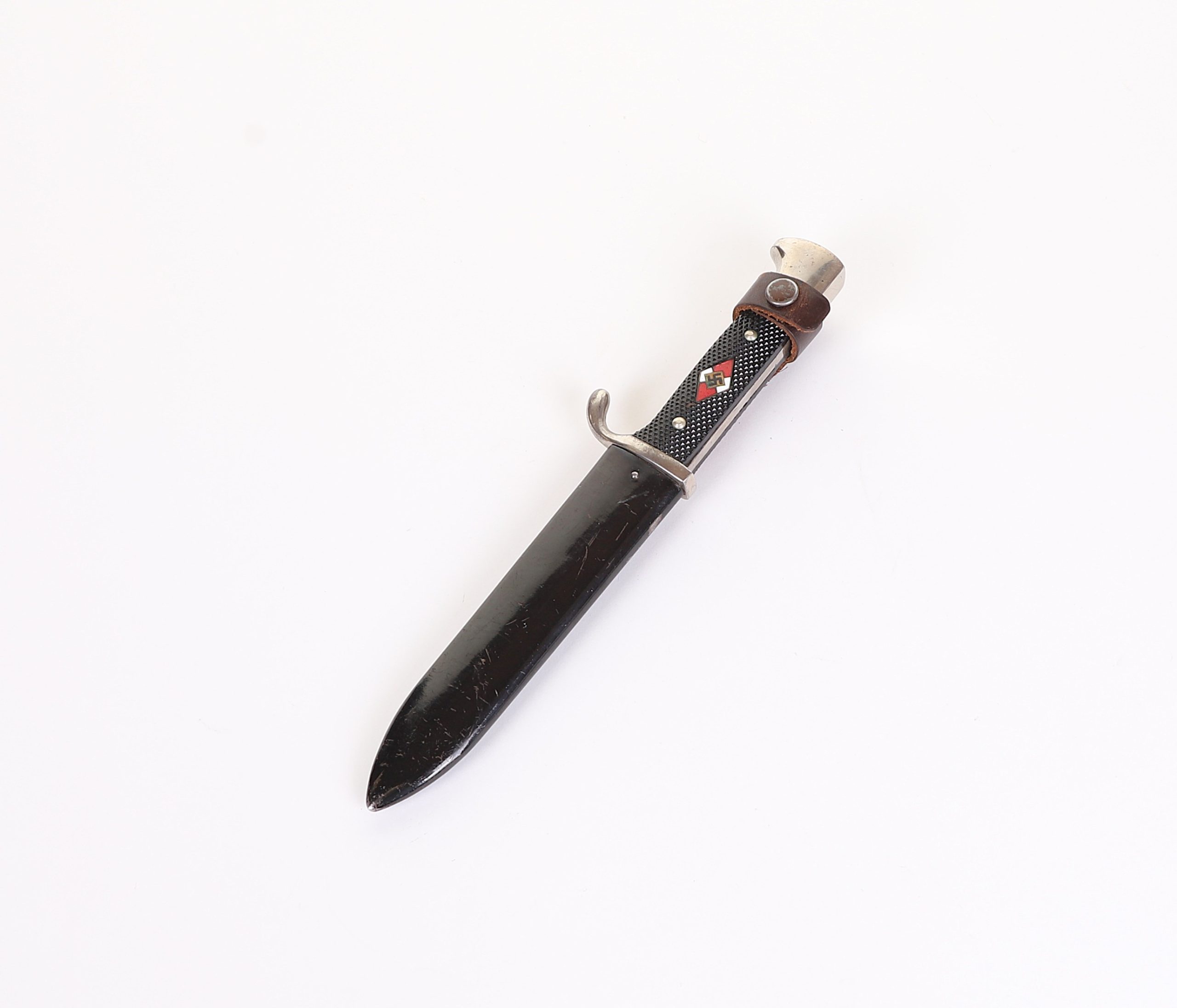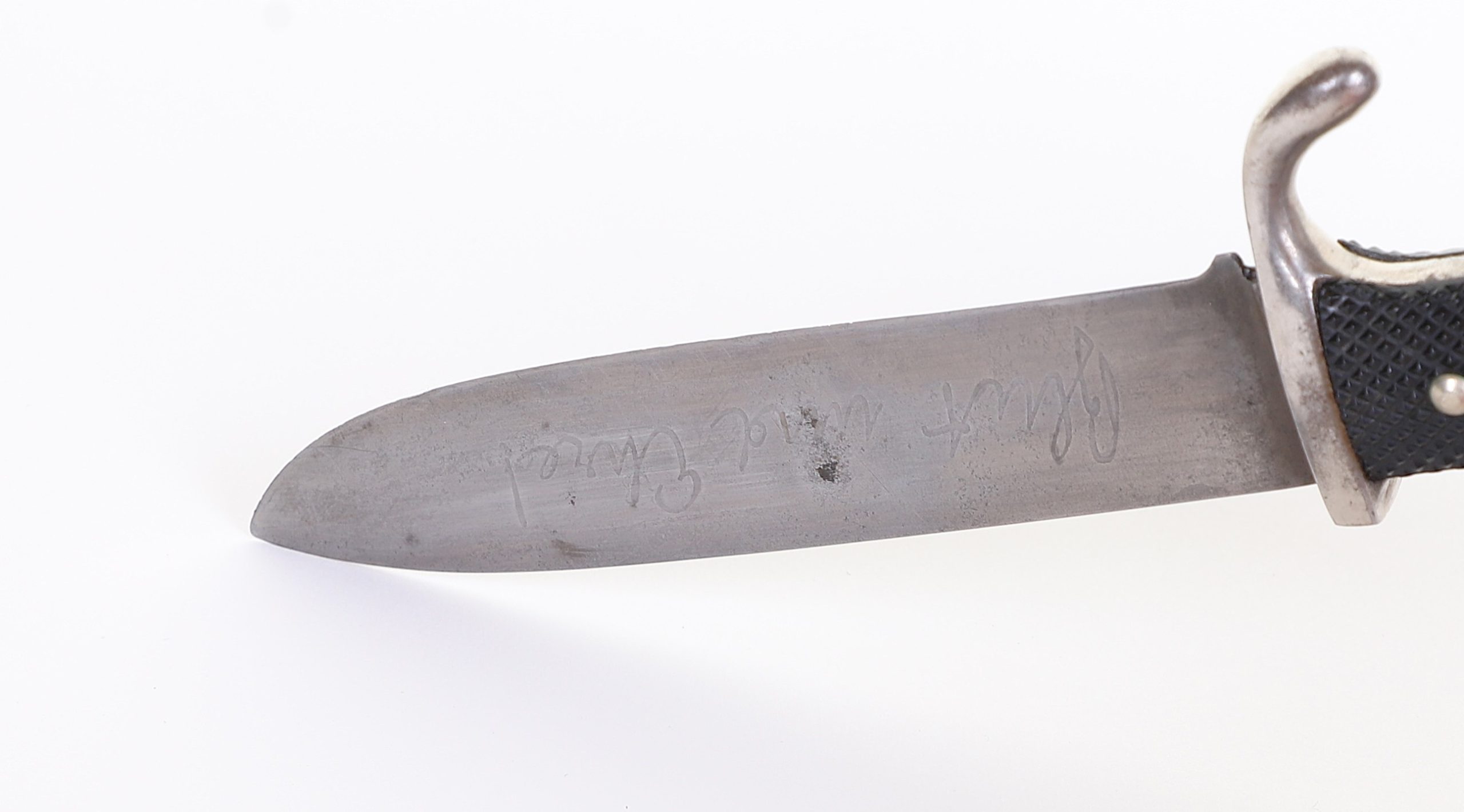 Very early model HJ knife with the slab style blade and motto. Motto is a bit faint, but still visible and the blade shows normal expected wear. To the front of the grip is a near perfect HJ diamond and the back at the top shows a repair of some sort done at one point in its life, but it was done very well. Scabbard has original paint and supple leather with no breaks. Hard to find these type HJ knives out there.