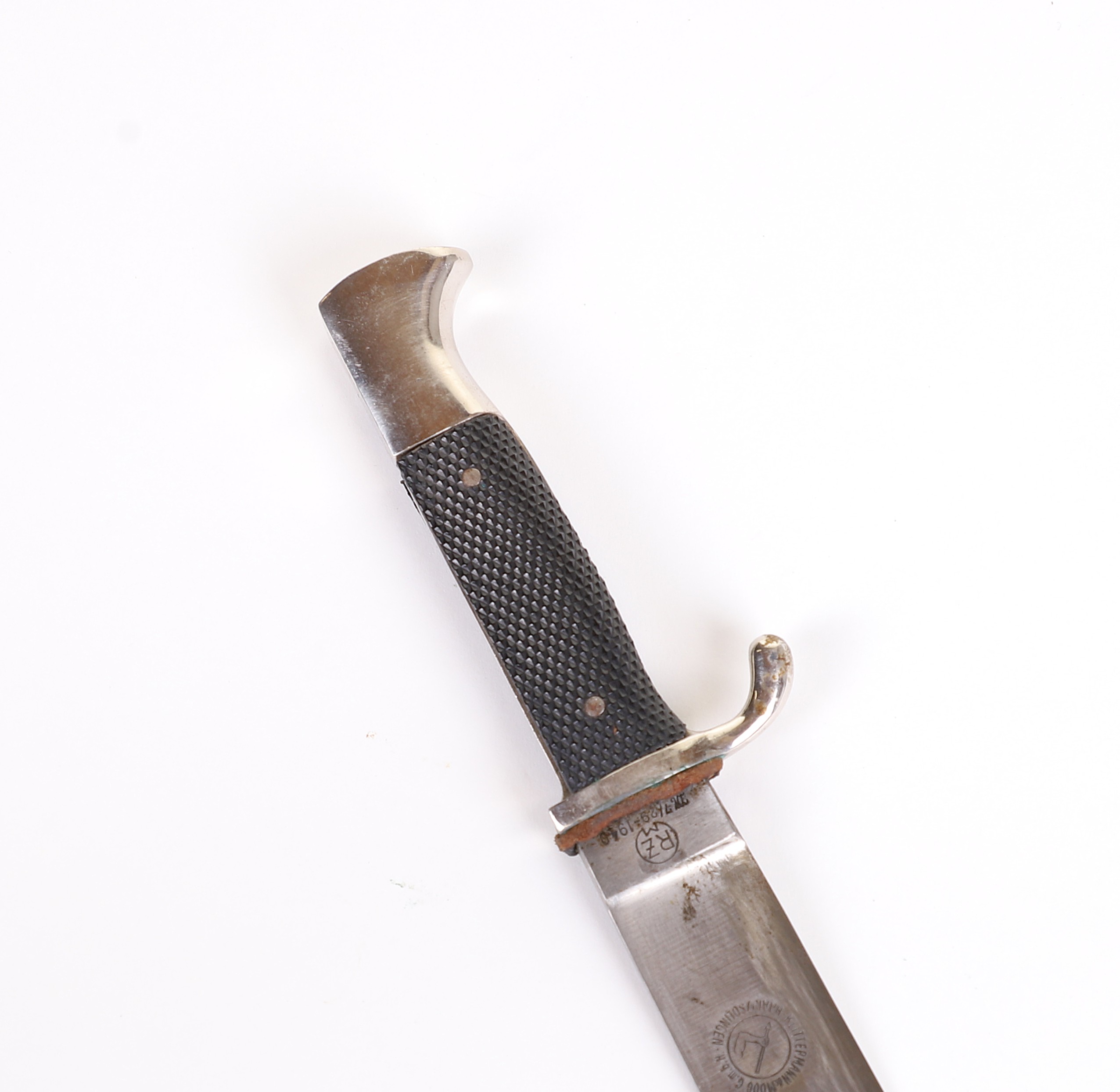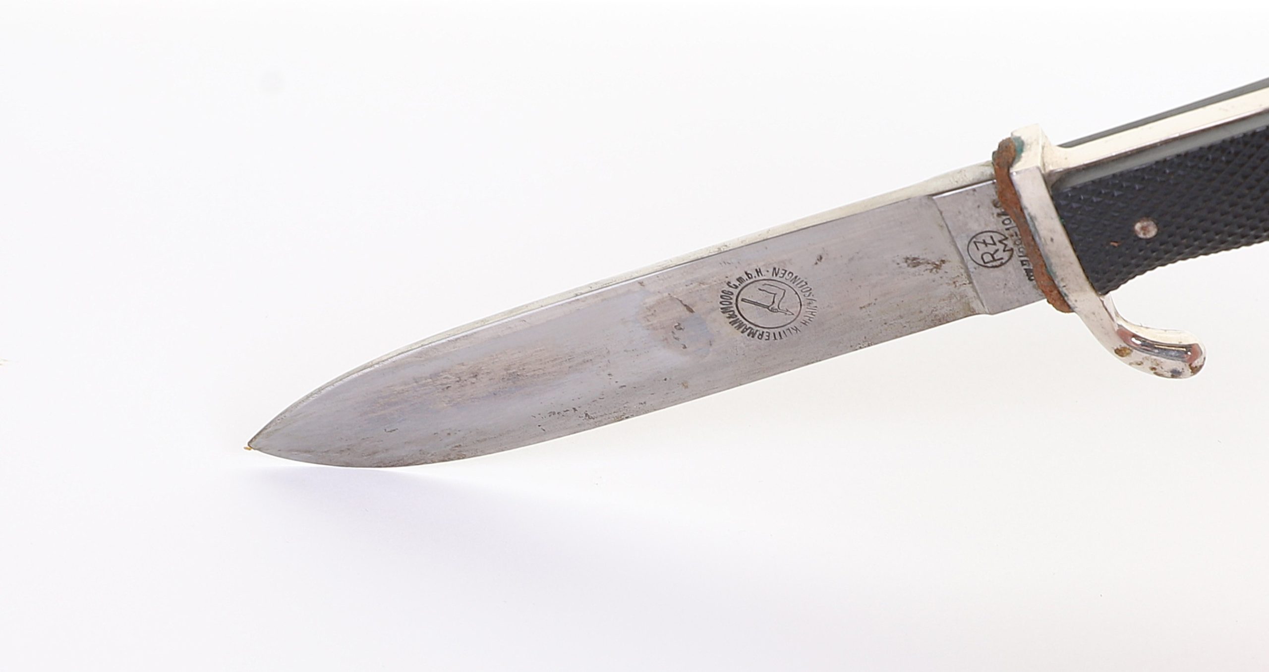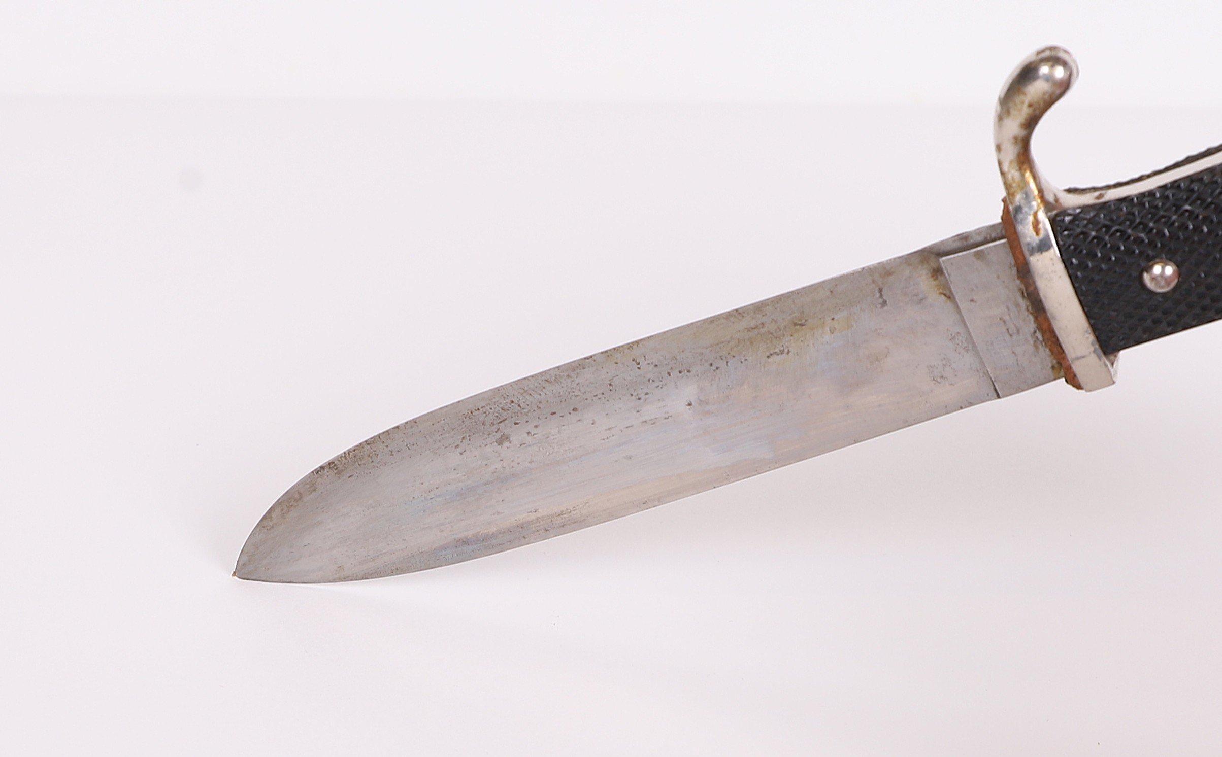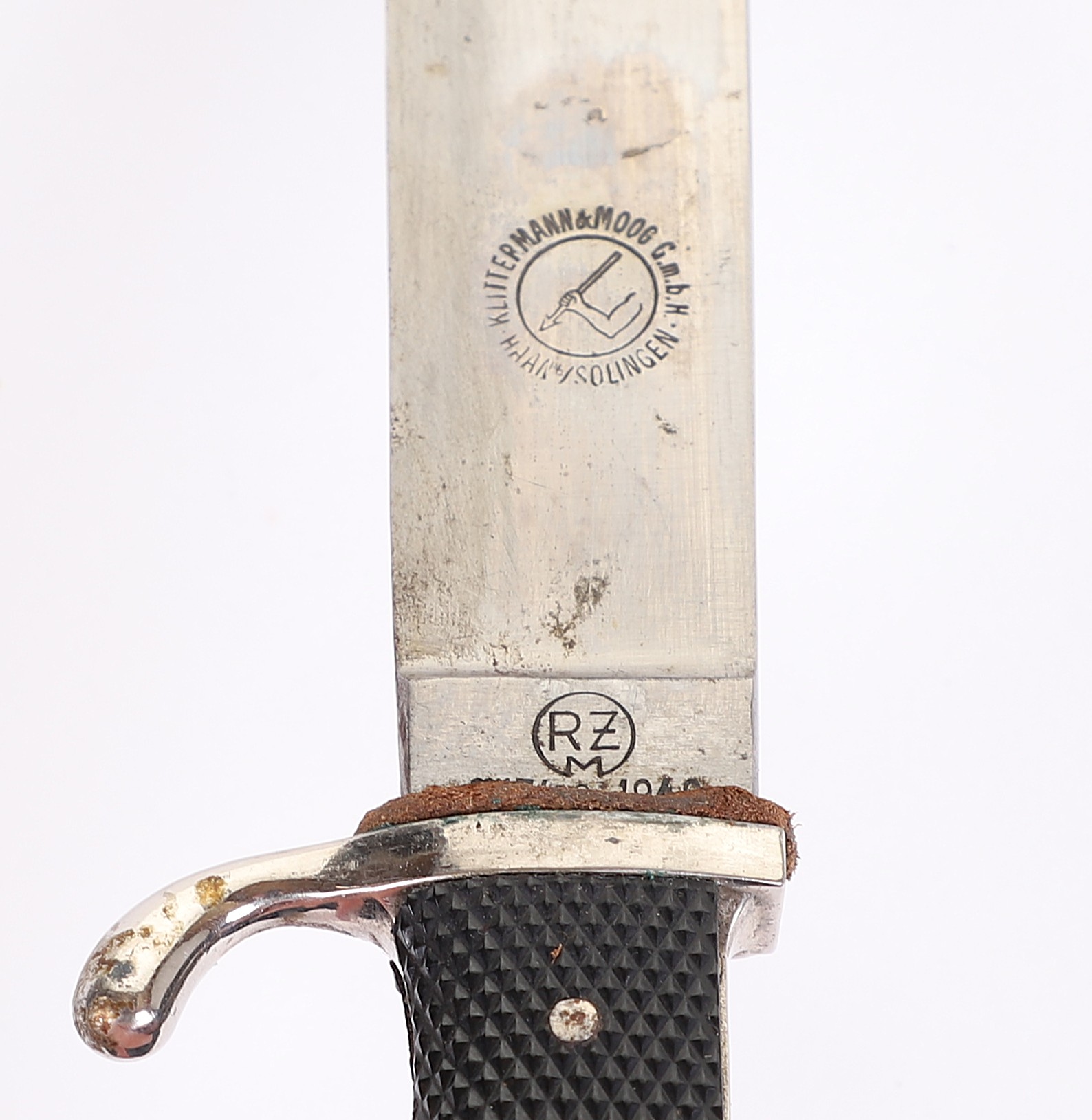 Double proofed HJ knife from the maker of Klittermann & Moog. Blade shows some edge sharpening and scratches, but no abuse just common use. Marked with the RZM at the base and dated 1940. Grip looks good and the HJ diamond only shows wear at the edge on the one side. Scabbard leather is supple and still intact and the scabbard shows minimal wear.