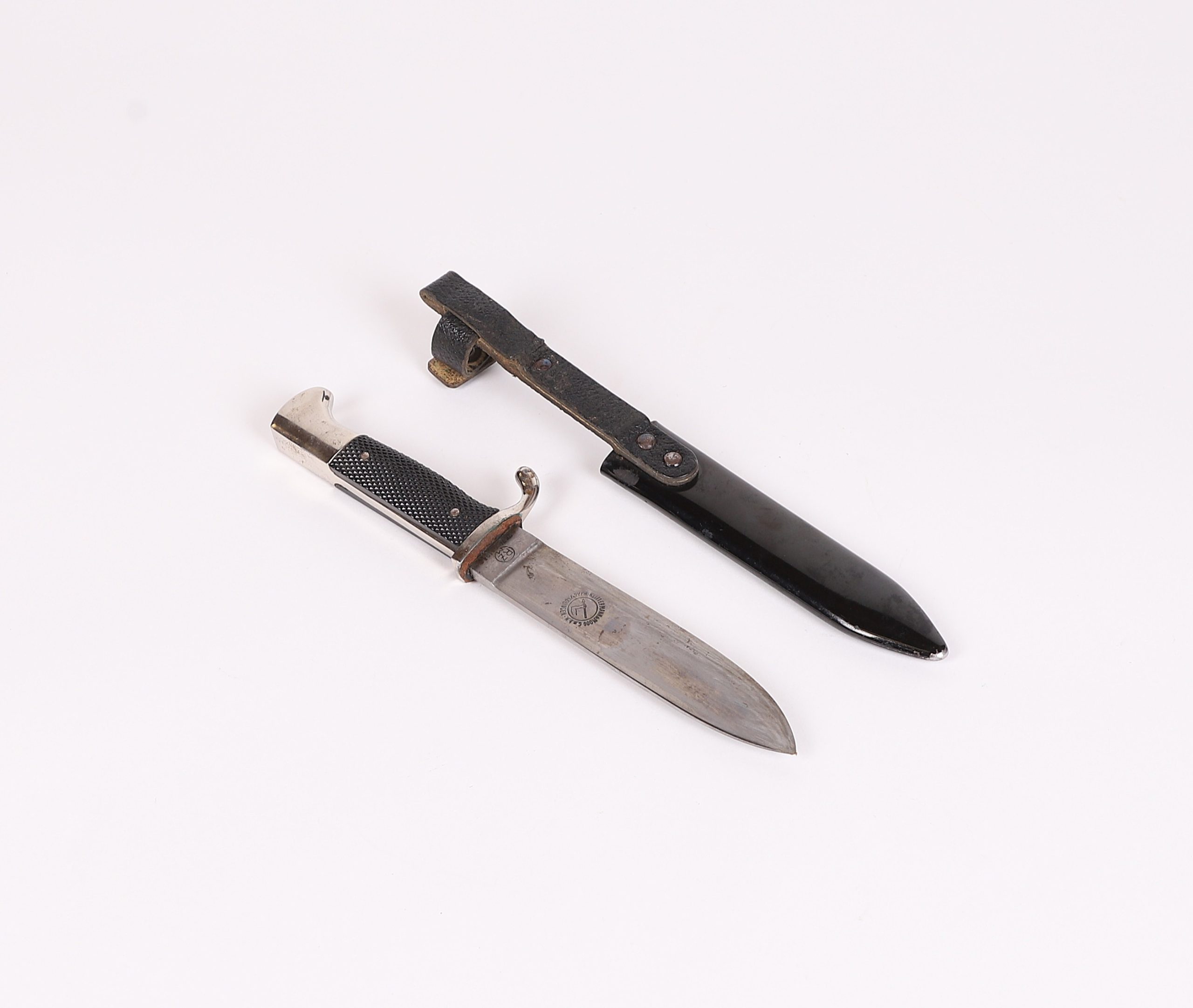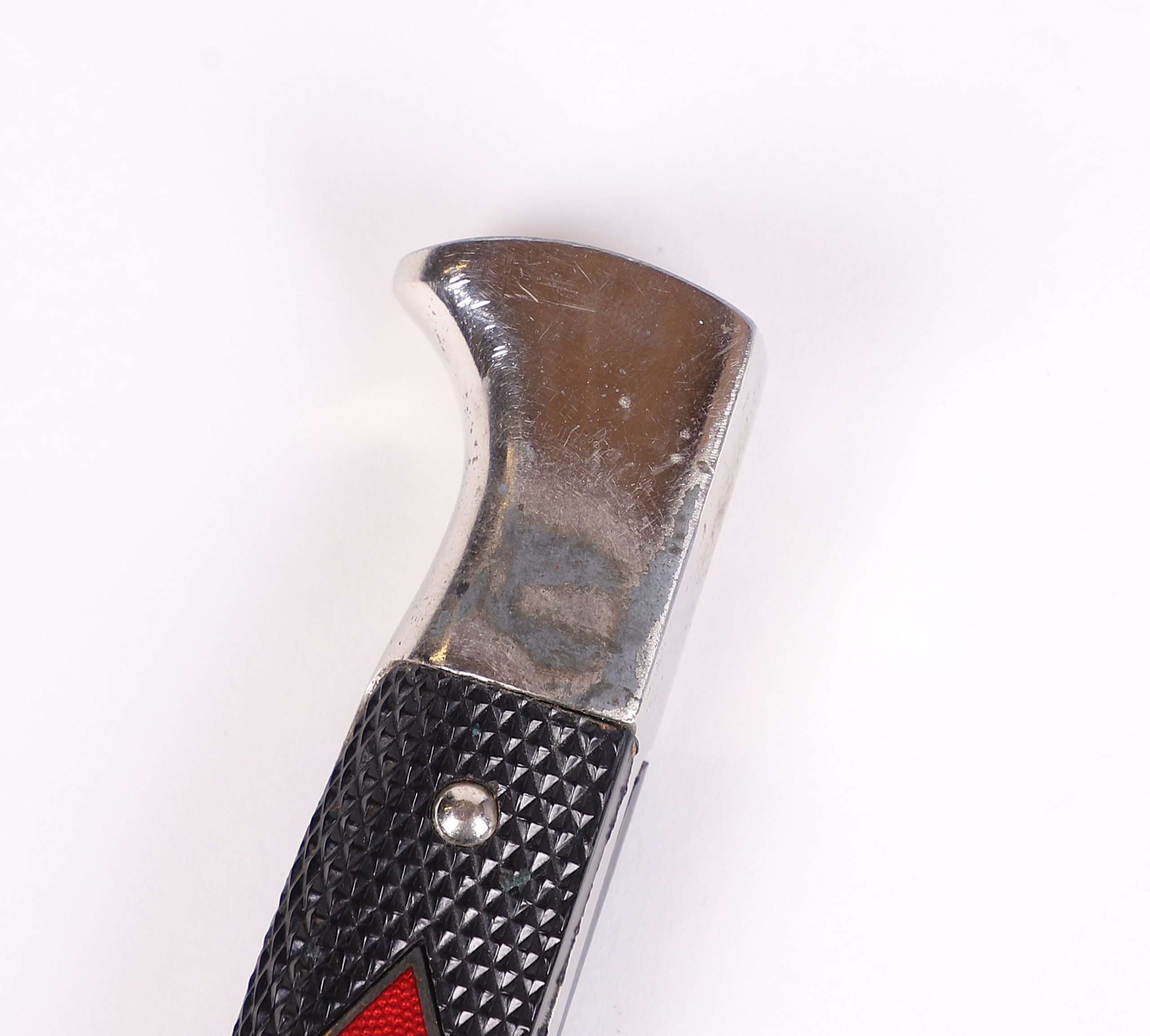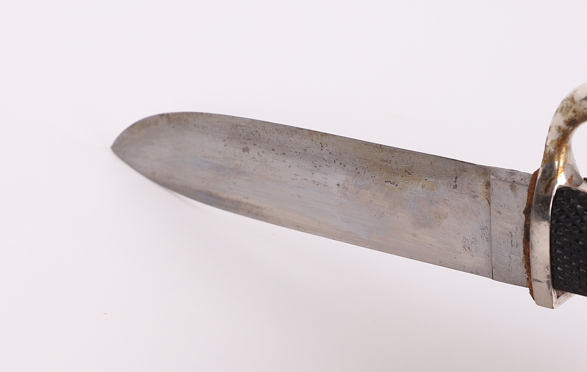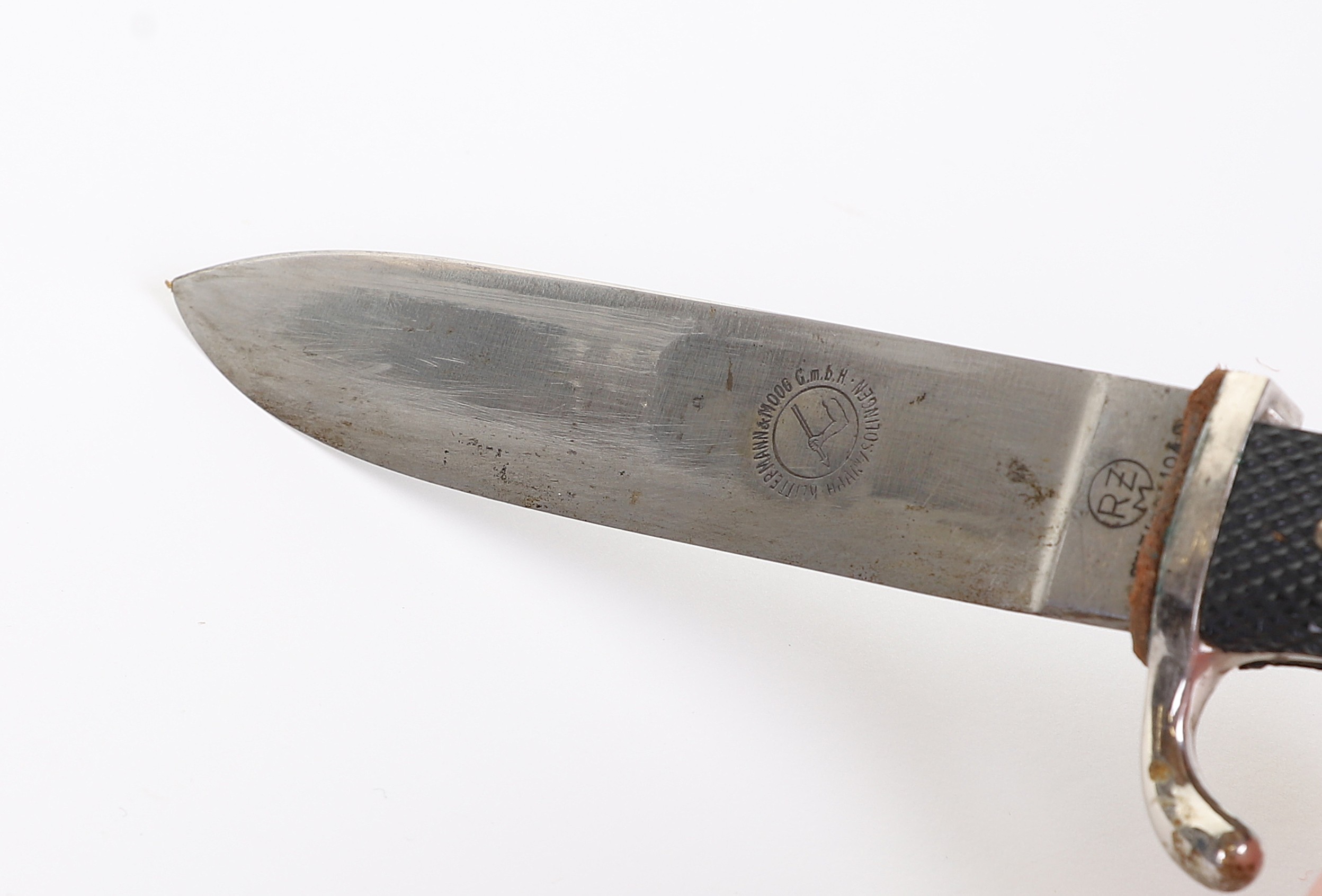 Double proofed HJ knife from the maker of Klittermann & Moog. Blade shows some edge sharpening and scratches, but no abuse just common use. Marked with the RZM at the base and dated 1940. Grip looks good and the HJ diamond only shows wear at the edge on the one side. Scabbard leather is supple and still intact and the scabbard shows minimal wear.