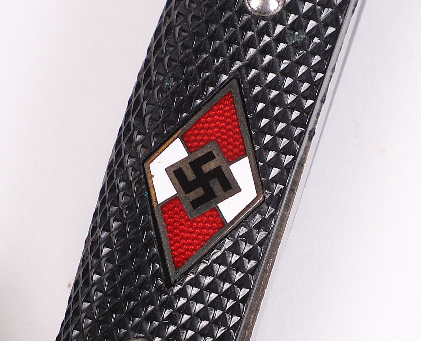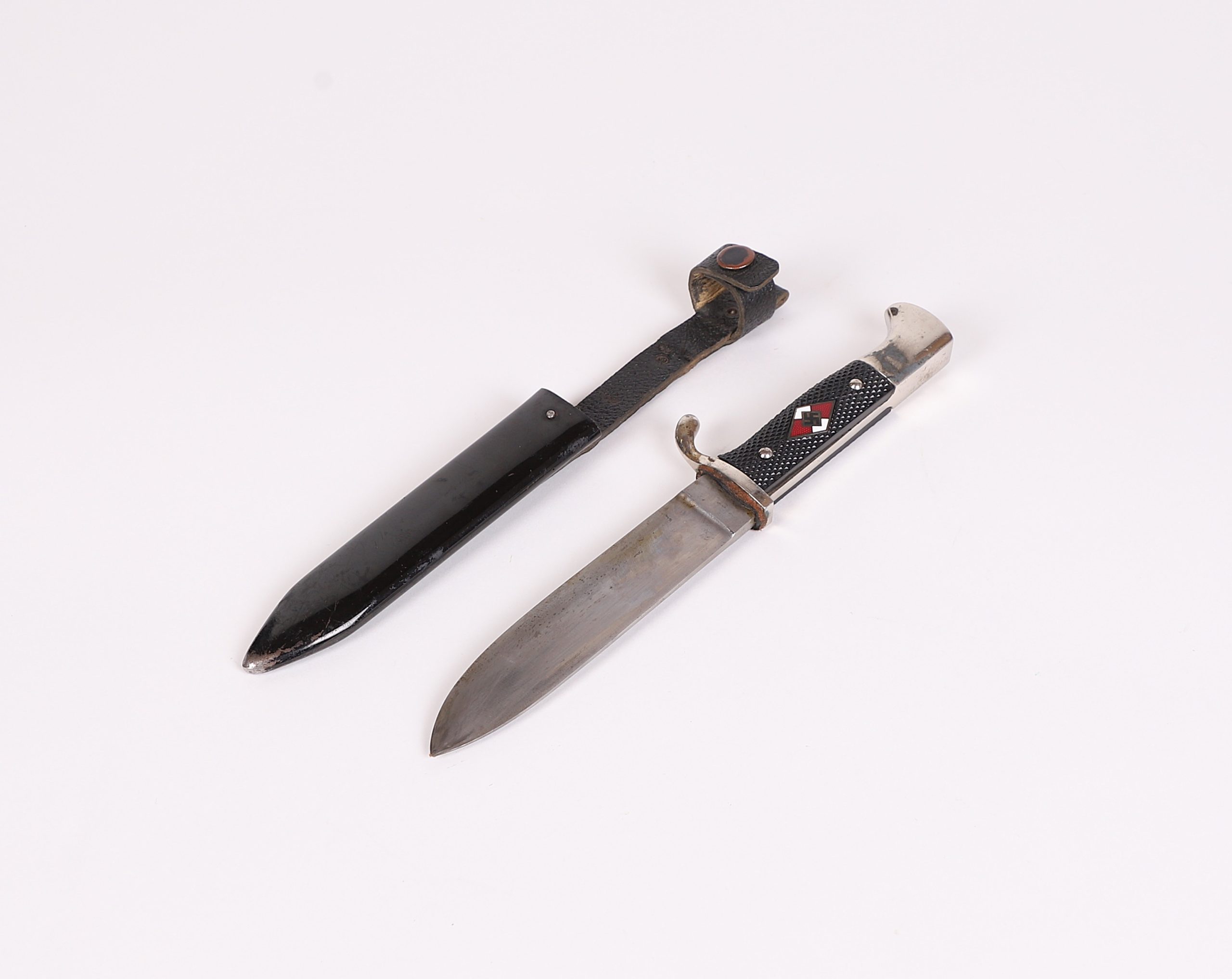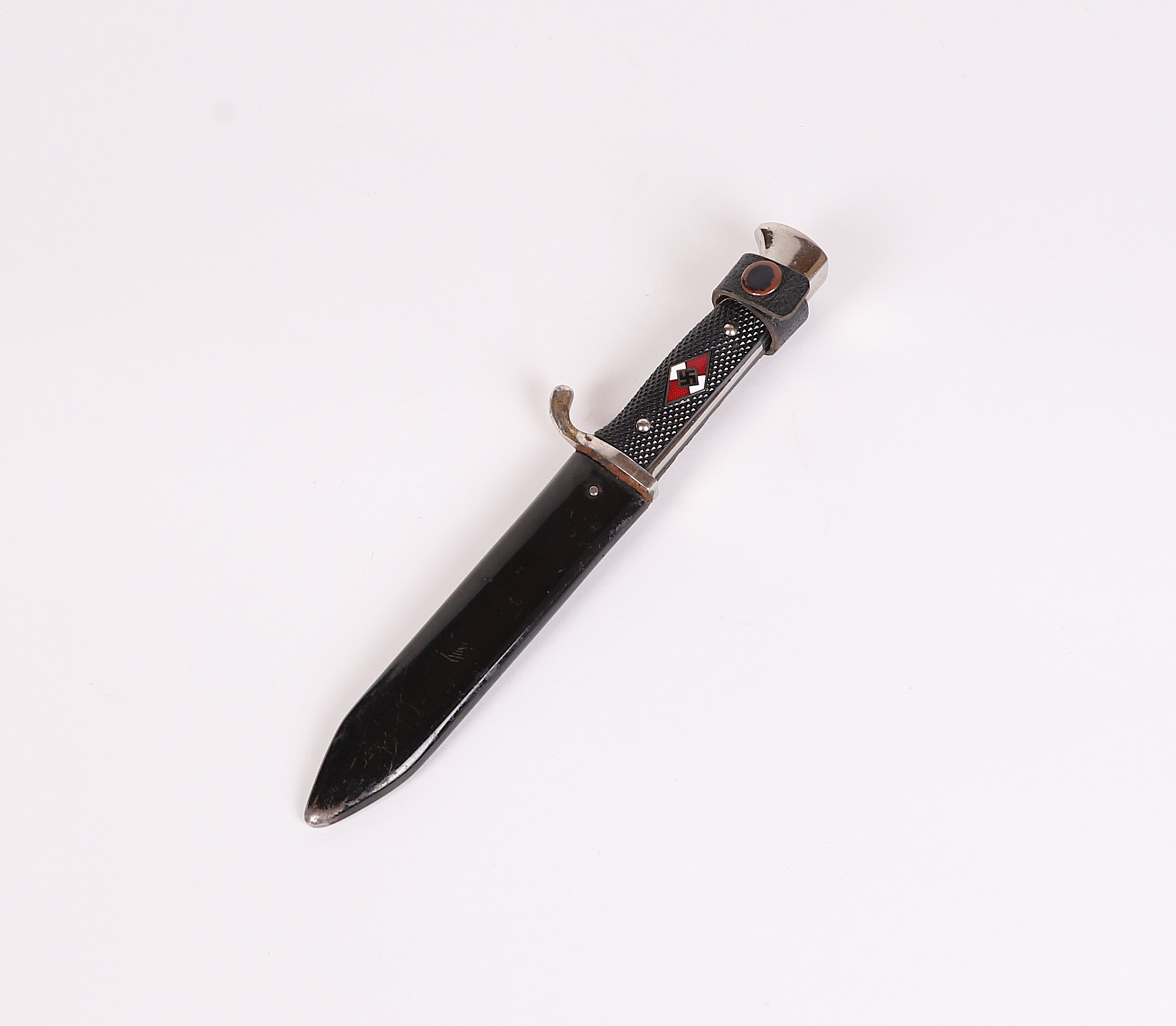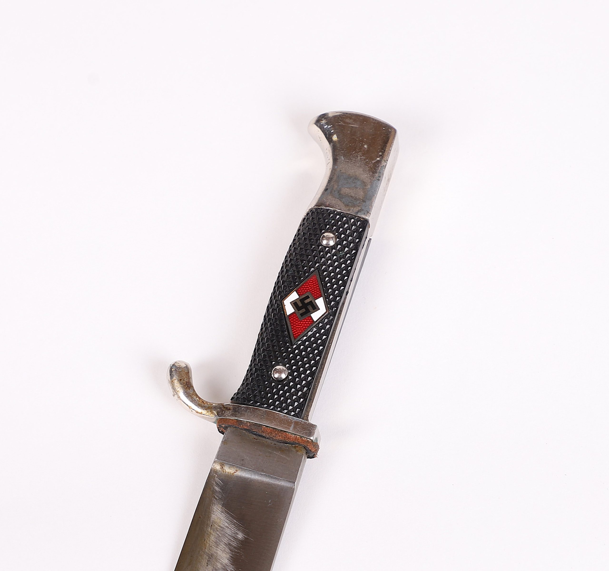 Double proofed HJ knife from the maker of Klittermann & Moog. Blade shows some edge sharpening and scratches, but no abuse just common use. Marked with the RZM at the base and dated 1940. Grip looks good and the HJ diamond only shows wear at the edge on the one side. Scabbard leather is supple and still intact and the scabbard shows minimal wear.