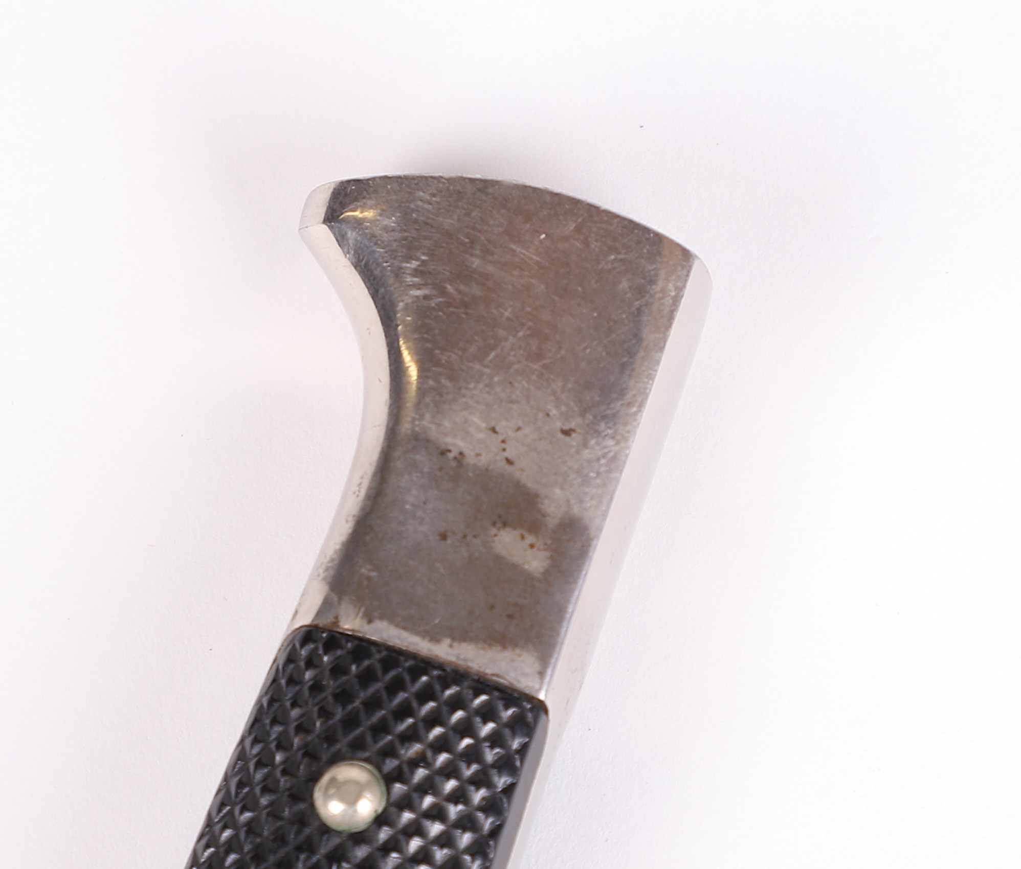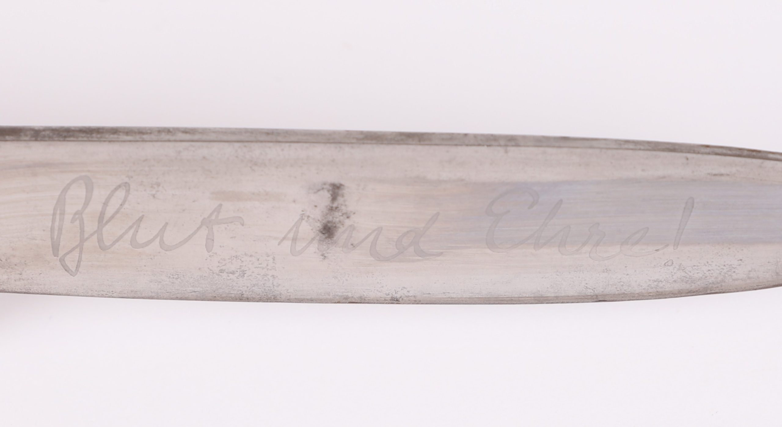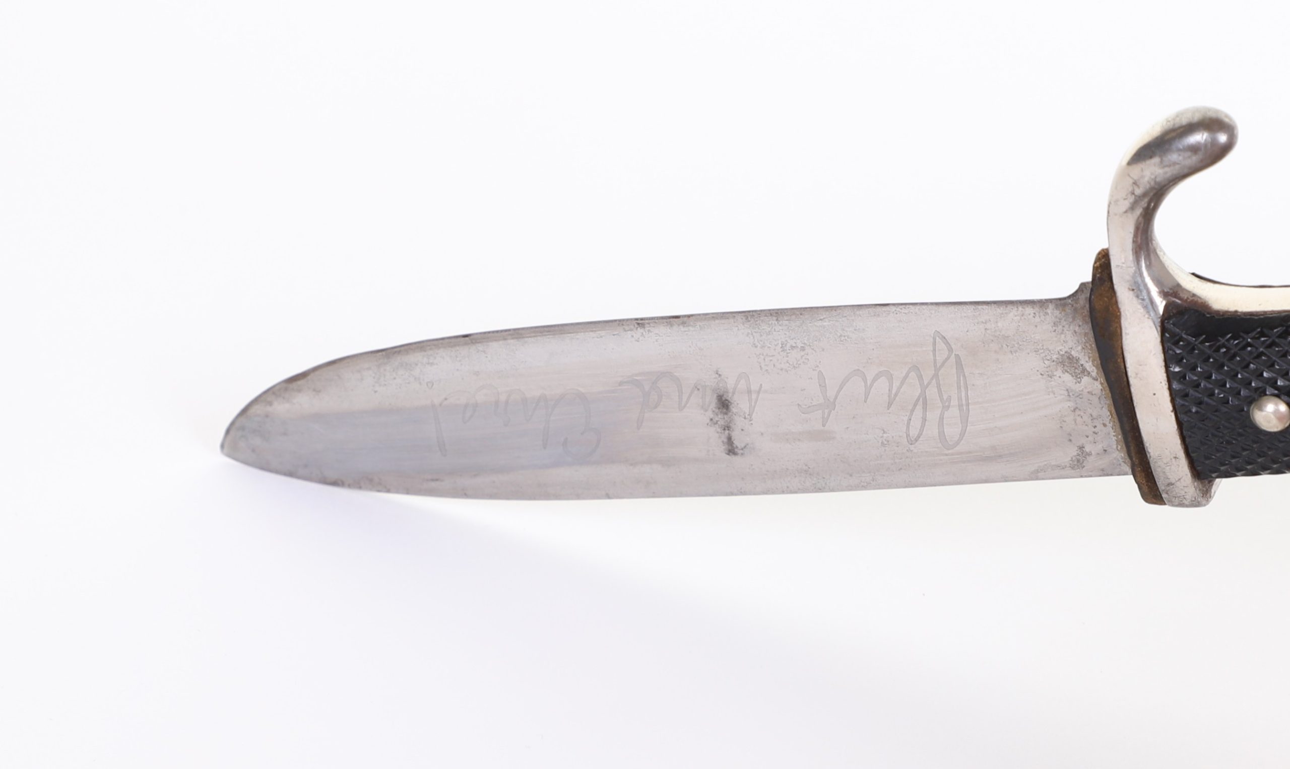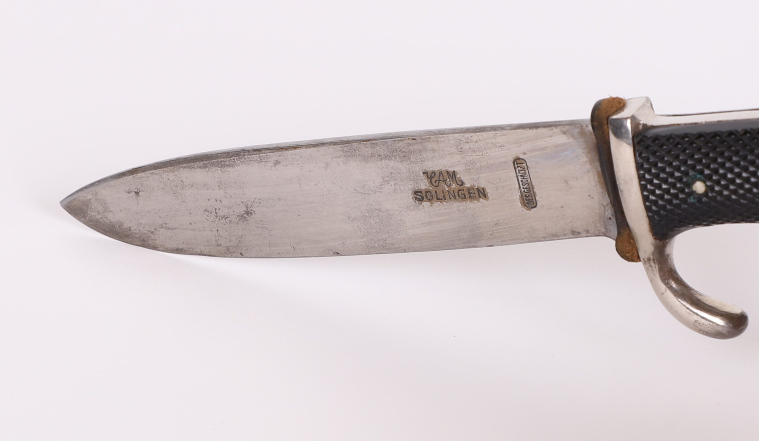 Very early style knife featuring the slab blade with the motto. Blade shows minor wear with some scratches to the edge, but no abuse. Motto is present, though faint it can still be seen. Opposite side of the blade has a very nice maker mark that is dark. Grip is nice with no cracks and a HJ diamond that shows only minimal wear to the outer edge. Scabbard retains original leather and at some point it looks to have been touched up with paint. Still a nice early slab blade example with motto.