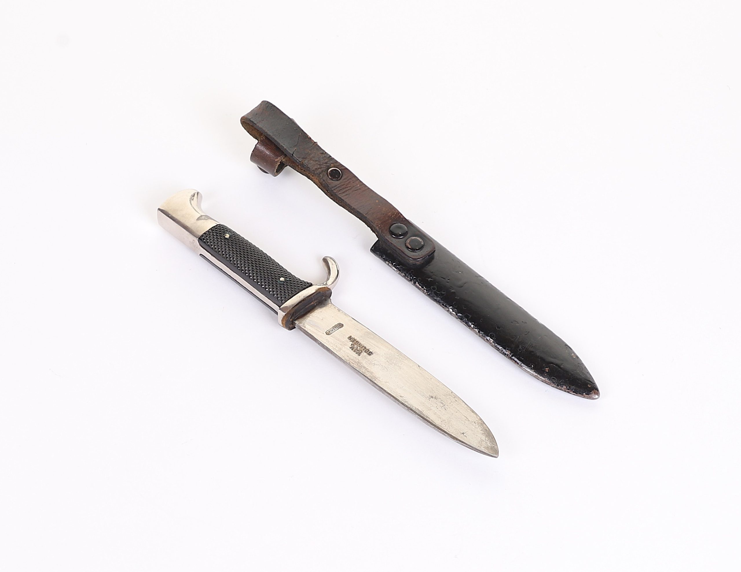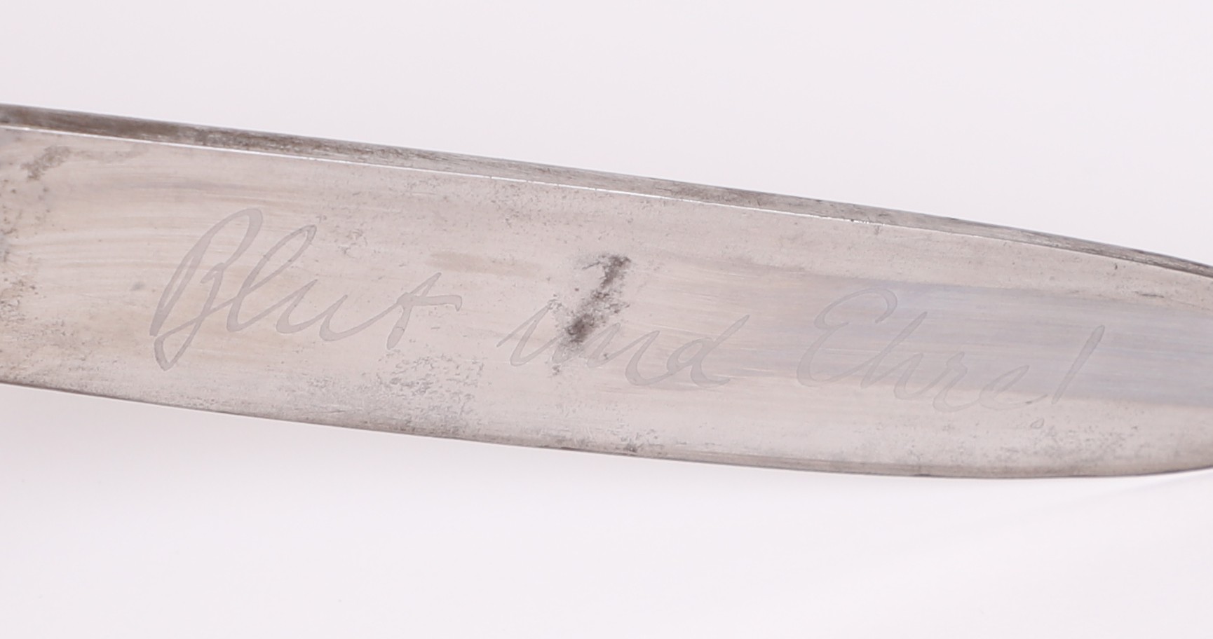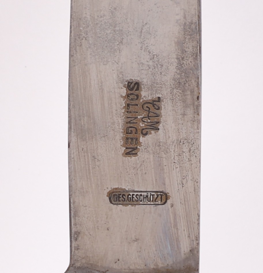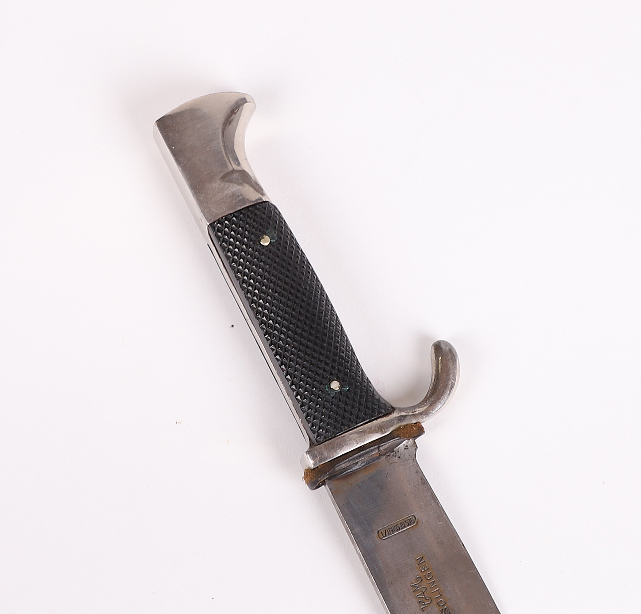 Very early style knife featuring the slab blade with the motto. Blade shows minor wear with some scratches to the edge, but no abuse. Motto is present, though faint it can still be seen. Opposite side of the blade has a very nice maker mark that is dark. Grip is nice with no cracks and a HJ diamond that shows only minimal wear to the outer edge. Scabbard retains original leather and at some point it looks to have been touched up with paint. Still a nice early slab blade example with motto.