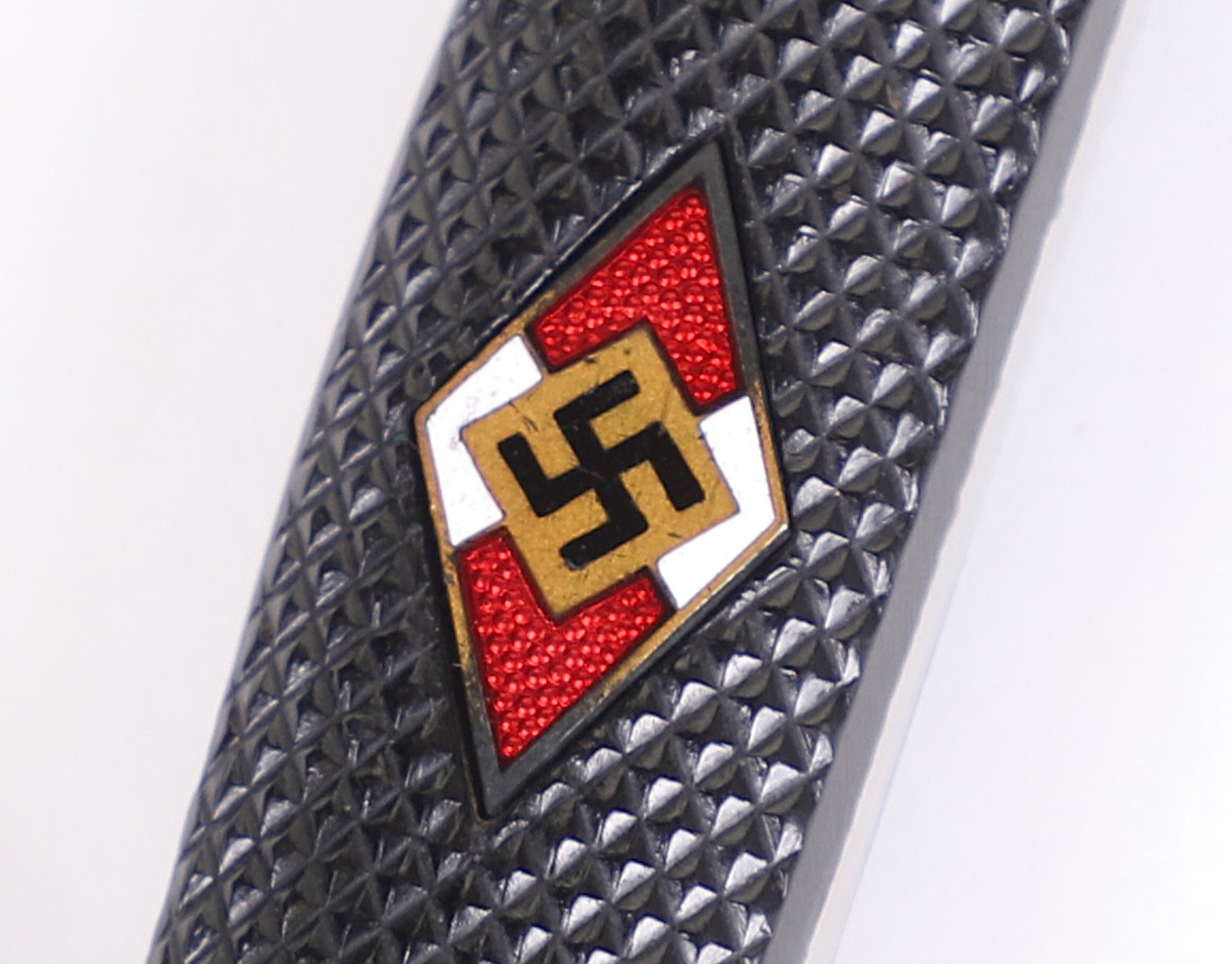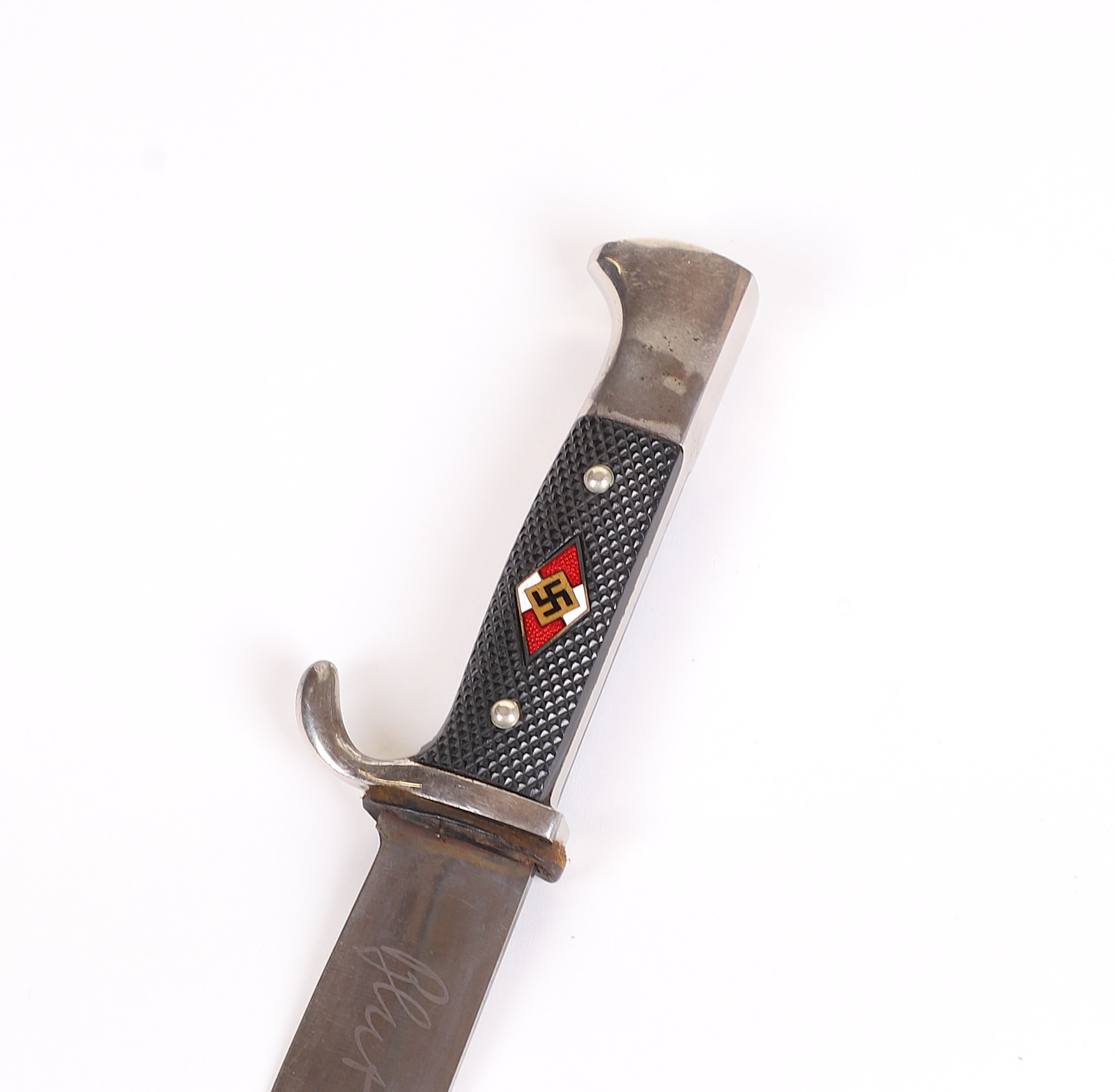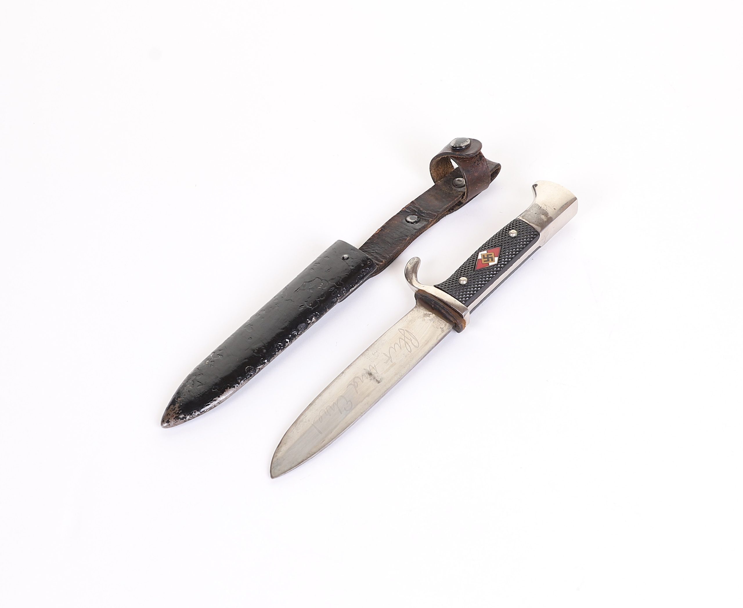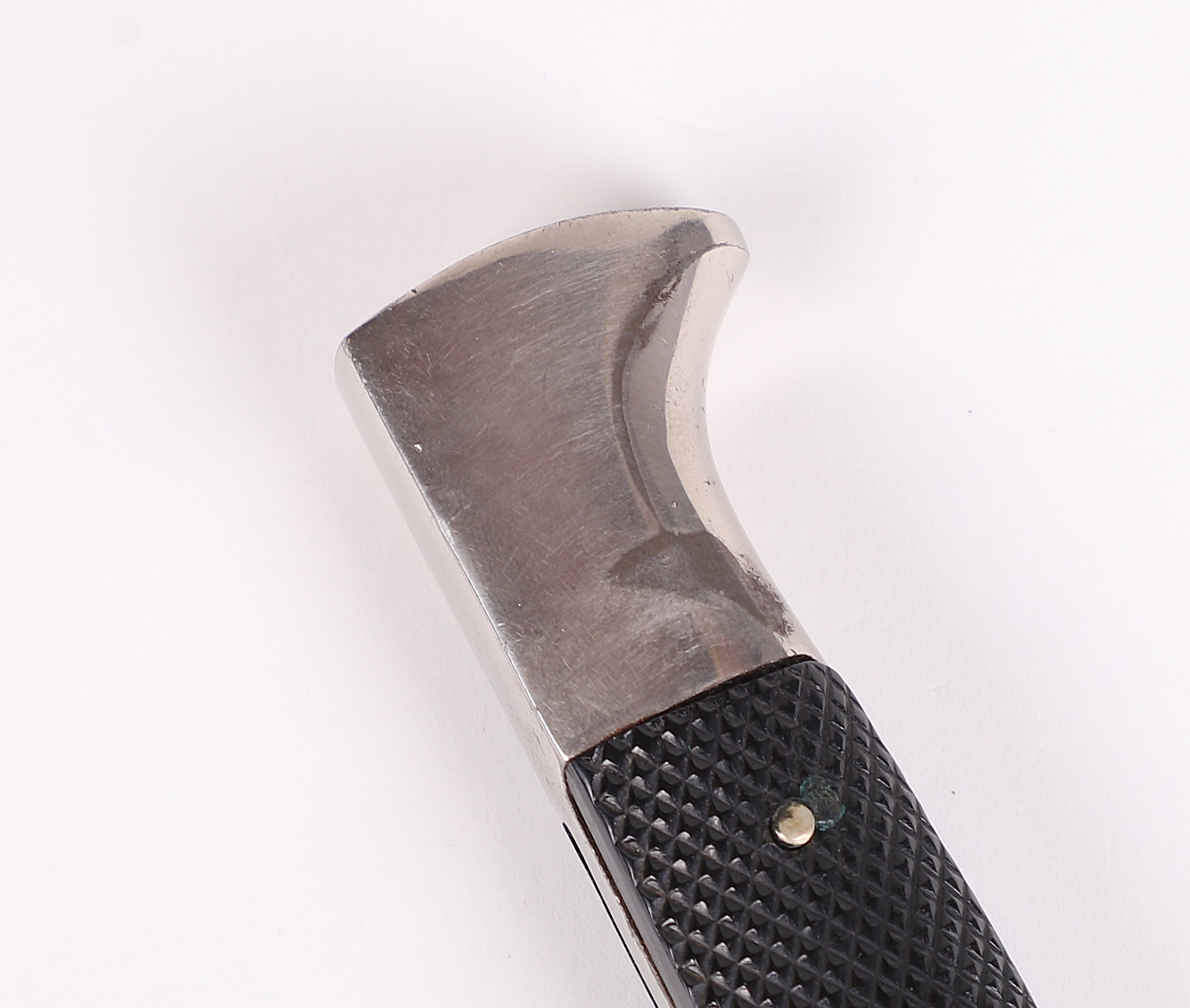 Very early style knife featuring the slab blade with the motto. Blade shows minor wear with some scratches to the edge, but no abuse. Motto is present, though faint it can still be seen. Opposite side of the blade has a very nice maker mark that is dark. Grip is nice with no cracks and a HJ diamond that shows only minimal wear to the outer edge. Scabbard retains original leather and at some point it looks to have been touched up with paint. Still a nice early slab blade example with motto.