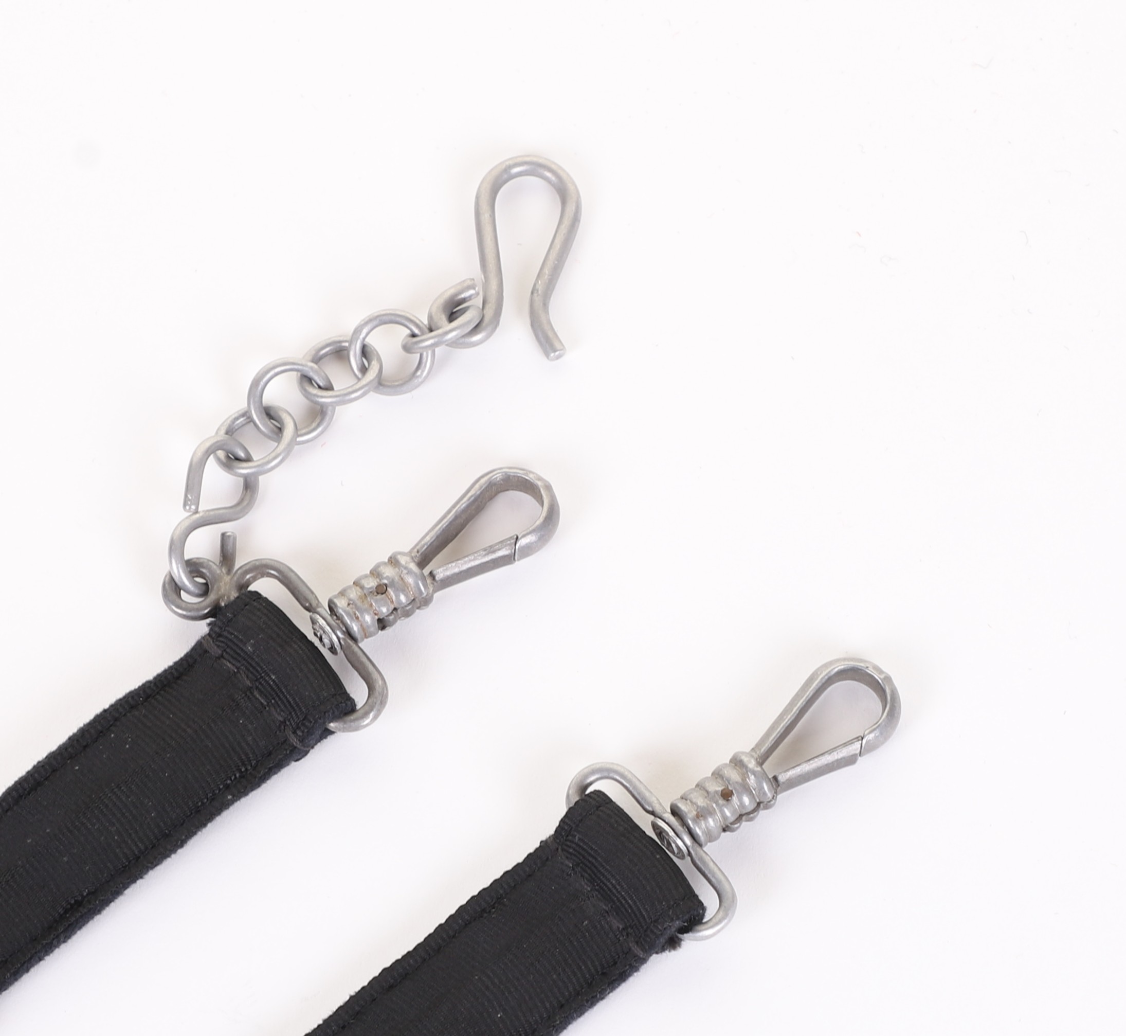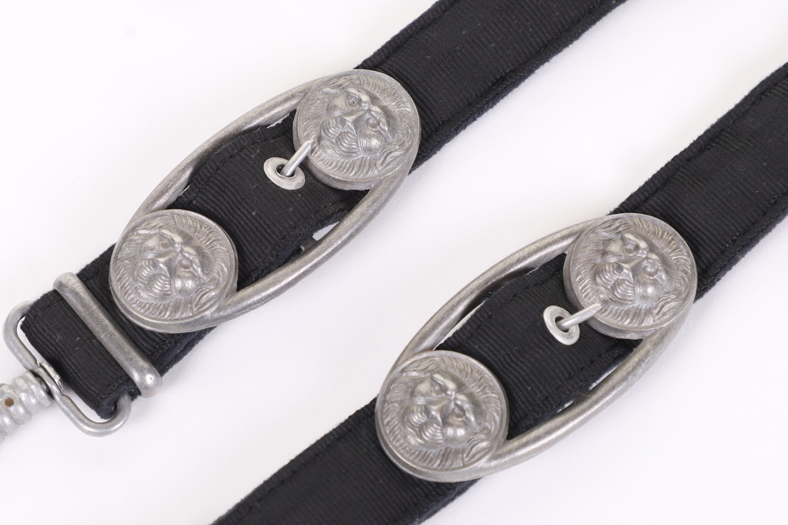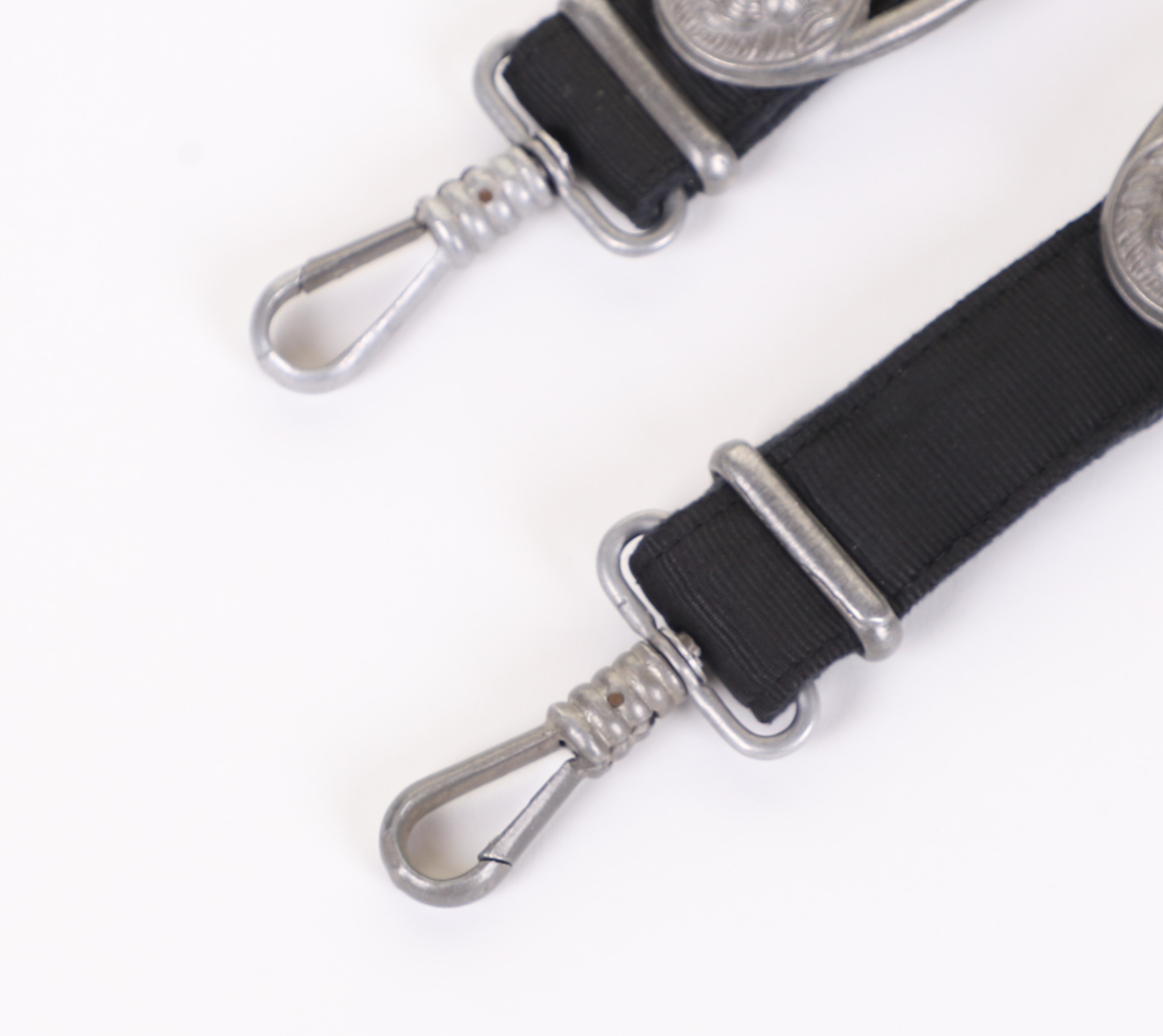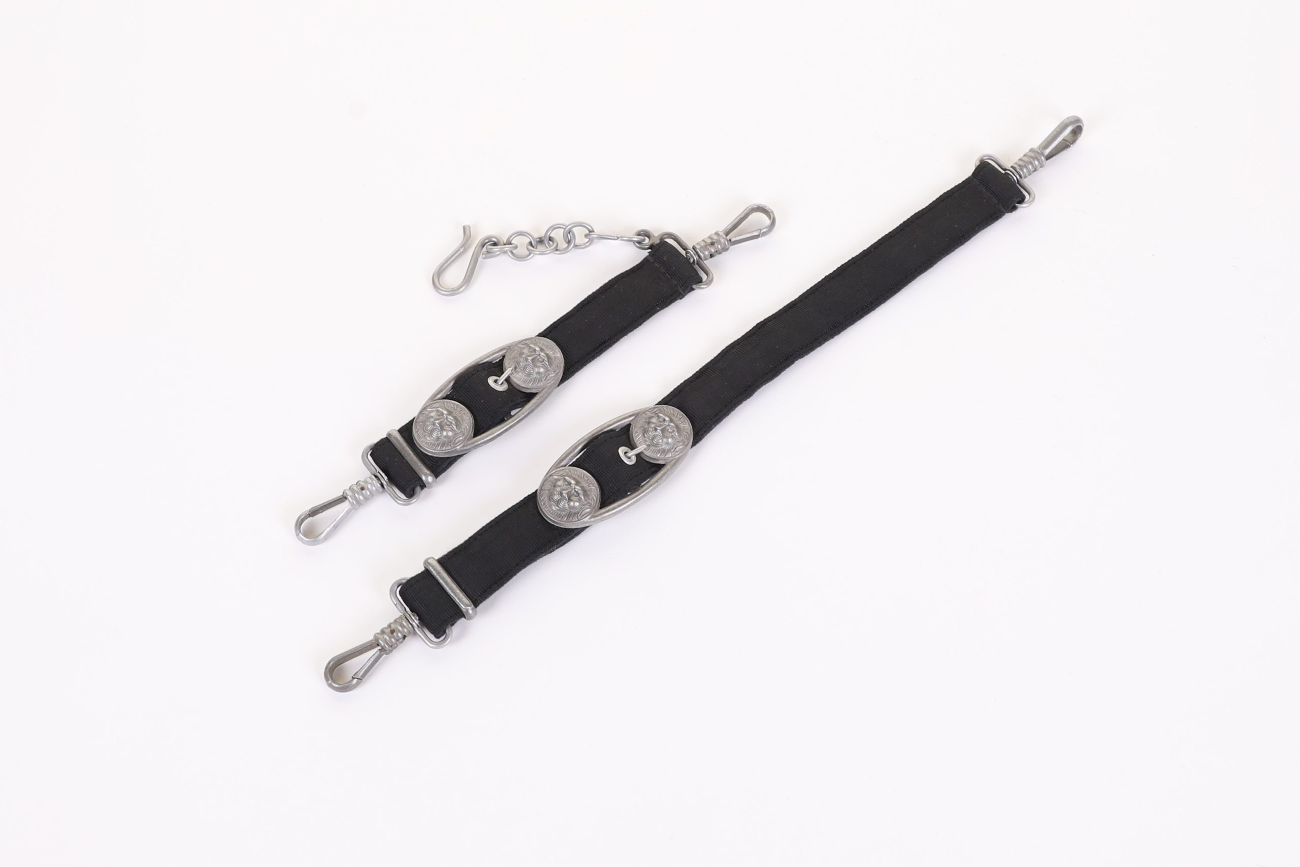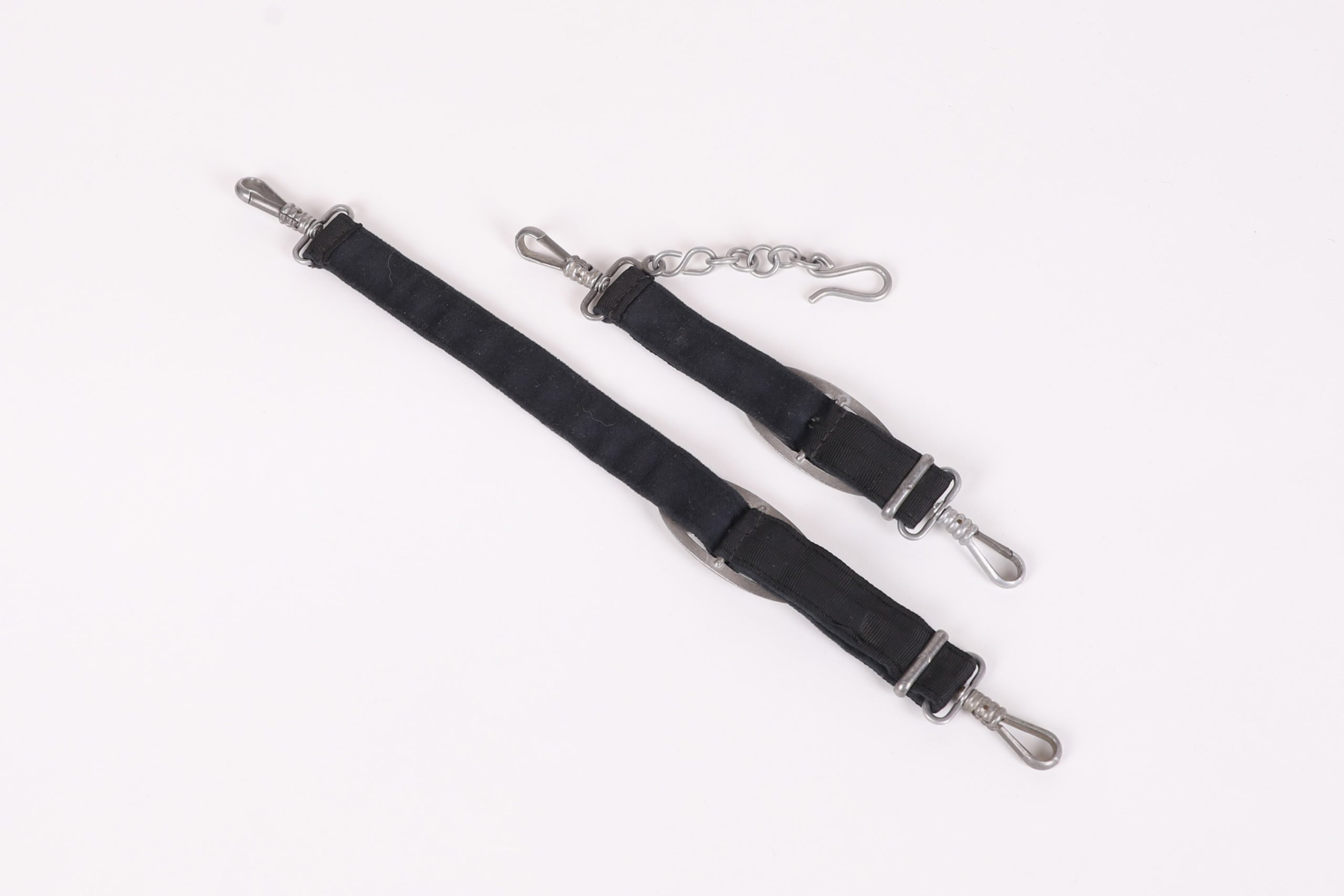 Very nice matching pair with the proper short and long straps. All working clips and nice even wear with no damage. Lion heads are marked on the back by the maker. Very hard to find this style hangers, especially in this condition.