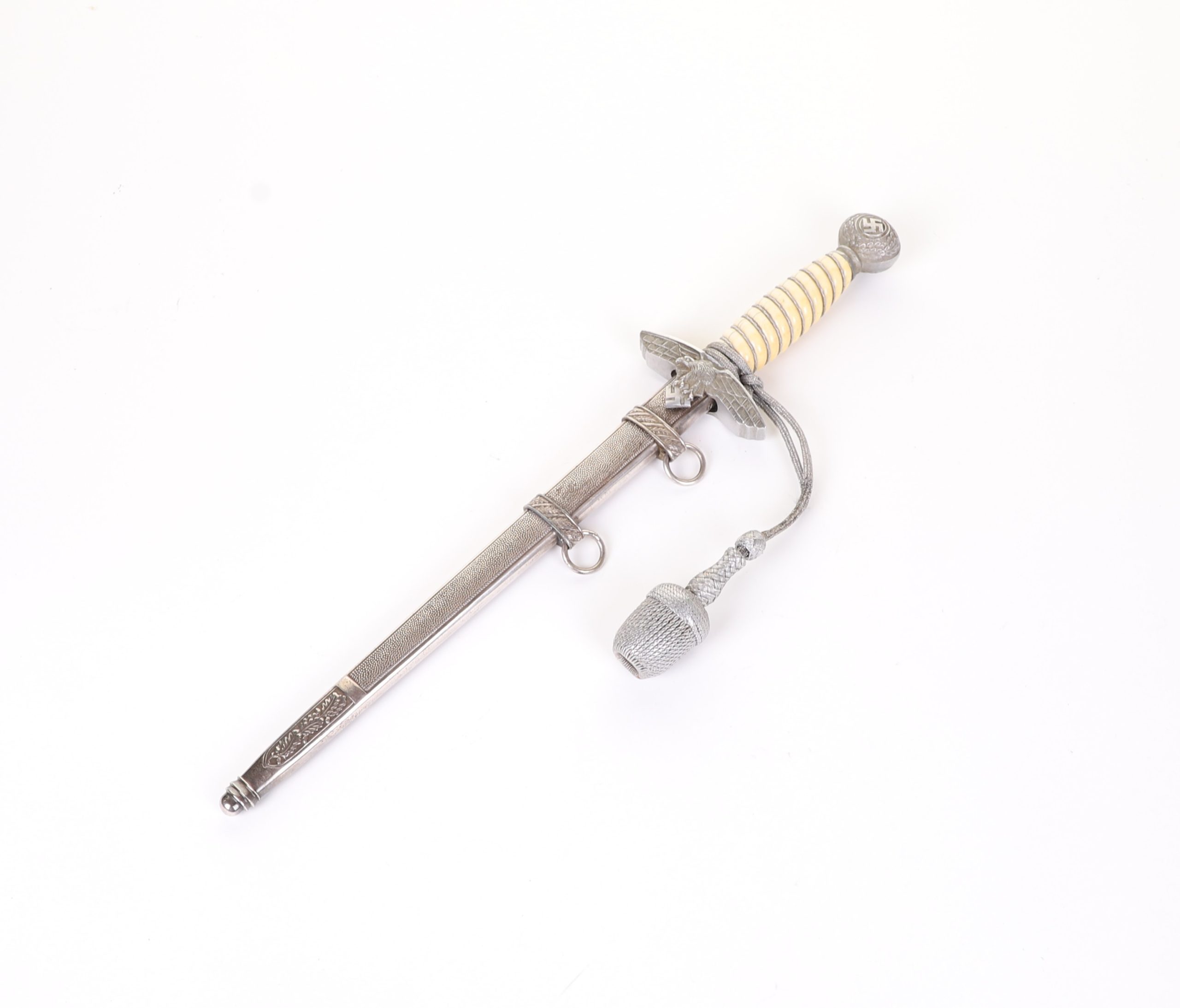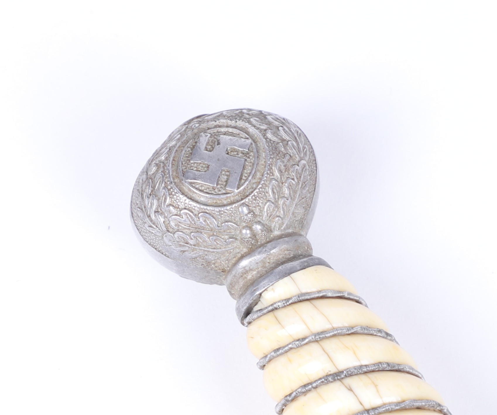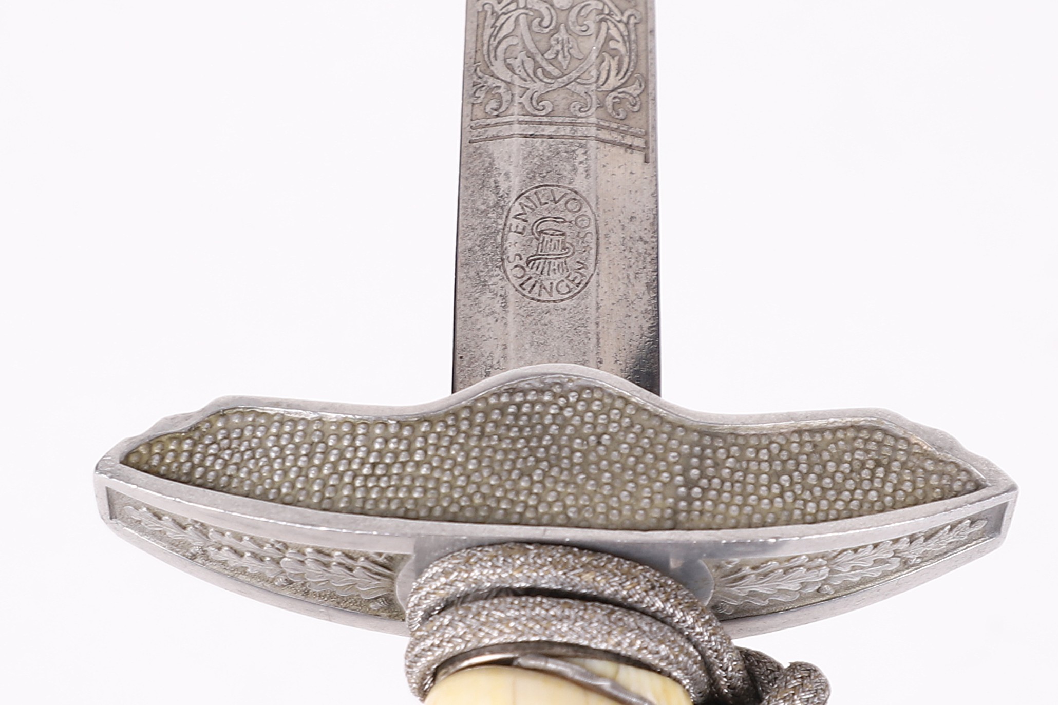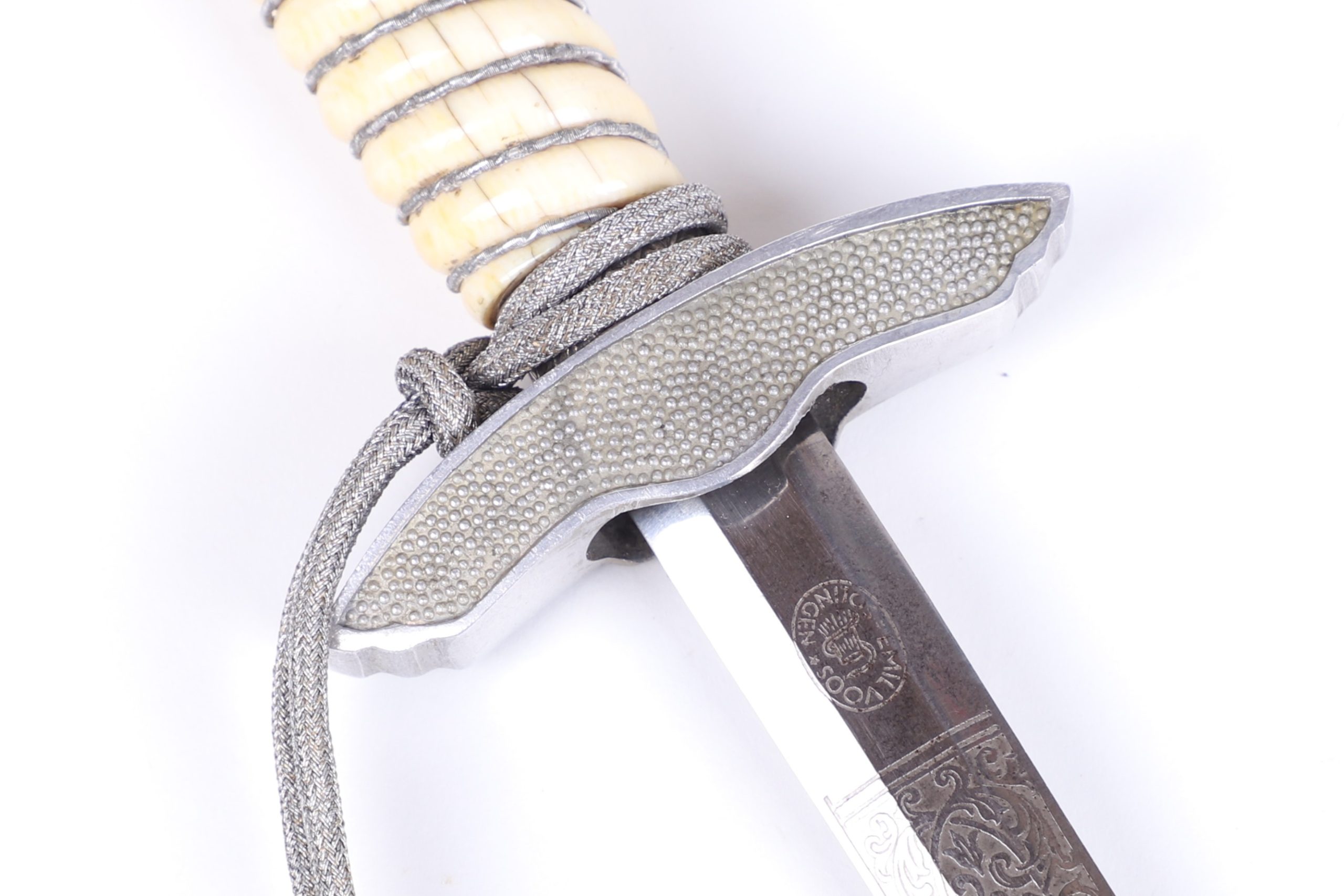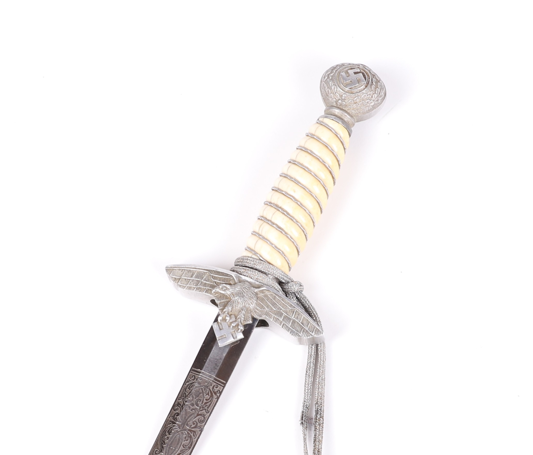 Very desirable engraved dagger made by Voos that features a real ivory grip. The grip has triple wire wrap and has a very nice grain to give this dagger a beautiful look. The blade has the standard Luft engraved panels and has a nice frosty finish to the background. The scabbard fits perfect and has shows nice detail and the piece comes with the original dagger knot.