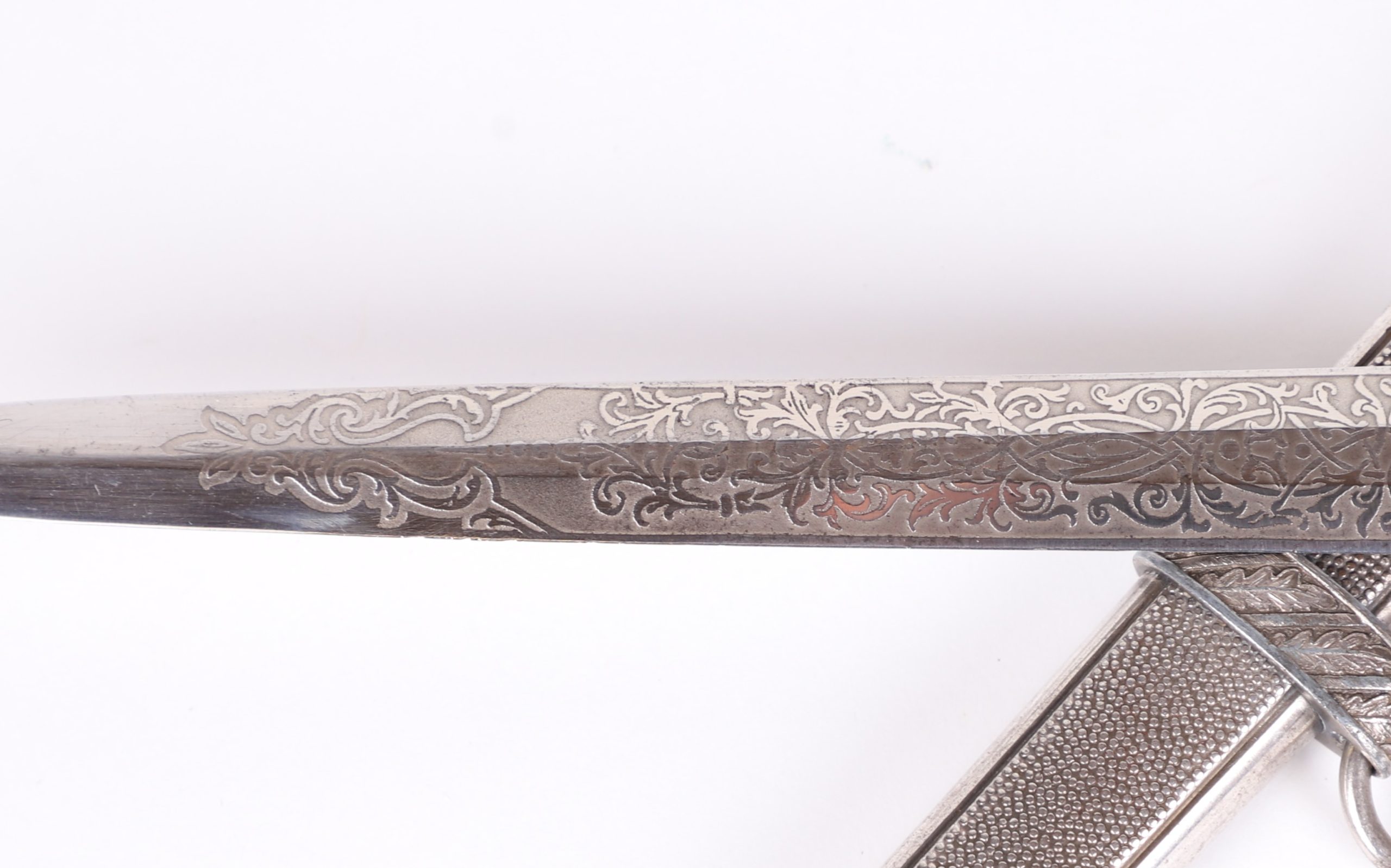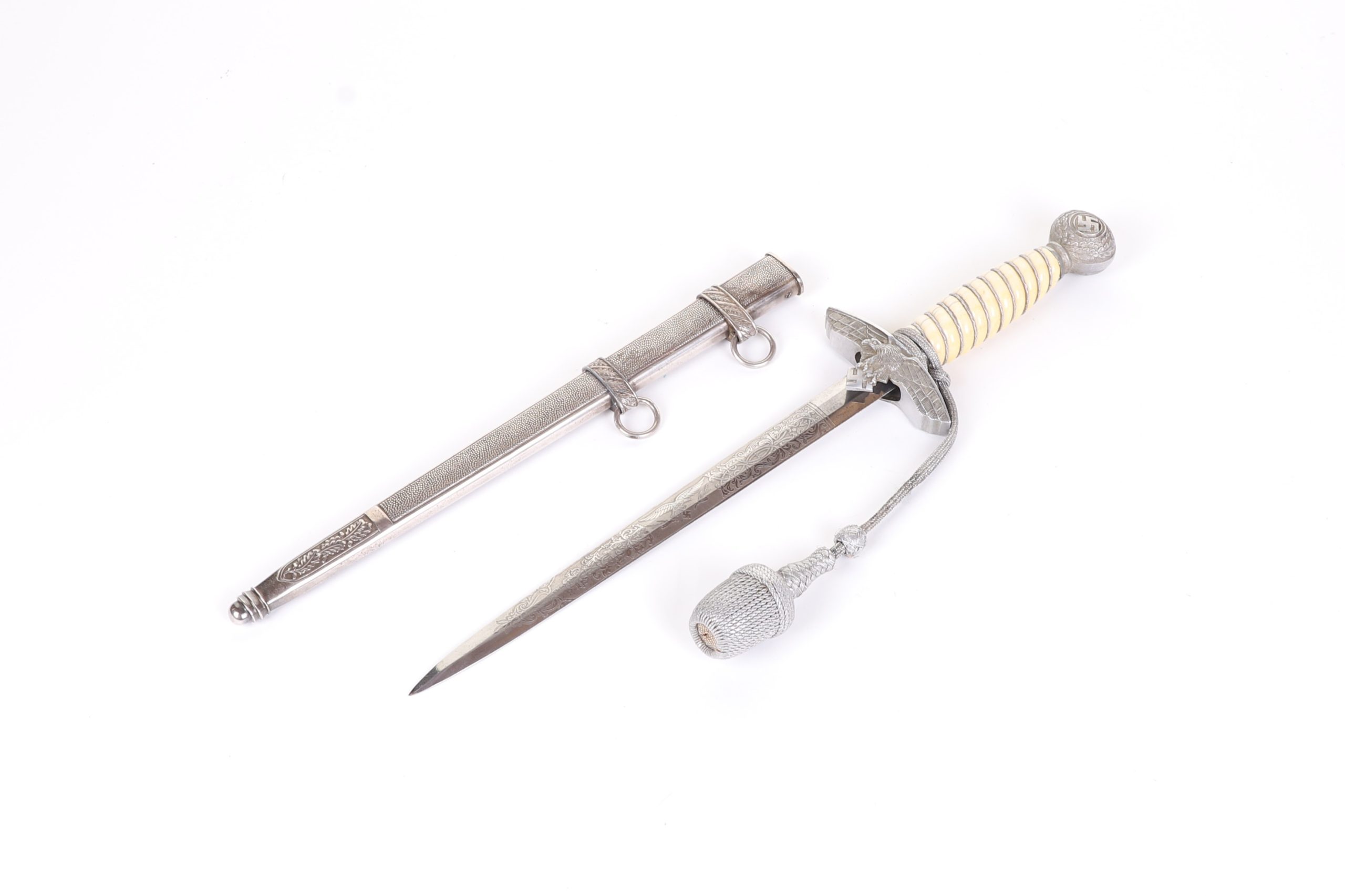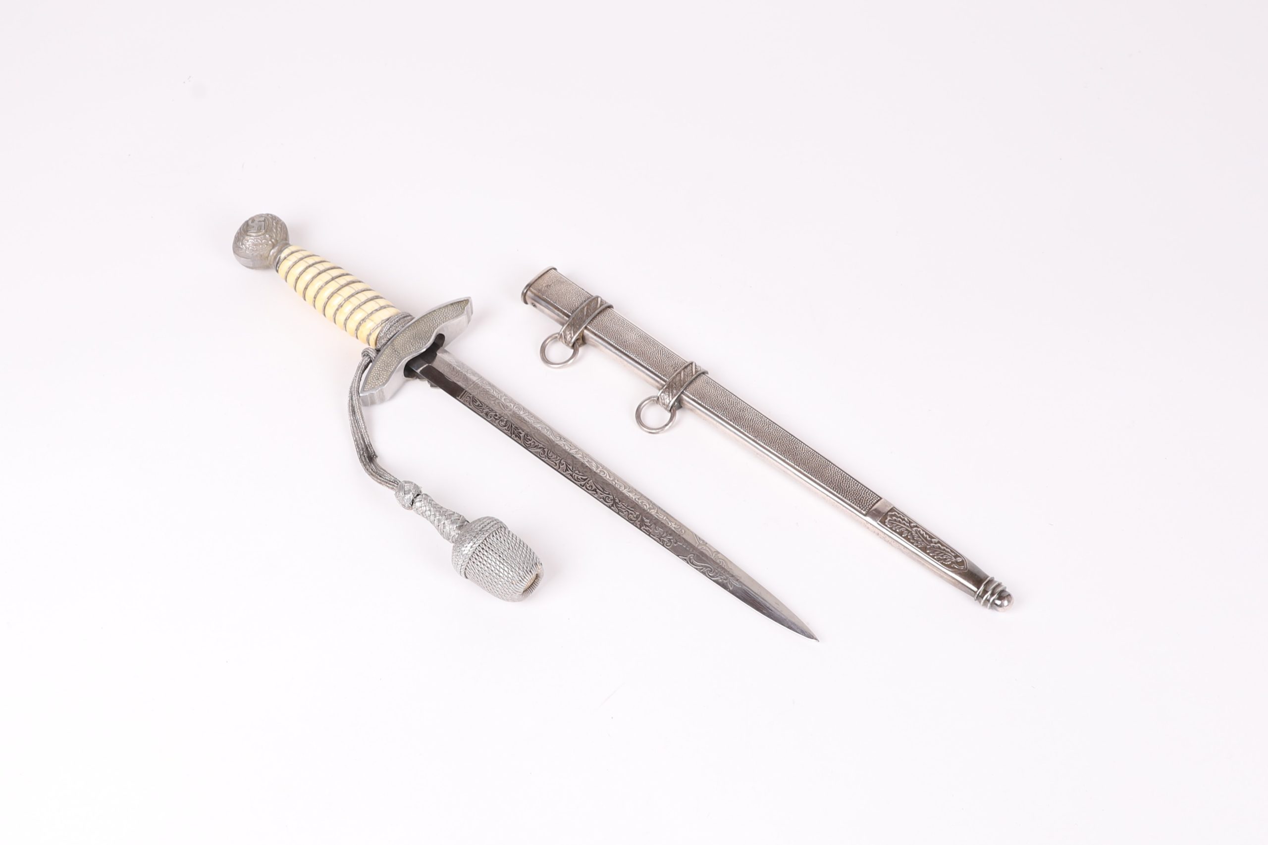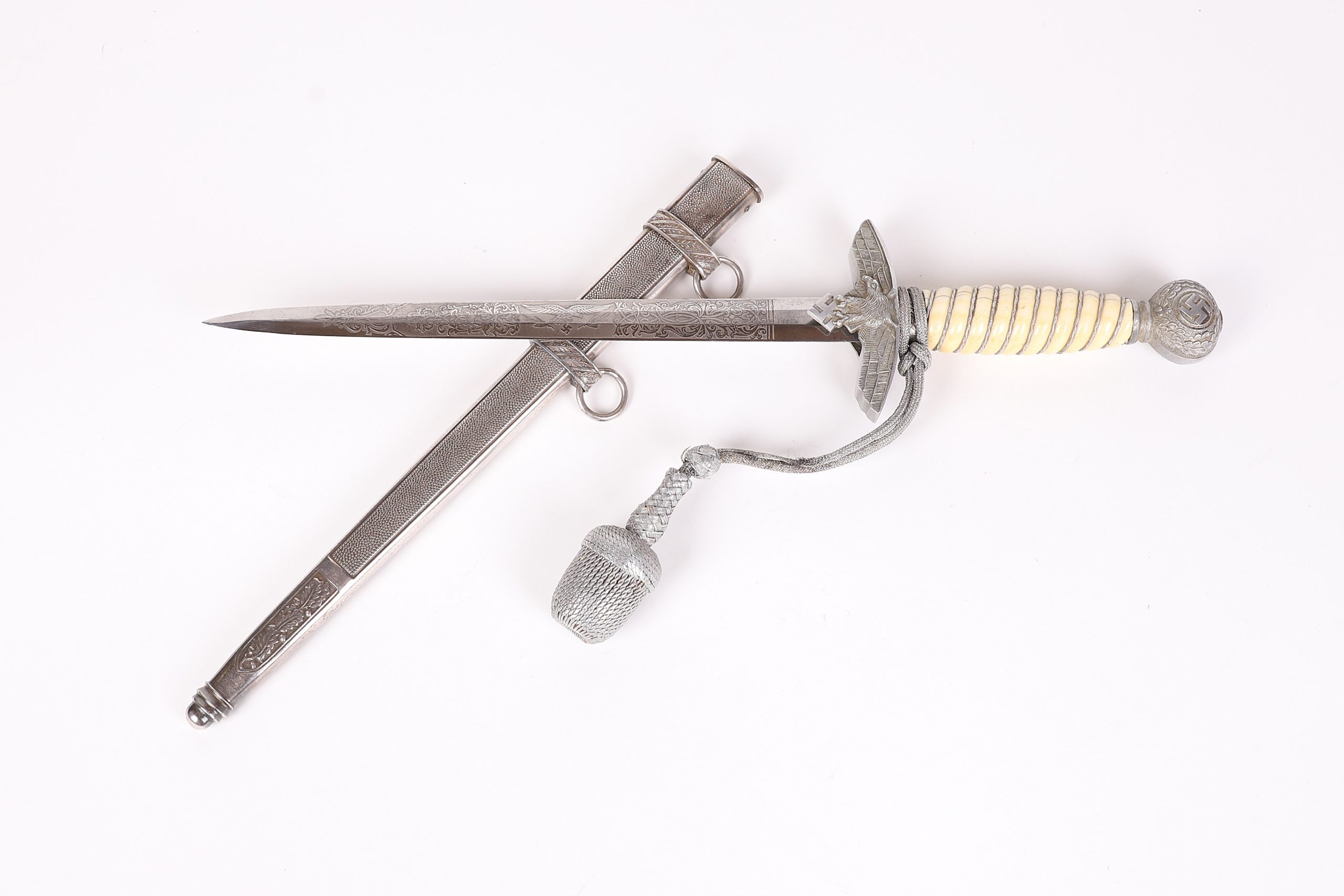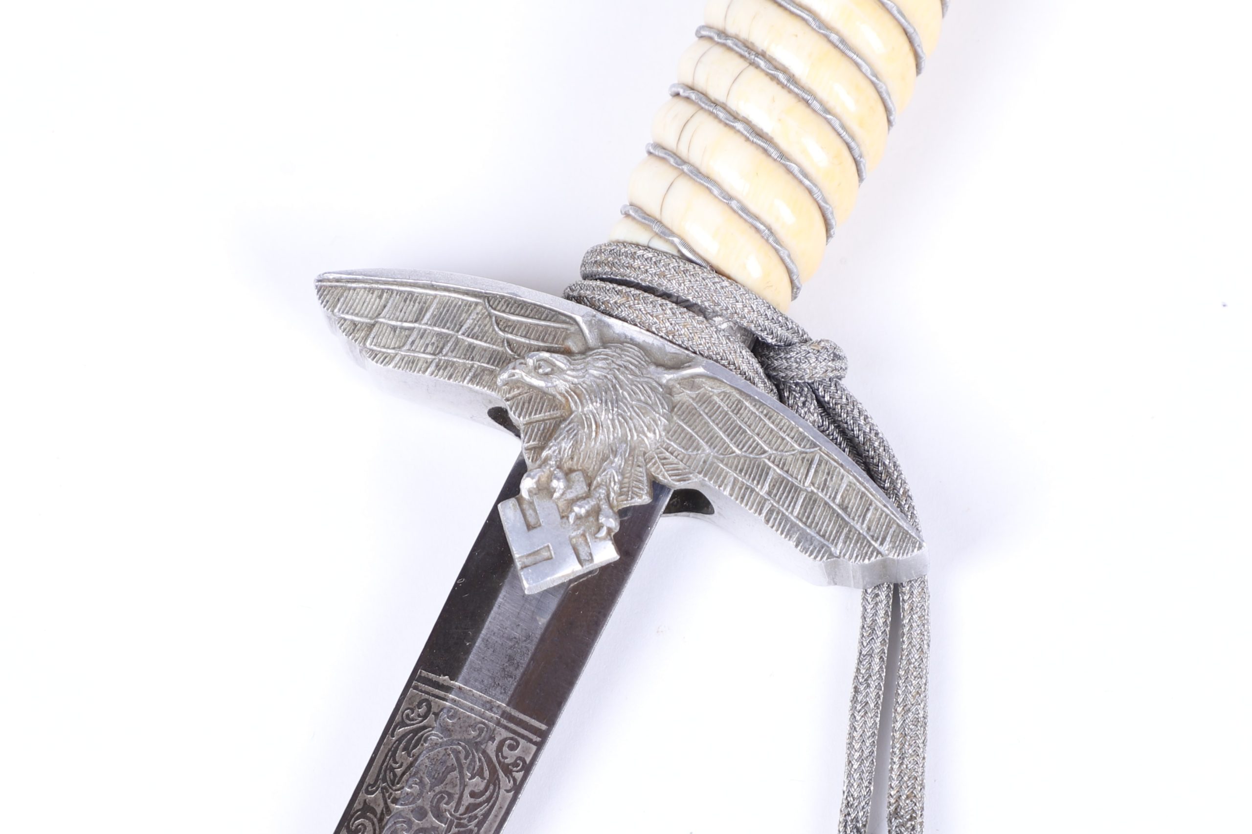 Very desirable engraved dagger made by Voos that features a real ivory grip. The grip has triple wire wrap and has a very nice grain to give this dagger a beautiful look. The blade has the standard Luft engraved panels and has a nice frosty finish to the background. The scabbard fits perfect and has shows nice detail and the piece comes with the original dagger knot.