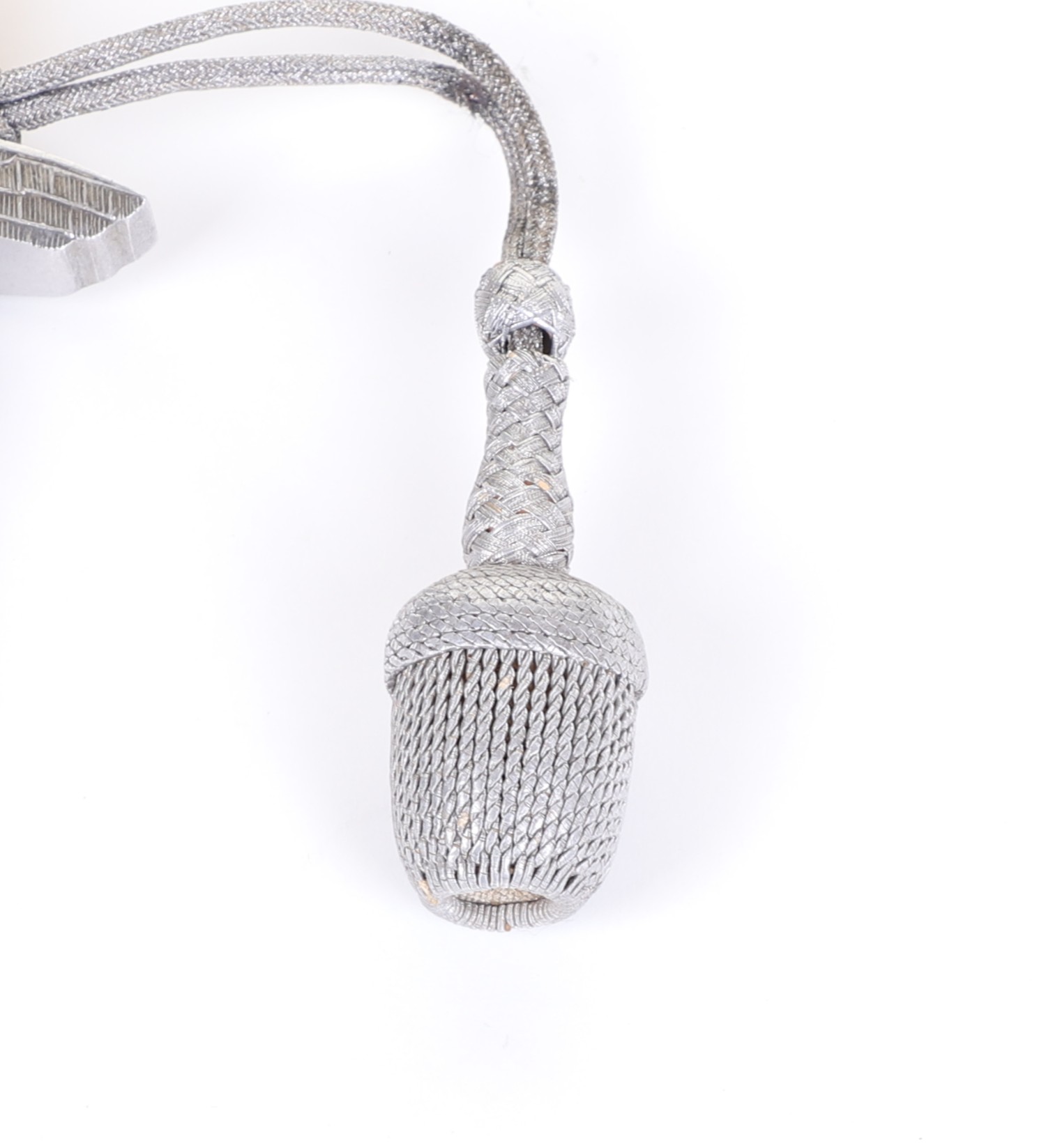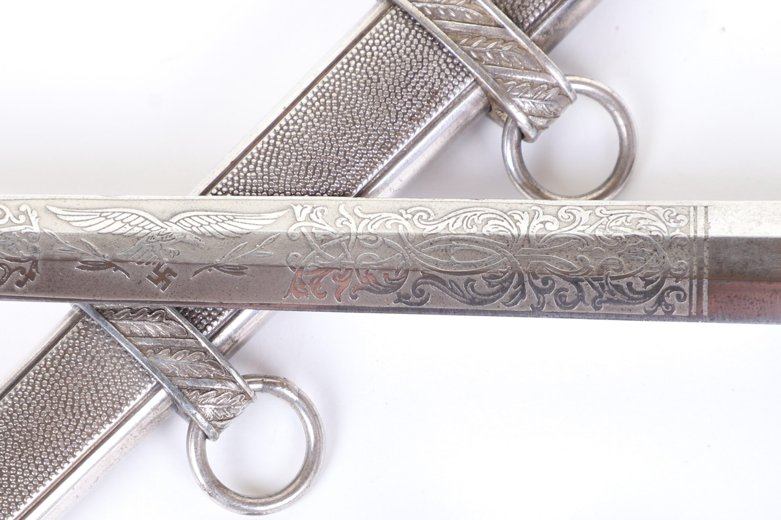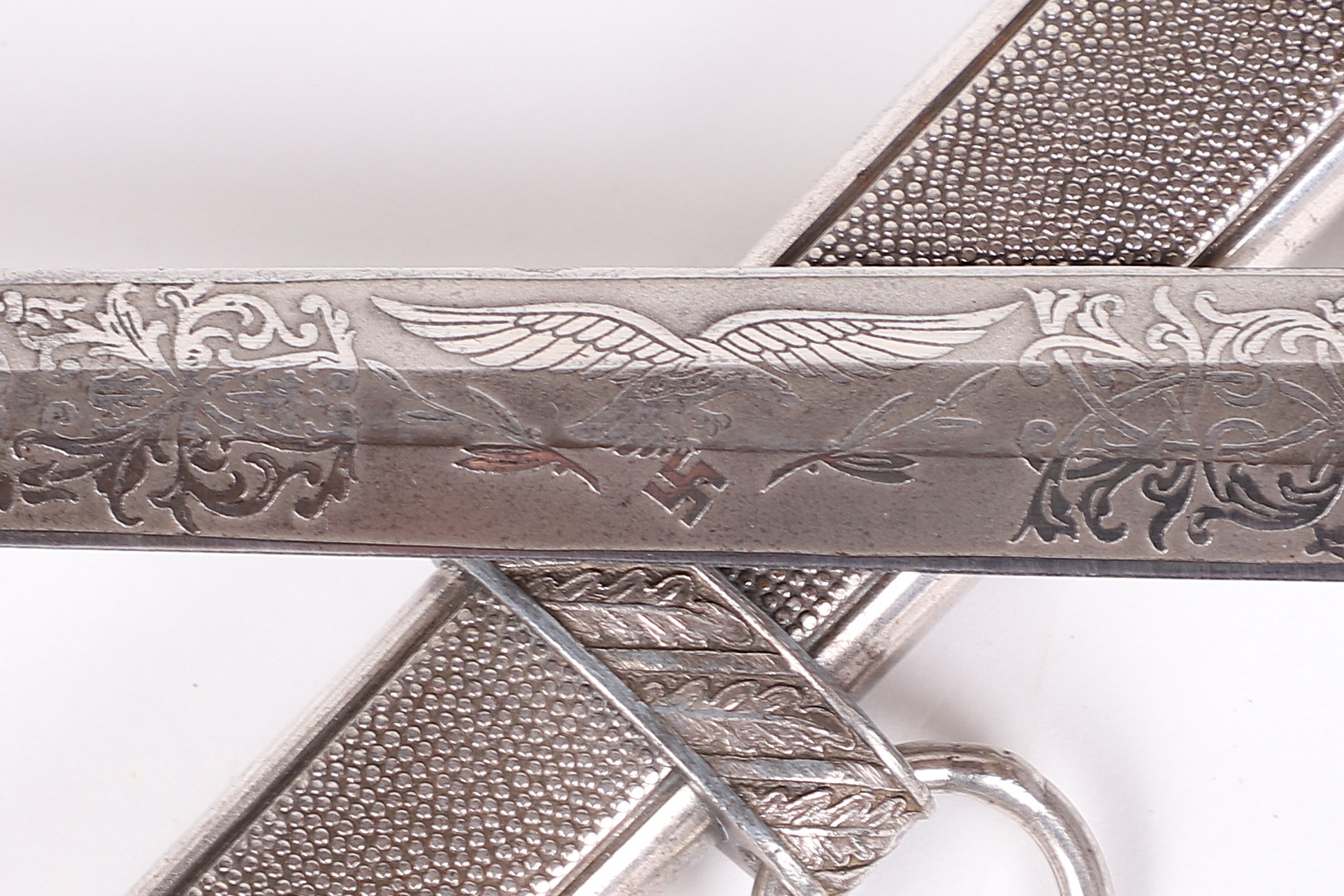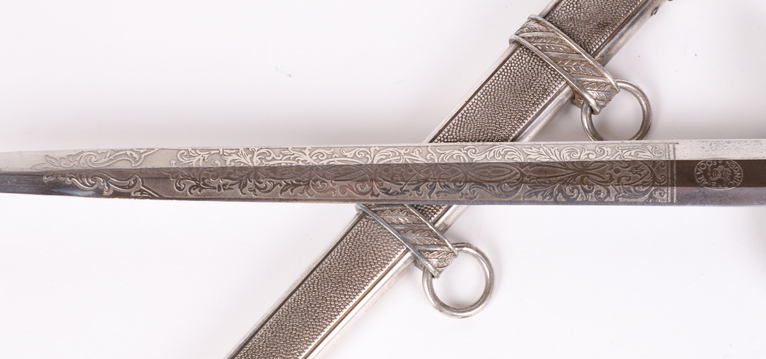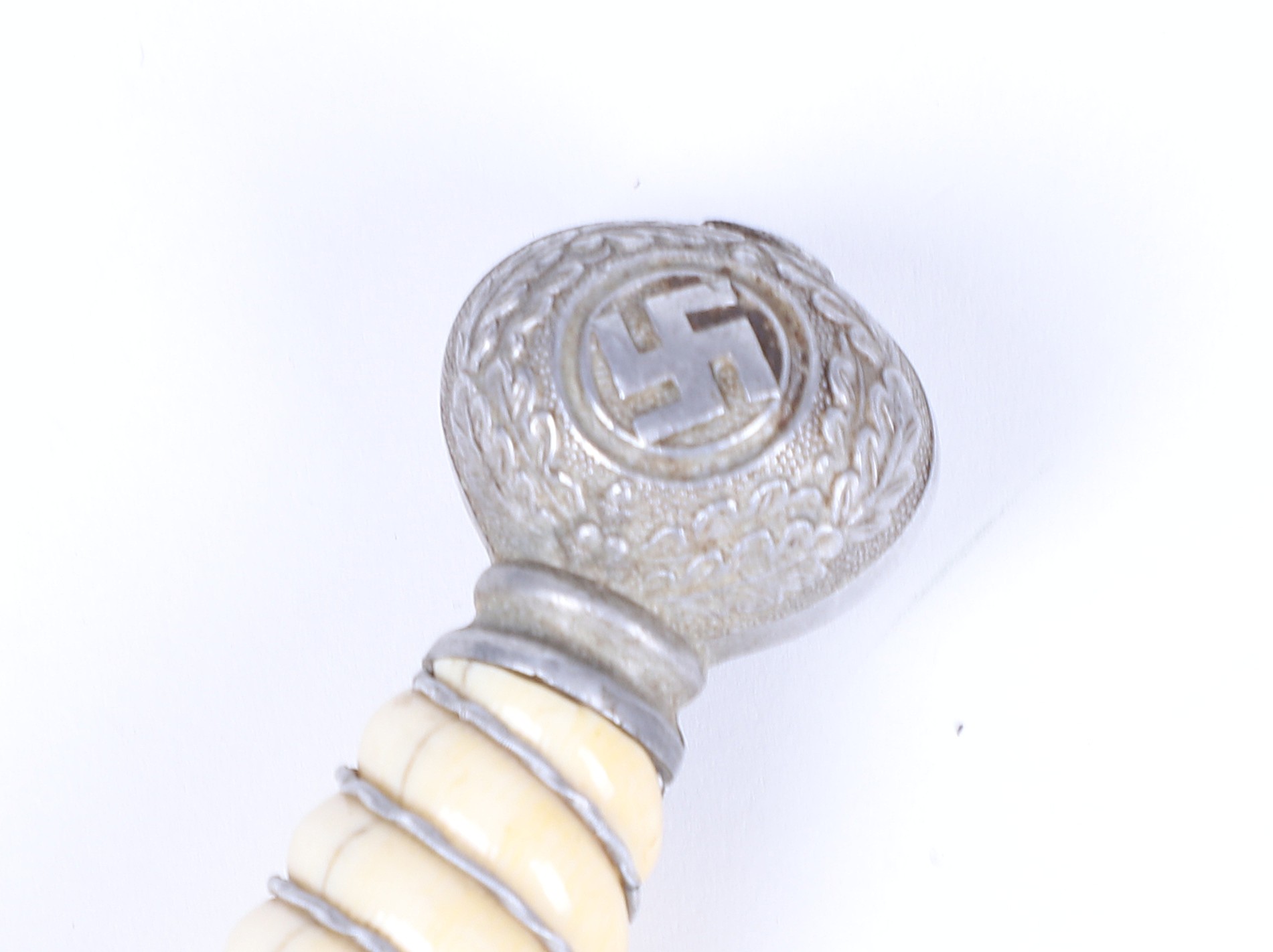 Very desirable engraved dagger made by Voos that features a real ivory grip. The grip has triple wire wrap and has a very nice grain to give this dagger a beautiful look. The blade has the standard Luft engraved panels and has a nice frosty finish to the background. The scabbard fits perfect and has shows nice detail and the piece comes with the original dagger knot.