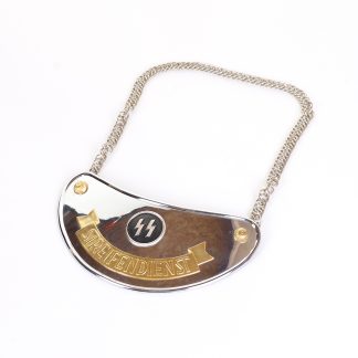 This veterans gorget was introduced in 1937 to the flag bearers of the old regiments. This gorget has a 50 over the veterans emblem signifying the number of years of service that that unit had. The enamel is perfect on the shield. The gold is excellent on the flags. The backplate is straight and true and the chain has 95% of its original gold. It has the original back cloth and it is marked on one of the tabs “3”.