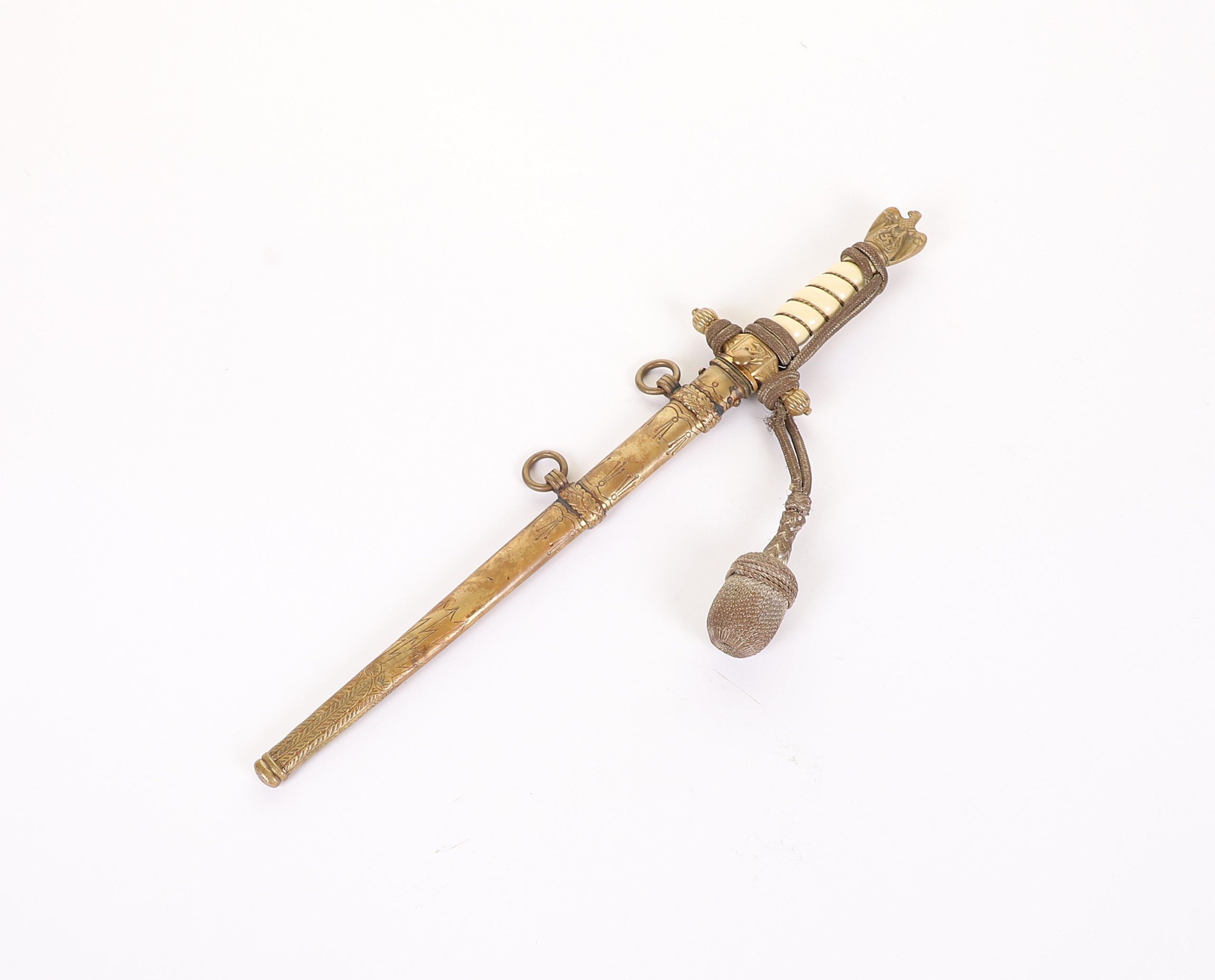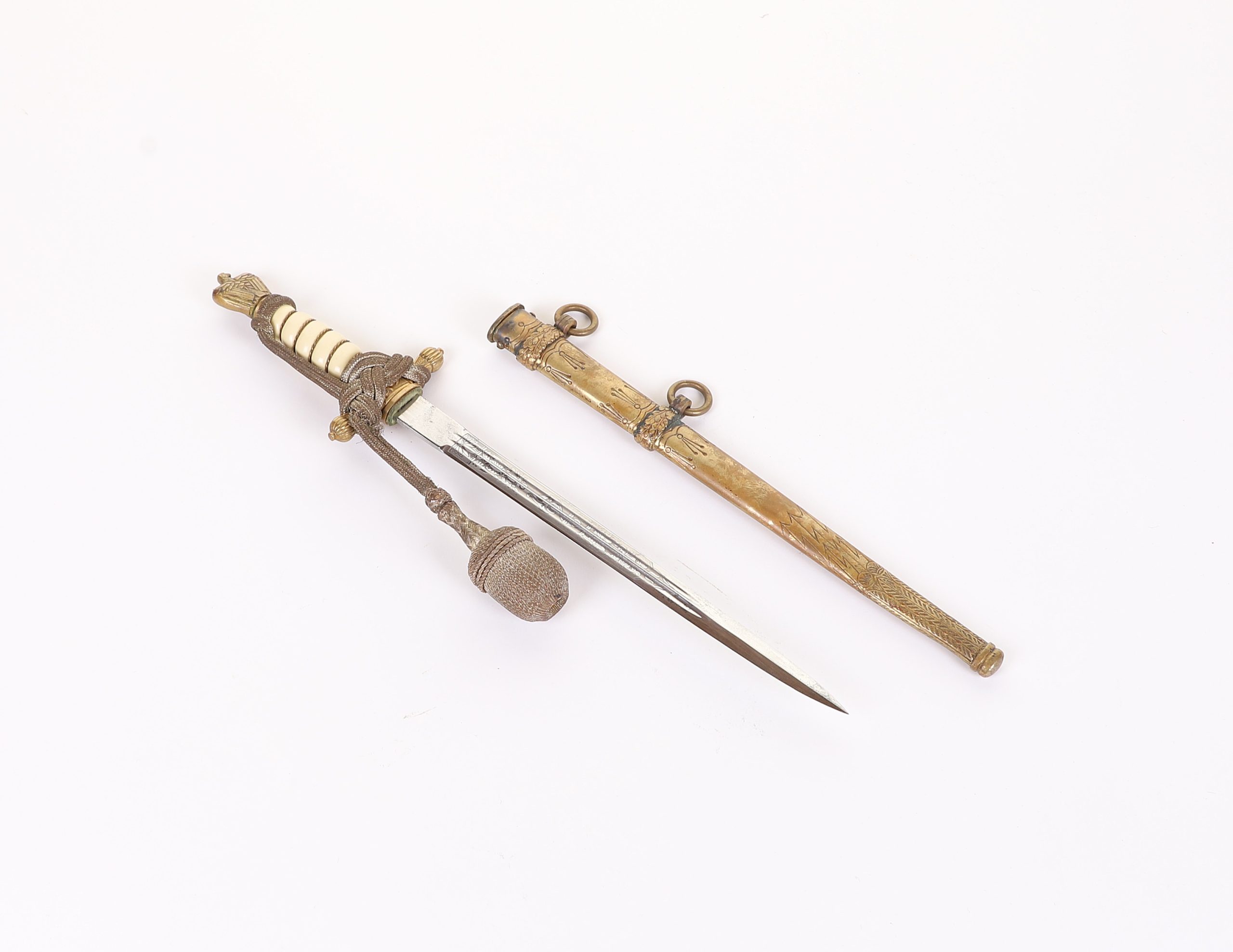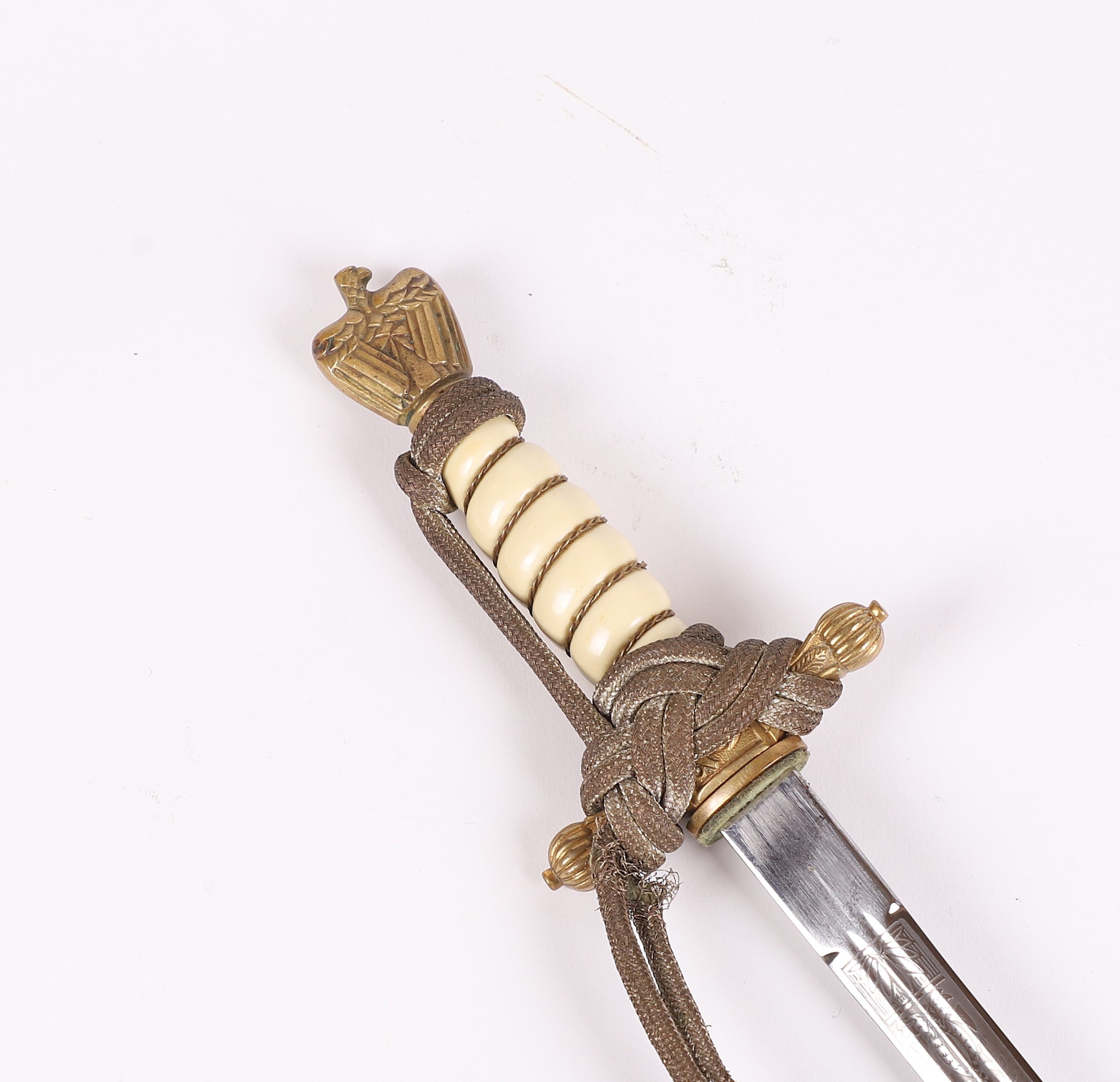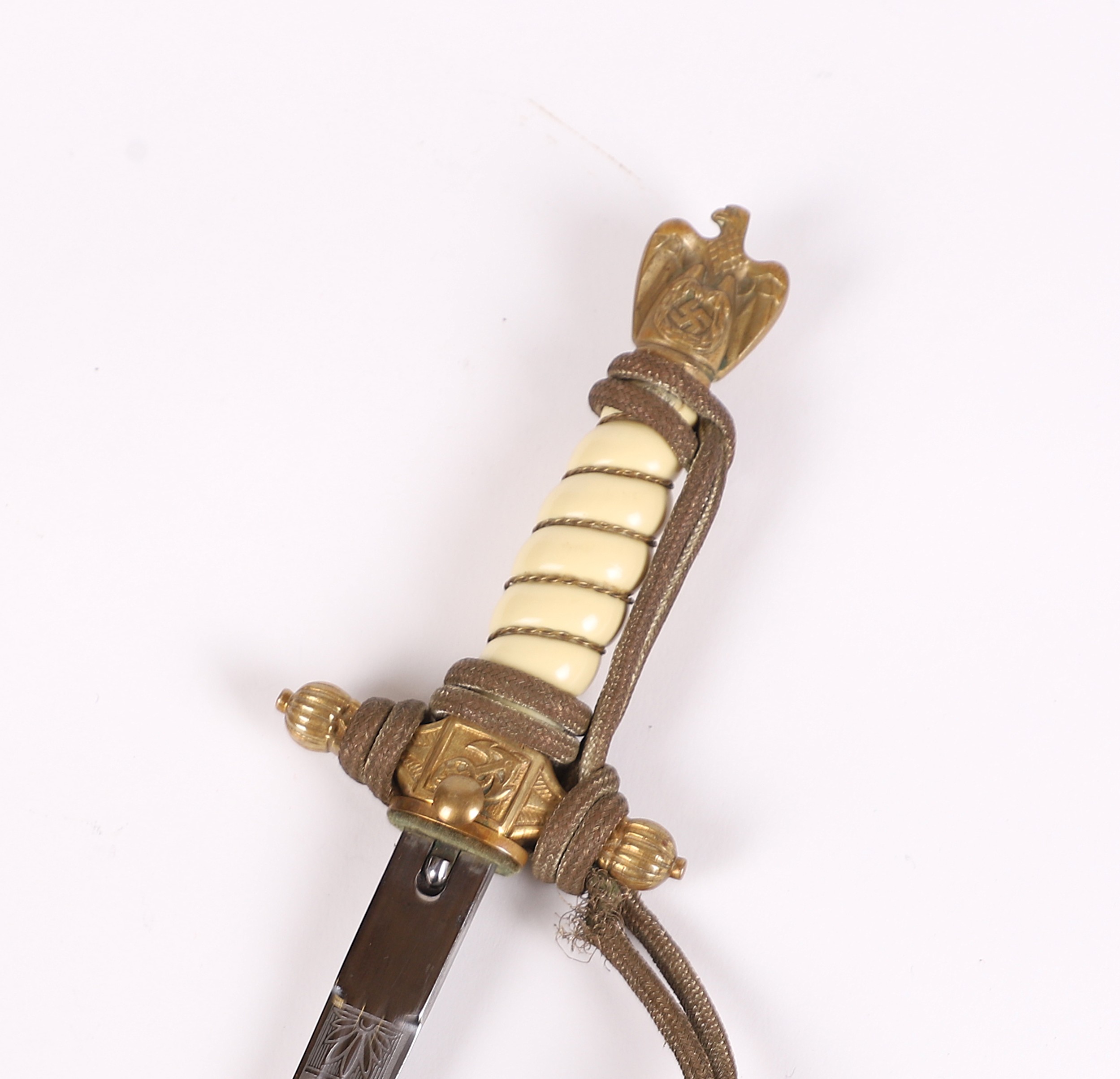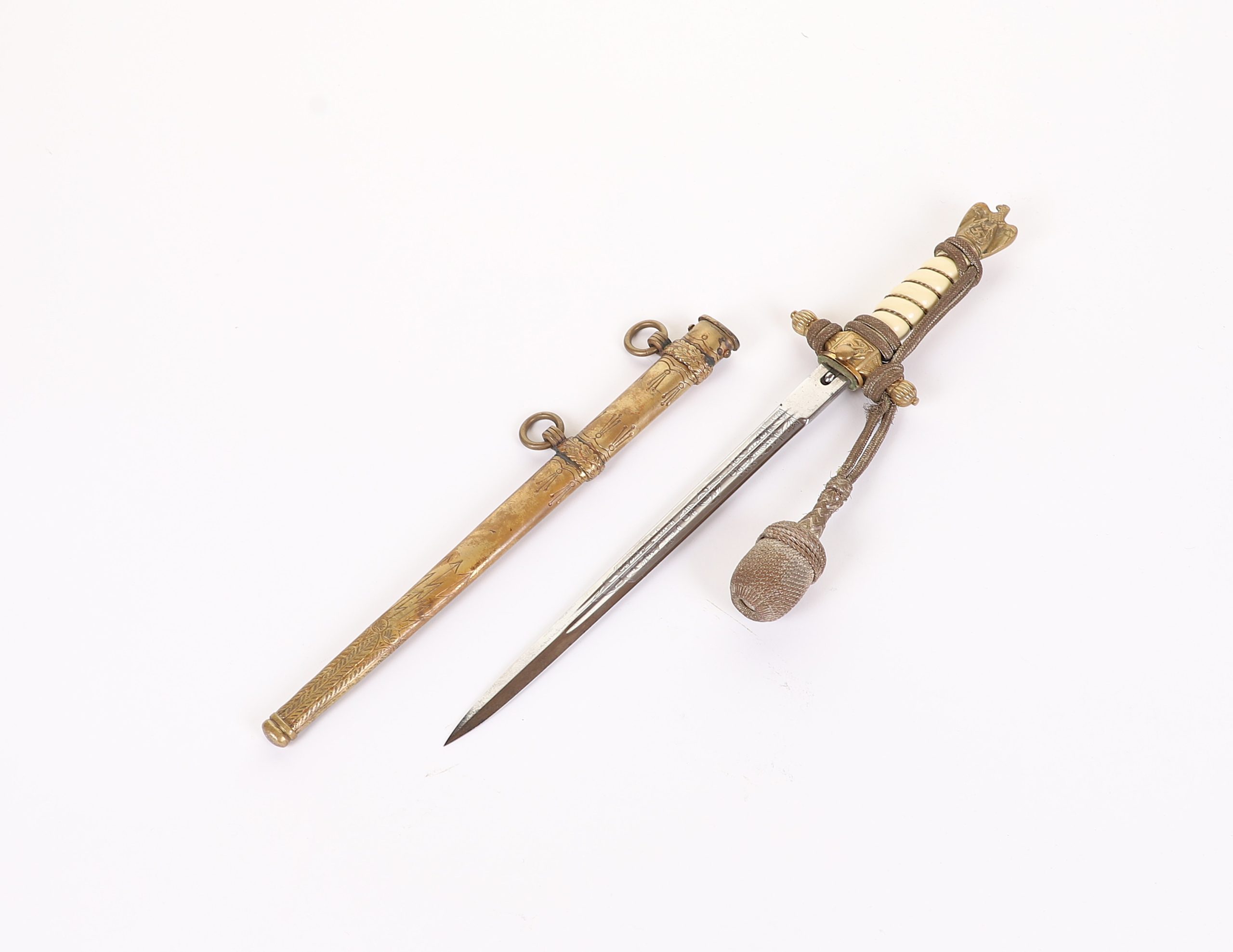 Clean overall dagger with the standard Naval engraved panels to each side. No maker mark at the base as well and shows a bright shiny finish. Grip is clean and is fitted in between a beautiful pommel and cross guard. Still has the original knot tied in the Naval style, though on backwards it has been there forever. Scabbard fits the piece perfect and shows minimal wear as well.
