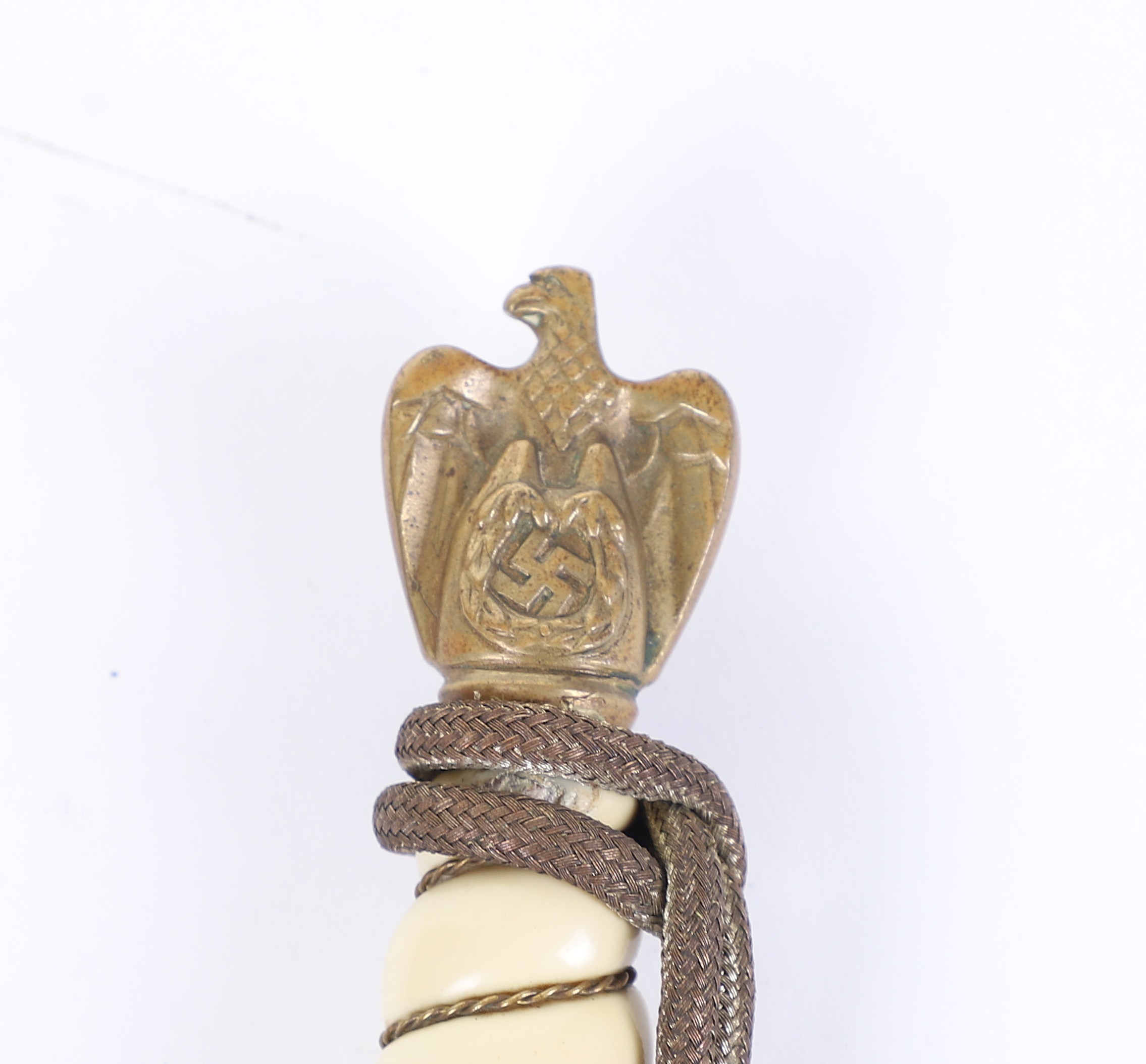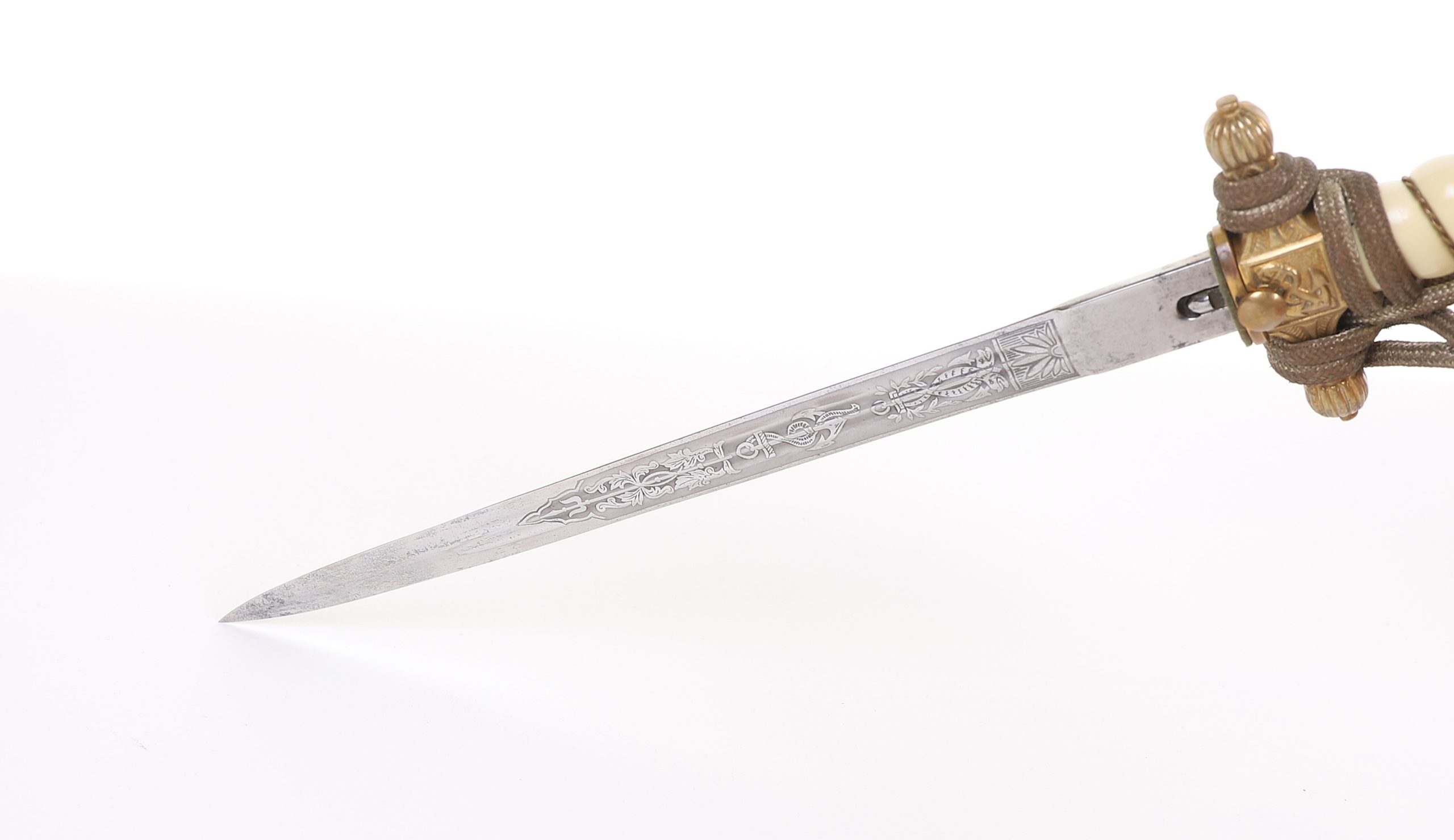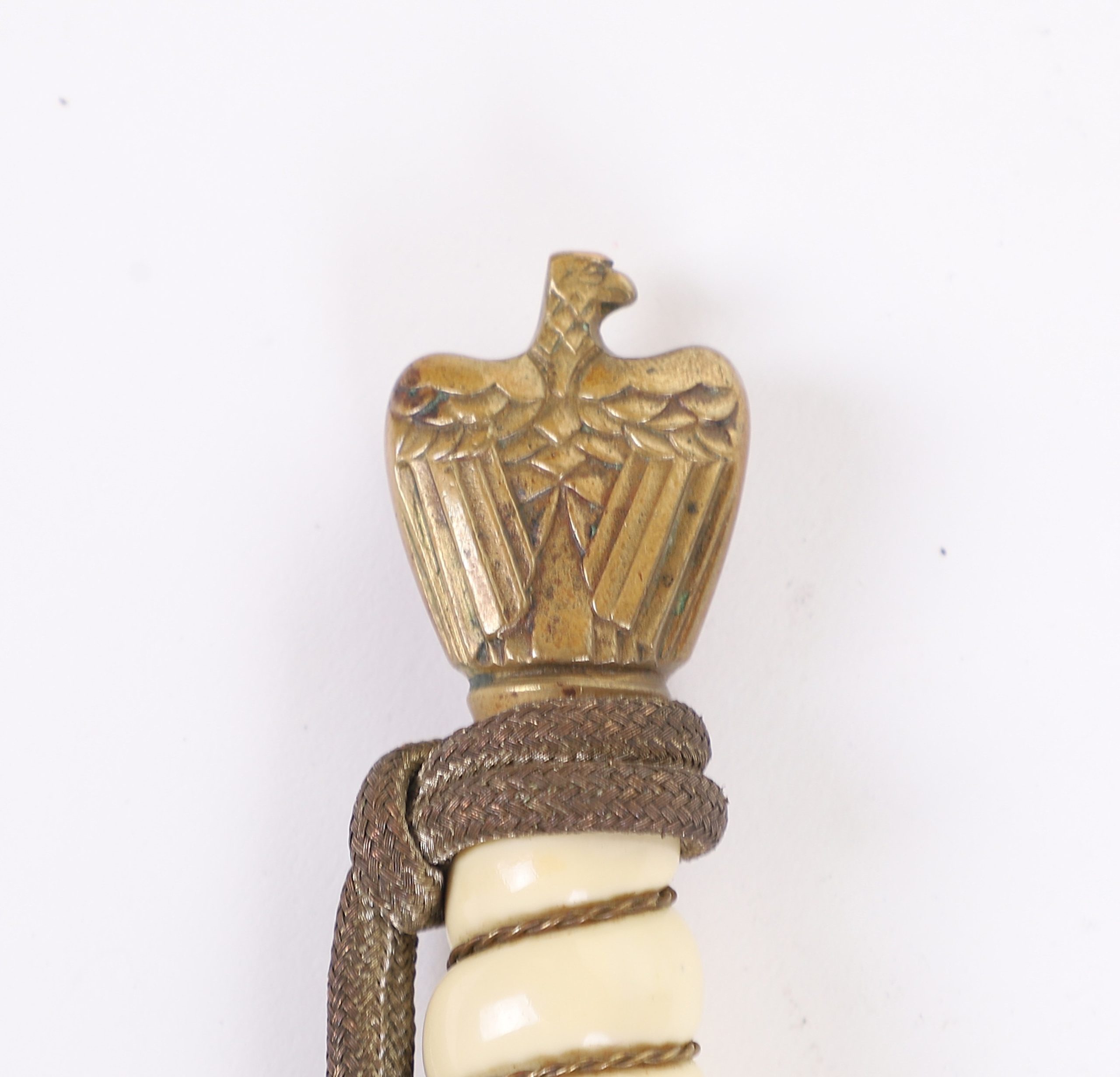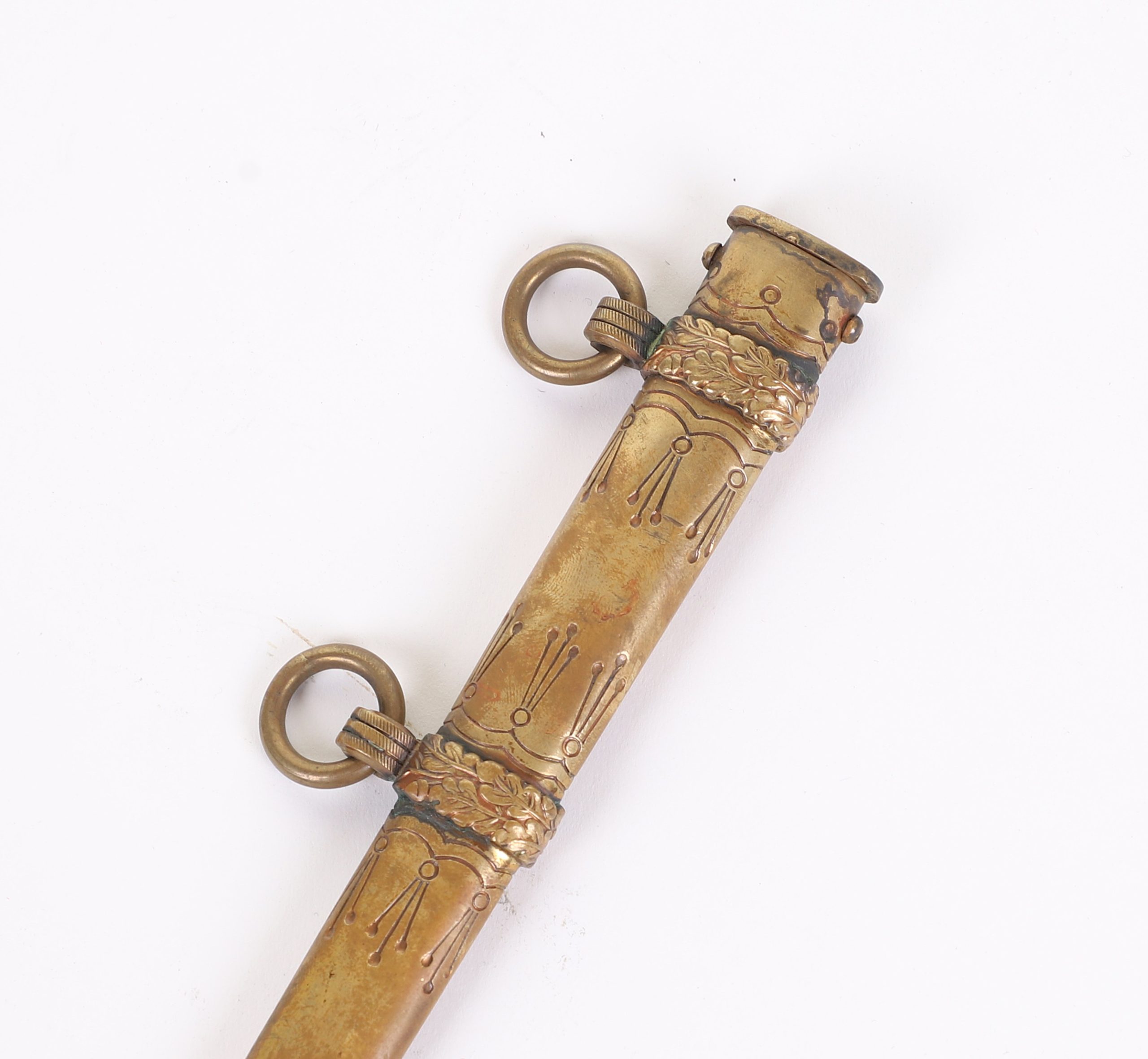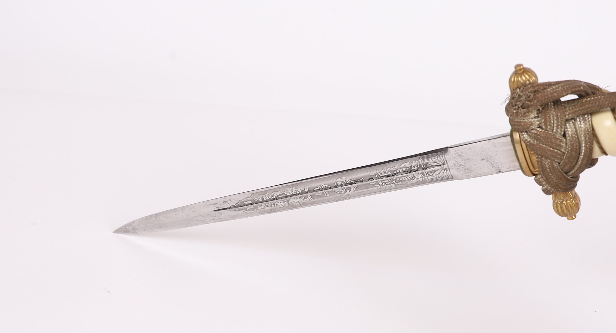 Clean overall dagger with the standard Naval engraved panels to each side. No maker mark at the base as well and shows a bright shiny finish. Grip is clean and is fitted in between a beautiful pommel and cross guard. Still has the original knot tied in the Naval style, though on backwards it has been there forever. Scabbard fits the piece perfect and shows minimal wear as well.