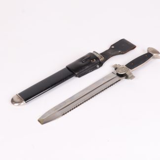 Beautiful condition on this Red Cross dagger with a clean blade that shows all cross grain and only a few spots. The grip has no cracks or chips, but does have a little fading to the orange color. Pommel is damage free and the cross guard near perfect. The scabbard is also very minty with only a few spots of lifting near the lower hanger attachment.