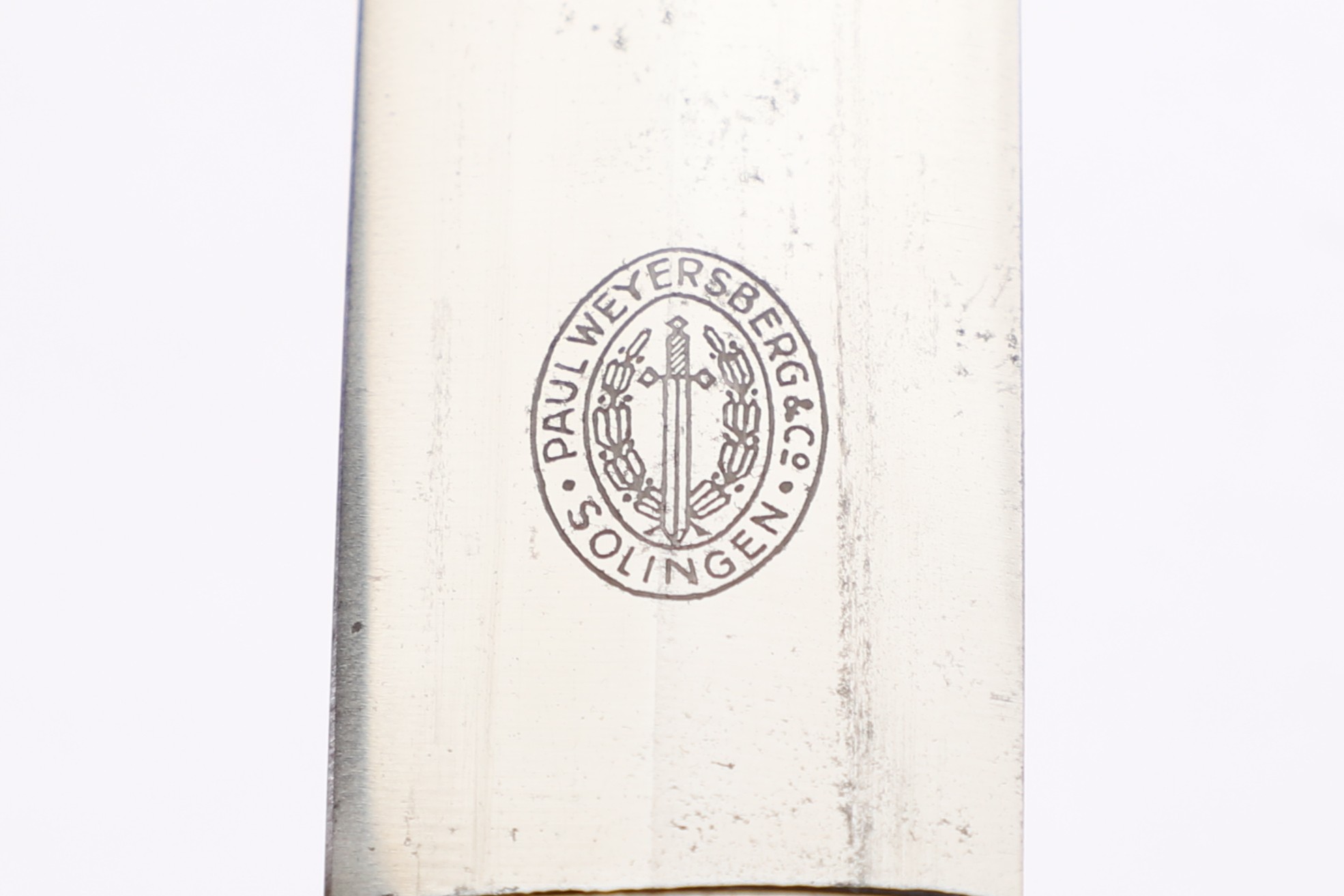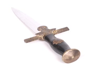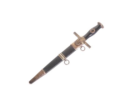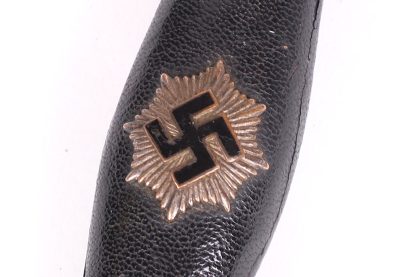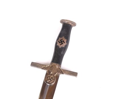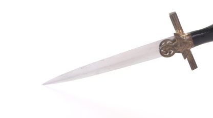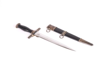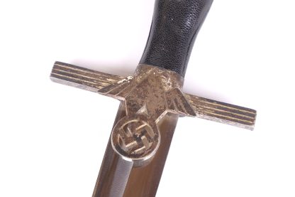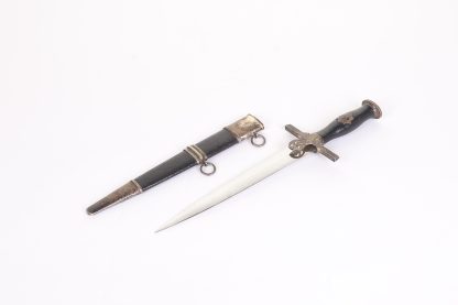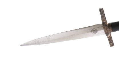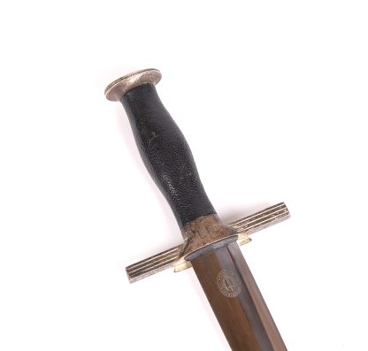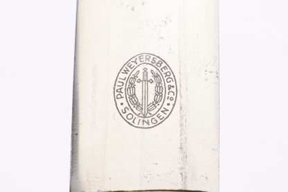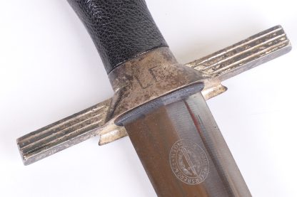 This dagger has been untouched, uncleaned and left in the exact condition it was found right out of the woodwork. Has a dark toning to the all fittings which really proves it has been tucked away for years. Blade is minty as well and shows all cross grain and a clean struck makers mark. Grip shows no damage and the RLB starburst has only a few minor scratches. At some point the original owner scratched his initials of LE on the back of the cross guard giving it a bit of personalization. Scabbard leather is clean with hardly any wear at all. Fine example in a condition that you rarely see.