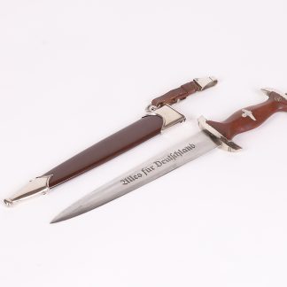 Absolutely beautiful dagger. This piece has a very clean blade showing all cross grain and a very dark burnishing to motto and maker mark. The guards are nickel silver models and have a tight fit to the grip. The grip itself has a very nice look with clean eagle and roundel and just a few nicks above the insignia. The scabbard fits the piece perfectly, has all screws shows most of the original lacquer finish. Comes with a perfect condition early model tab hanger. Fine example from JP Sauer.