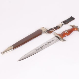 This dagger has a clean blade which only shows some normal runner wear. Has has nice motto and is clearly marked RZM M7/12. The grip is very nice and has a dark line that runs through the left of the eagle on both sides almost like it is part of the grain in the wood. The scabbard is near perfect and fits nicely to the guard.