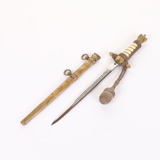 The blade on the dagger shows all cross graing and 98% of its original burnishing. Fits tight to the cross guard and the grip fits tightly to the upper and lower guards. Has aluminum eagle and original paint to scabbard. There is slight wear to the reverse of the dagger where it would have rubbed against uniform. It has the original tag hanger, which is SS proofed on reverse side.