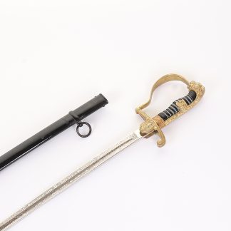 The exterior of this piece is in near mint overall condition. Retains nearly 100% of the original gold and the hilt is deeply chiseled with an ornate back strap of shields and trumpets. The lion head pommel shows the same excellent detail and has two beautiful red ruby eyes. The grip has no cracks and no chips and the original sword knot is still in tie. The real rarity of this piece is the blade which is bright, straight and features an art deco style triple engraving. Has a heavy chiseled oak leaf and acorn motif sporting a machine gun crew on one side. On the reverse it shows a sword and shovel and the bust profile of a soldier. Also shows an 88 anti-aircraft unit with a paratrooper jumping out of an airplane. You do not see this type of engraving very often and it really puts this sword in another level of rarity.