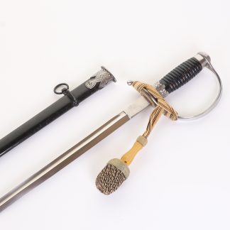 The exterior of this piece is in near mint overall condition. Retains nearly 100% of the original gold and the hilt is deeply chiseled with an ornate back strap of shields and trumpets. The lion head pommel shows the same excellent detail and has two beautiful red ruby eyes. The grip has no cracks and no chips and the original sword knot is still in tie. The real rarity of this piece is the blade which is bright, straight and features an art deco style triple engraving. Has a heavy chiseled oak leaf and acorn motif sporting a machine gun crew on one side. On the reverse it shows a sword and shovel and the bust profile of a soldier. Also shows an 88 anti-aircraft unit with a paratrooper jumping out of an airplane. You do not see this type of engraving very often and it really puts this sword in another level of rarity.